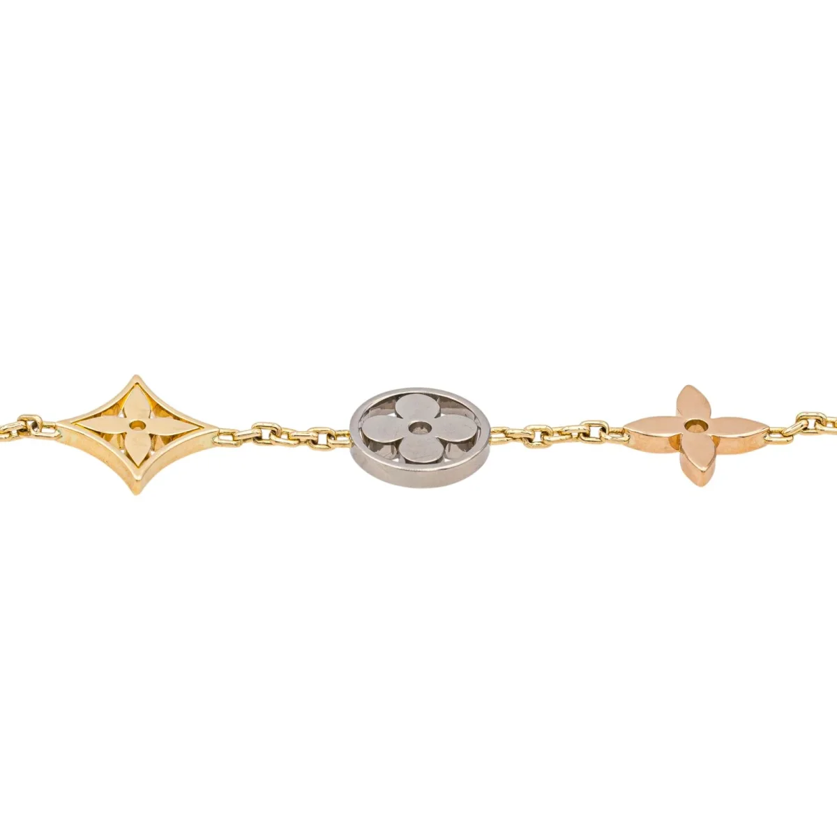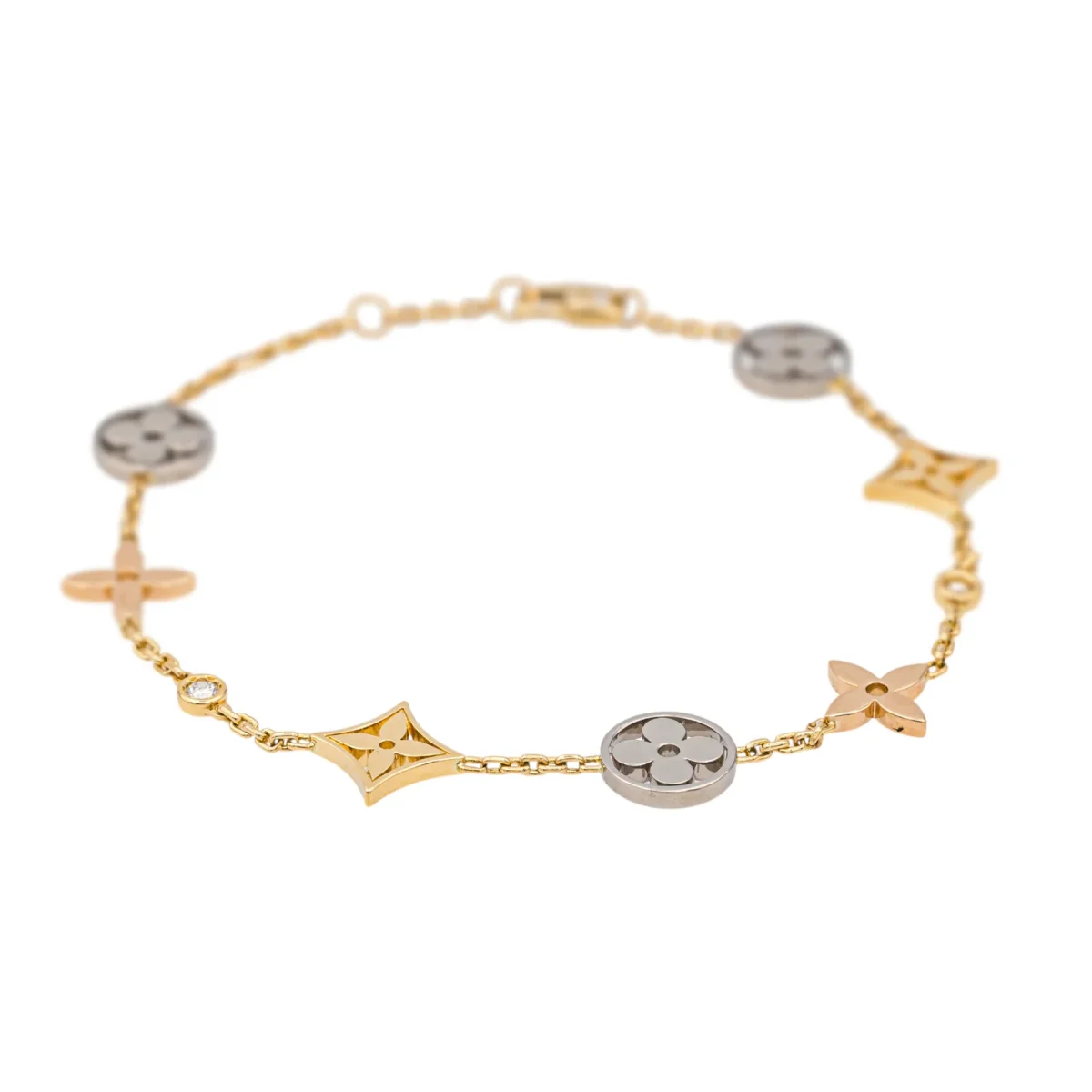 Bracelet signé de la Maison Louis Vuitton, modèle Blossom, fleurs monogram, en or jaune, blanc et rose 750 millièmes (18 carats), 7 motifs, sertie de deux diamants taille brillant, environ F-G/ VVS pour un total d’environ 0,07 ct, longueur: 17,5 cm avec anneaux intermédiaire à 16,5 cm et à 15,5 cm, poids total: 7,15 g, vendu avec écrin d’origine, poinçon tête d’aigle, numéroté: A50138, excellent état