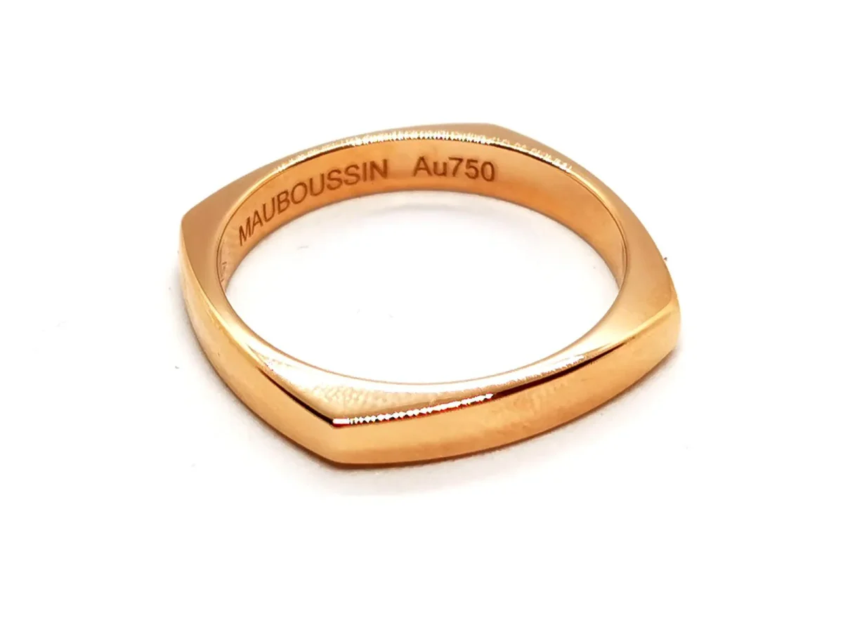 Alliance signée de la maison Mauboussin, collection: Odéon d’amour, en or rose 750 millièmes (18 carats), tour de doigt: 61, largeur: 0,32 cm, poids total: 6,04 g, poinçon tête d’aigle, prix neuf: 900€, excellent état