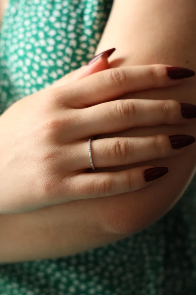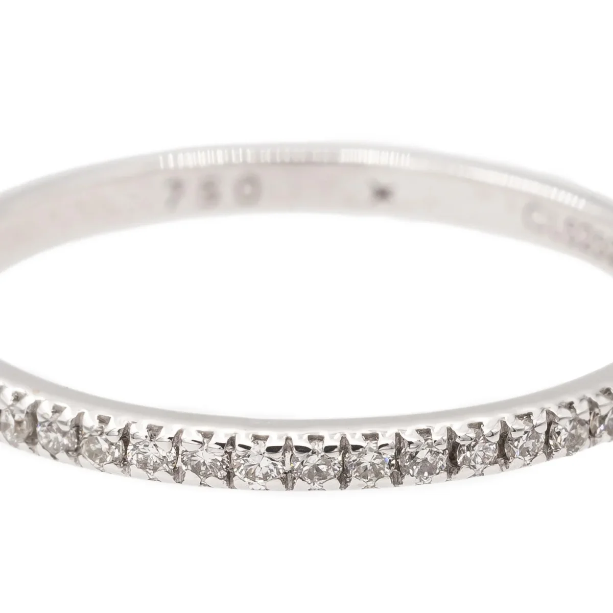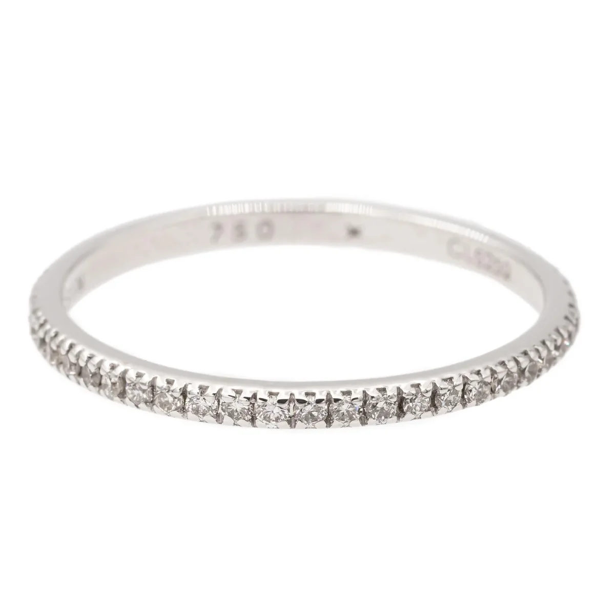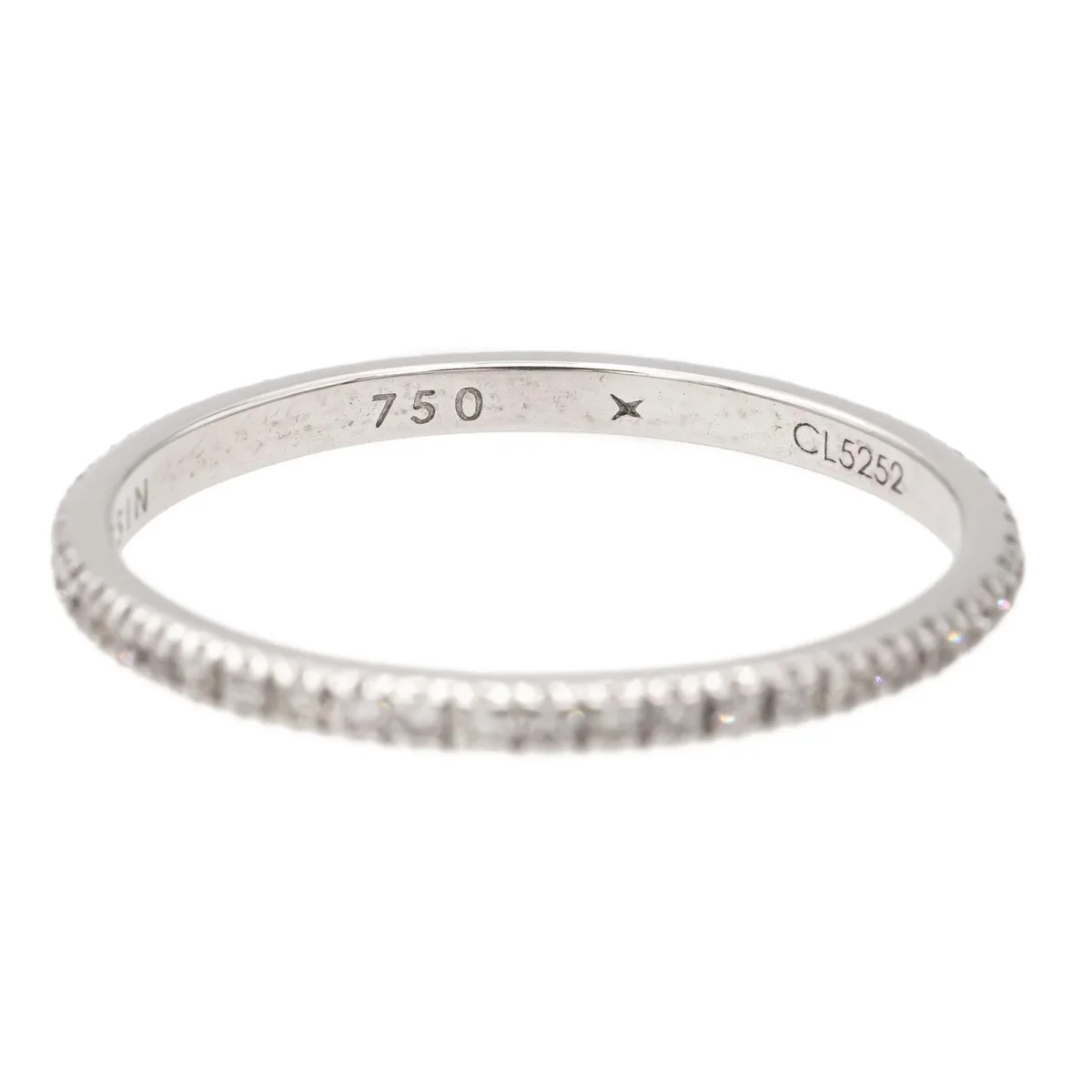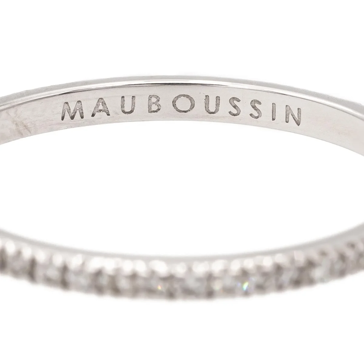 Alliance signée de la Maison Mauboussin, model Parce que je l’aime, en or blanc 750 millièmes (18 carats) testé, sertie de diamants taille brillant H/SI, d’environ 0,005 ct chacun, poids total diamants: environ 0,25 ct, largeur sur le dessus: 0,16 cm, tour de doigt: 51, poids total: 1,03 g, numérotée: CL5252, valeur neuve: 1335€, excellent état