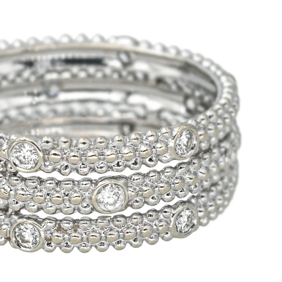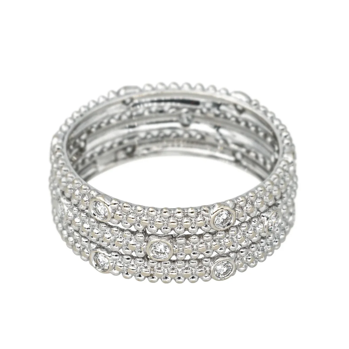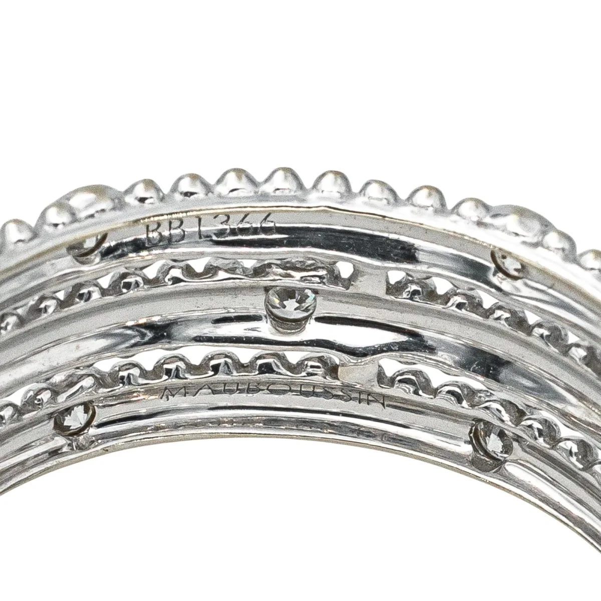 Bague bandeau signée de la Maison Mauboussin en or blanc 750 millièmes (18 carats) testé, modèle Le Premier Jour, pavée de diamants, 17 diamants taille brillant, environ H-VS, d’un poids total d’environ 0,34 ct, (chaque diamant d’un poids d’environ 0,02 ct), largeur sur le dessus : 0,71 cm, tour de doigt : 53, poids total : 3,37 g, numérotée : BB1366, excellent état