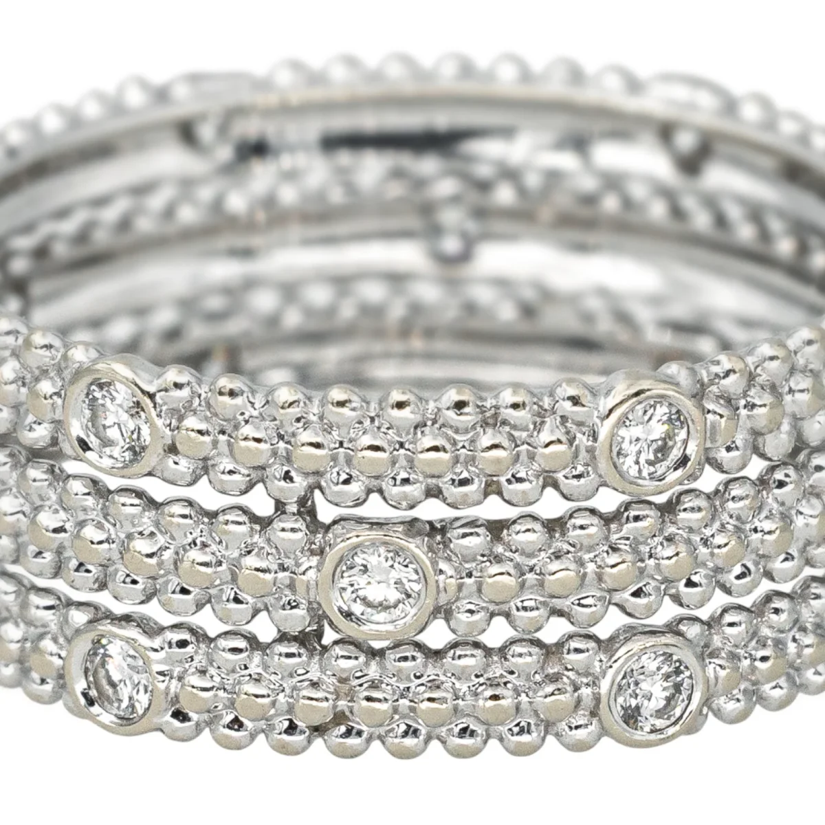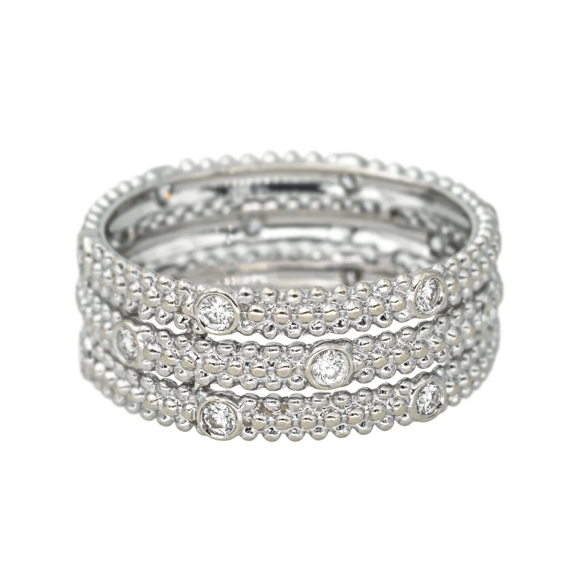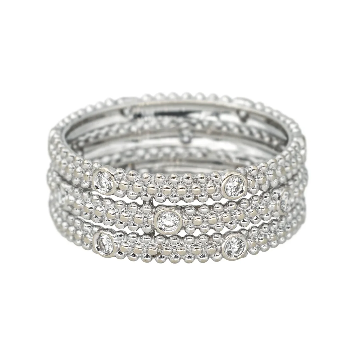 Bague bandeau signée de la Maison Mauboussin en or blanc 750 millièmes (18 carats) testé, modèle Le Premier Jour, pavée de diamants, 17 diamants taille brillant, environ H-VS, d’un poids total d’environ 0,34 ct, (chaque diamant d’un poids d’environ 0,02 ct), largeur sur le dessus : 0,71 cm, tour de doigt : 53, poids total : 3,37 g, numérotée : BB1366, excellent état