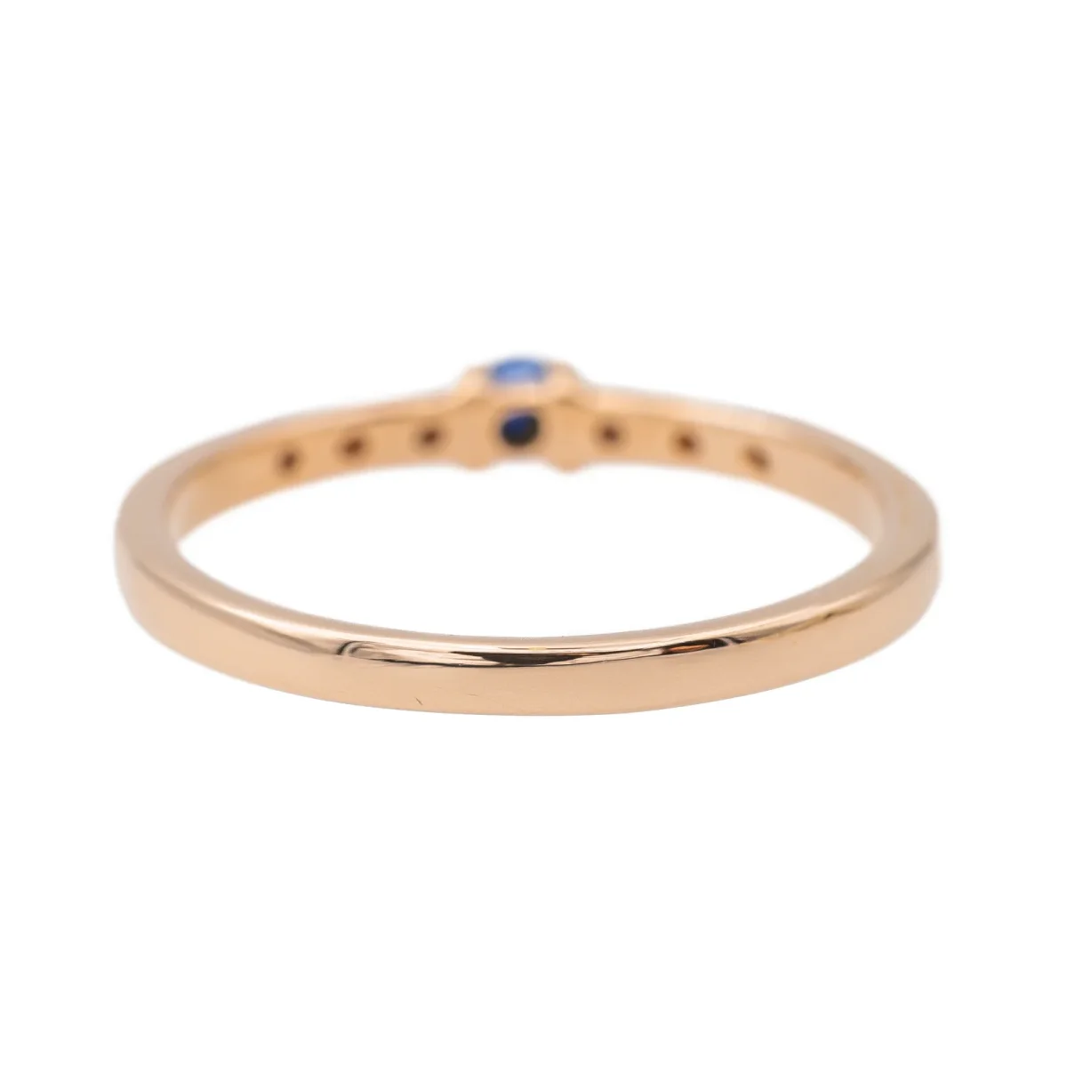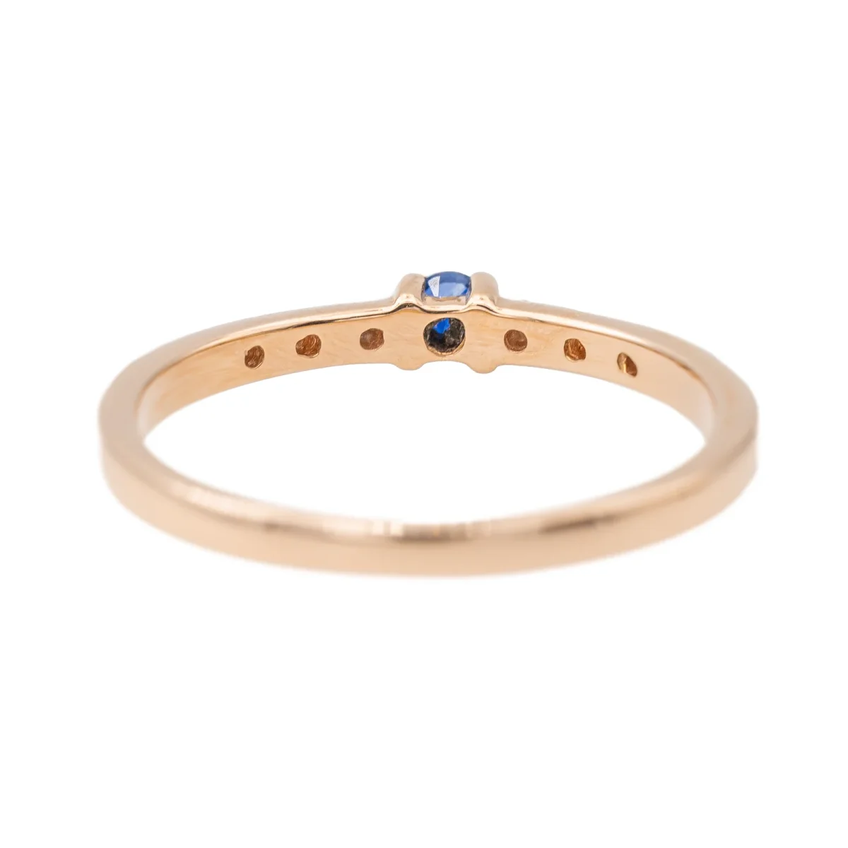 Bague signée de la Maison Mauboussin en or rose 750 millièmes (18 carats), modèle Capsule d’émotion, sertie d’un saphir et de diamants, un saphir taille rond, d’un poids total d’environ : 0,06 ct, 6 diamants taille brillant, environ H-SI, d’un poids total d’environ 0,024 ct, (chaque diamant d’un poids d’environ 0,004 ct), largeur sur le dessus : 0,27 cm, tour de doigt : 52, poids total : 2,04 g, poinçon tête d’aigle, numérotée : DI3967, excellent état
