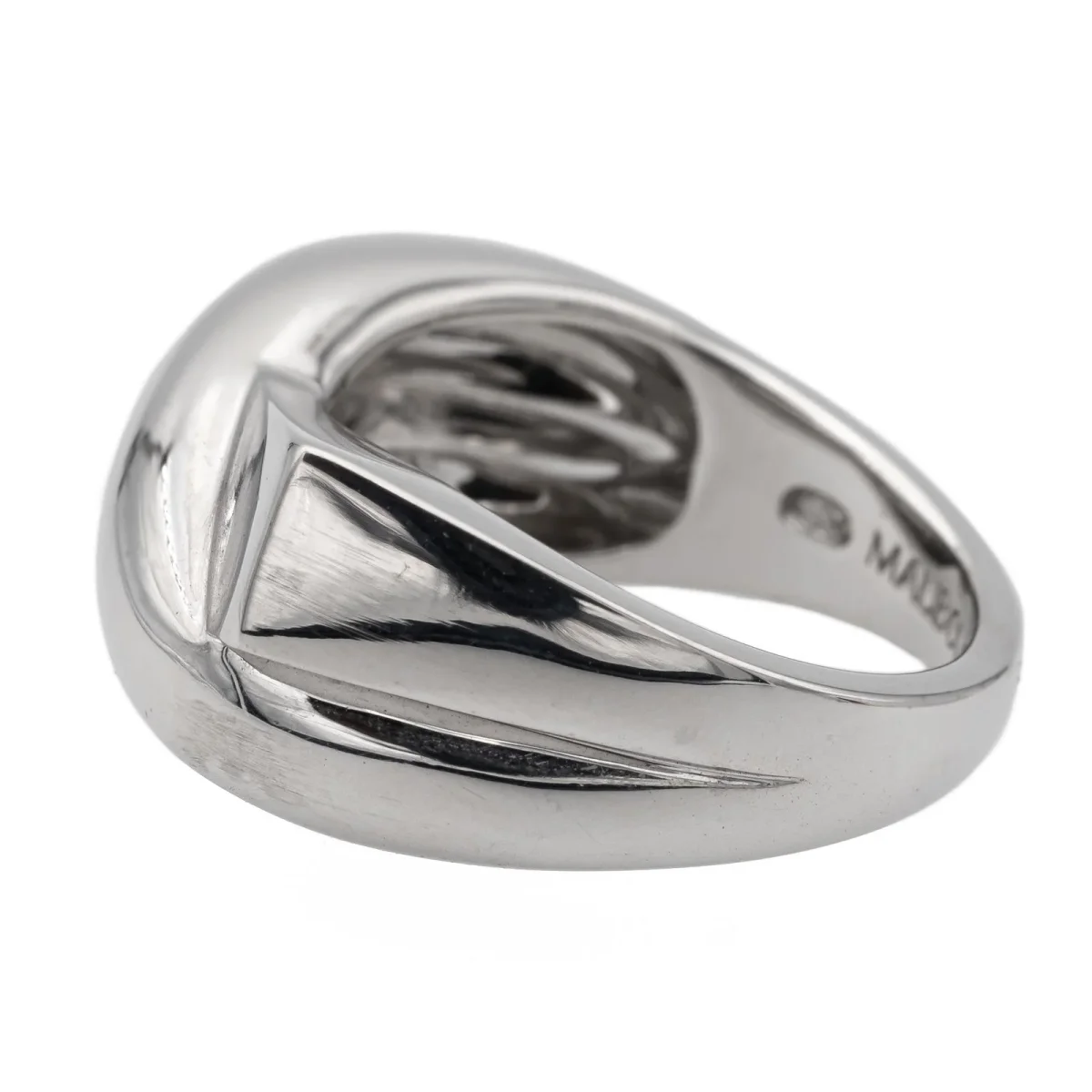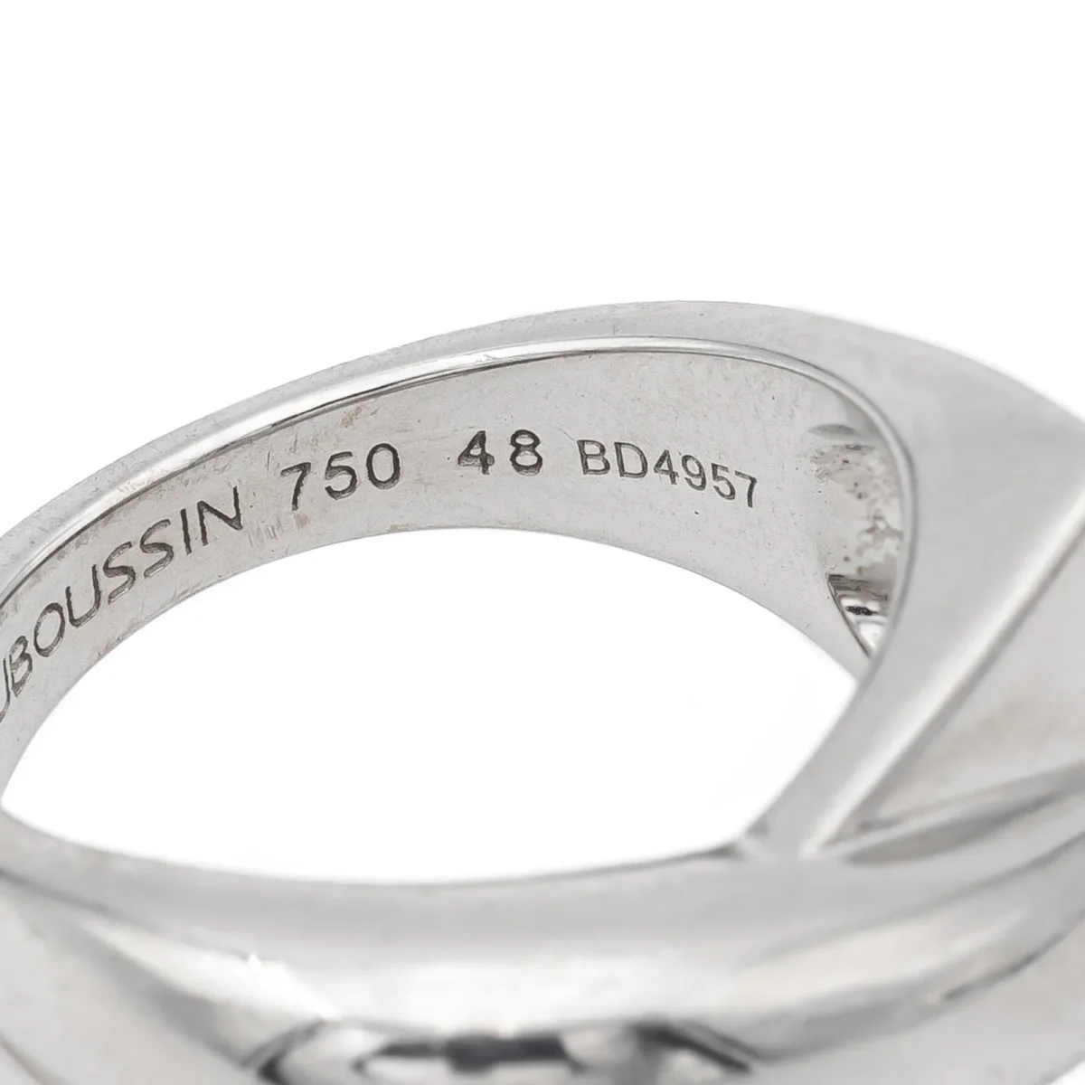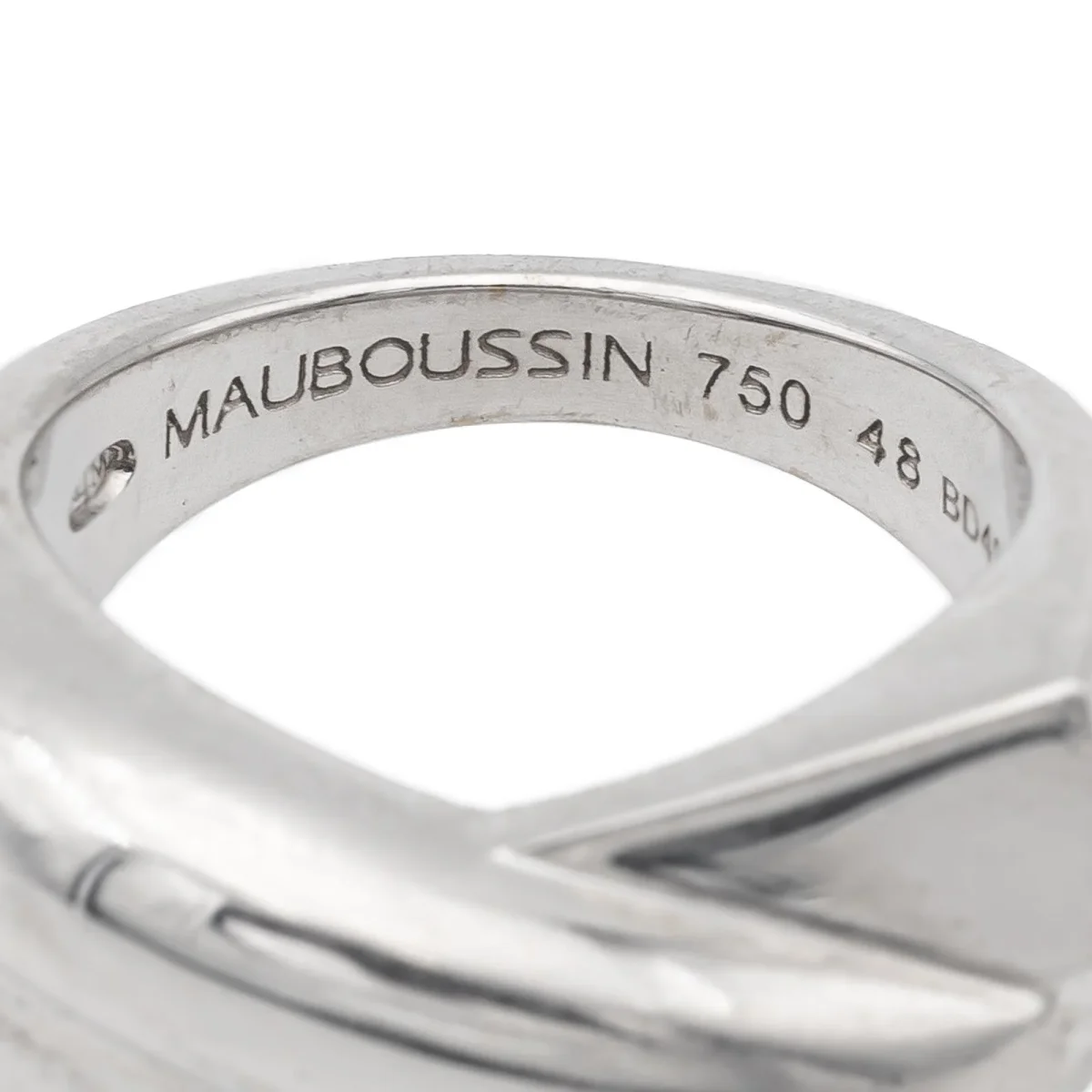 Bague signée de la maison Mauboussin, collection « en corps et encore », en or blanc 750 millièmes (18 carats), tour de doigt: 48, largeur sur le dessus: 0,55 cm, largeur sur le coté: 0,85 cm, poids total: 7,13 g, poinçonné et numérotée: BD4957, prix neuf: 1900€
