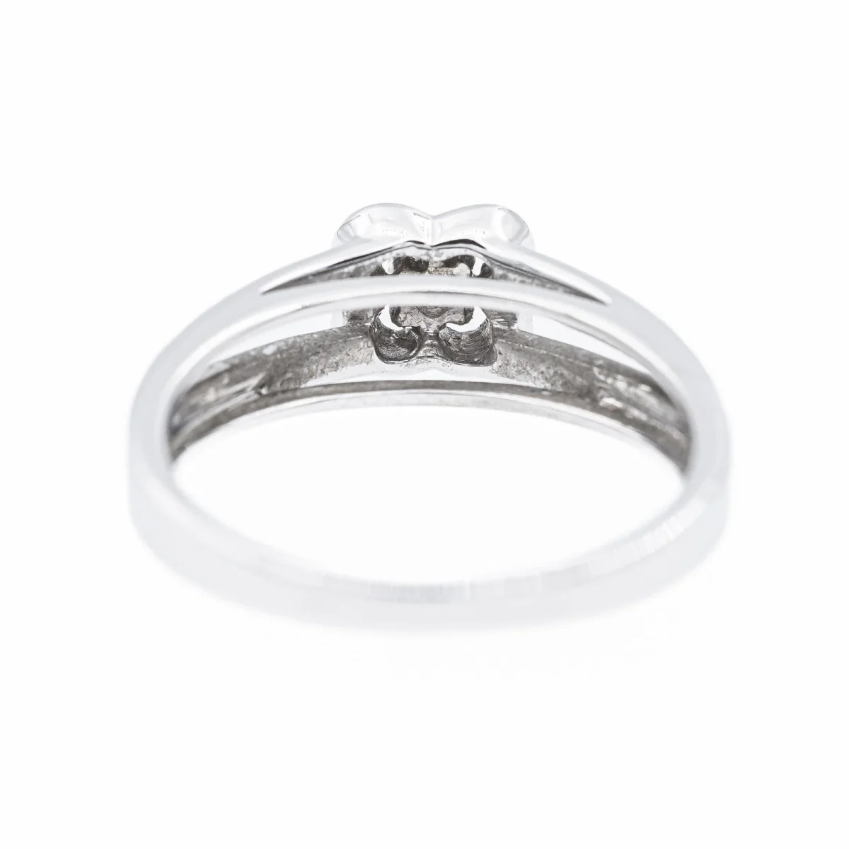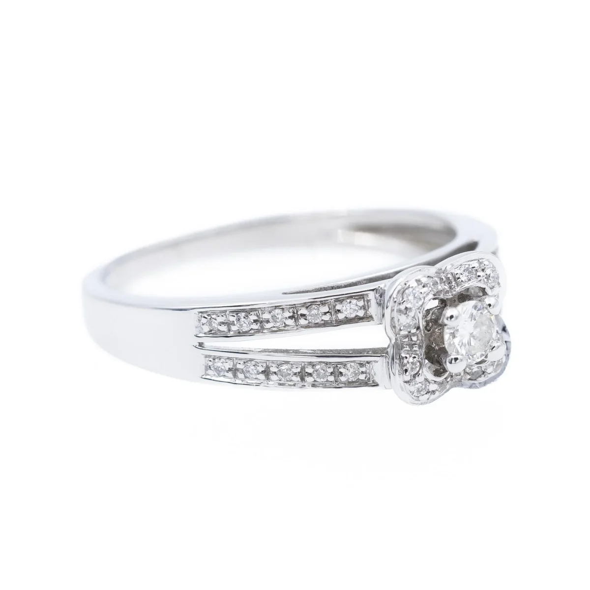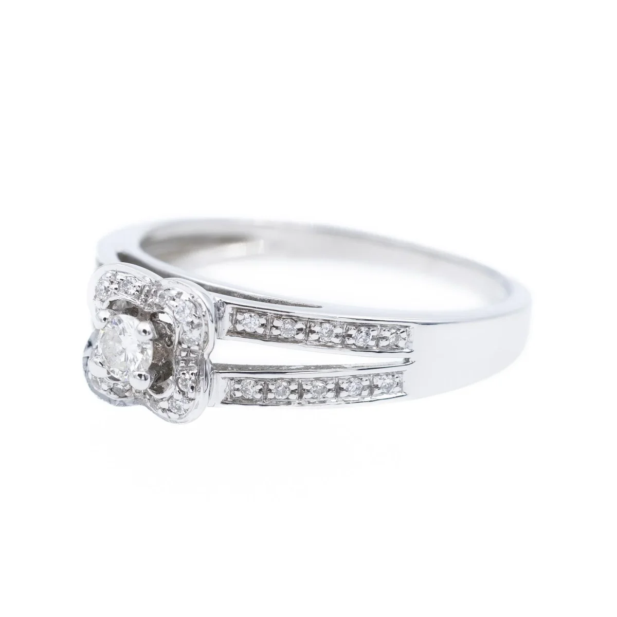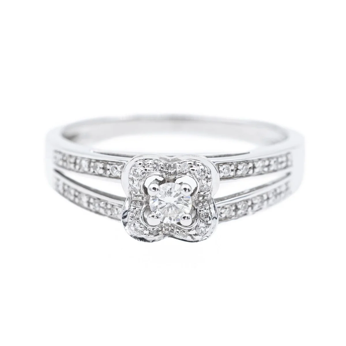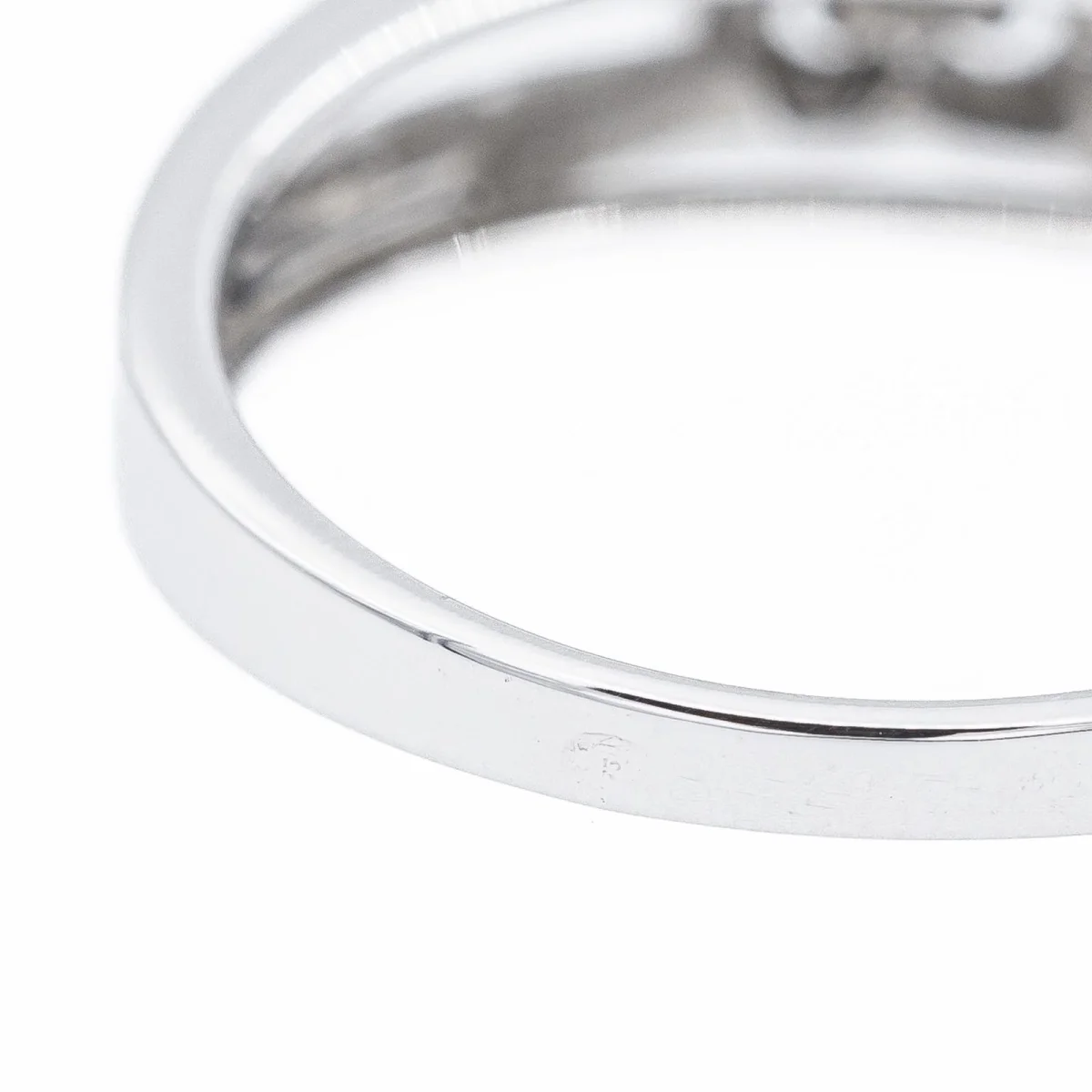Bague signée de la Maison Mauboussin en or blanc 750 millièmes (18 carats), Modèle Chance of Love, sertie d’un diamant central taille brillant, estimé H/SI, environ 0,10 ct, ainsi que d’un pavage de 20 diamants estimés H/SI, environ 0,005 ct chacun, poids total estimé des diamants: 0,20 ct, Tour de doigt: 51, Largeur : 0,62 cm, numéroté AC3949B, Poids total: 3,11 g, Poinçon tête d’aigle, Prix neuf: 1260 €, Excellent état