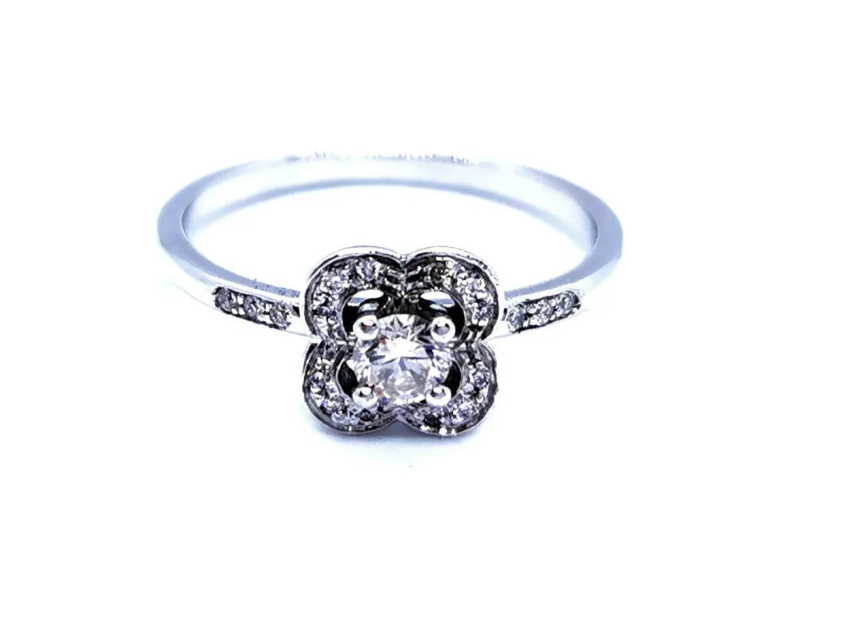 Bague signée de la maison Mauboussin, en or blanc 750 millièmes (18 carats) testé, collection Chance Super One, diamant central taille brillant H-SI d’environ 0,14 ct, pavage de 18 diamants taille brillant H-SI pour environ 0,08 ct au total, poids total diamants: environ 0,22 ct, taille: 52, dimensions fleur sur le dessus: 0,74 cm x 0,74 cm, poids total: 2,71 g, signée et numérotée: DA9889, excellent état, prix neuf: 935€