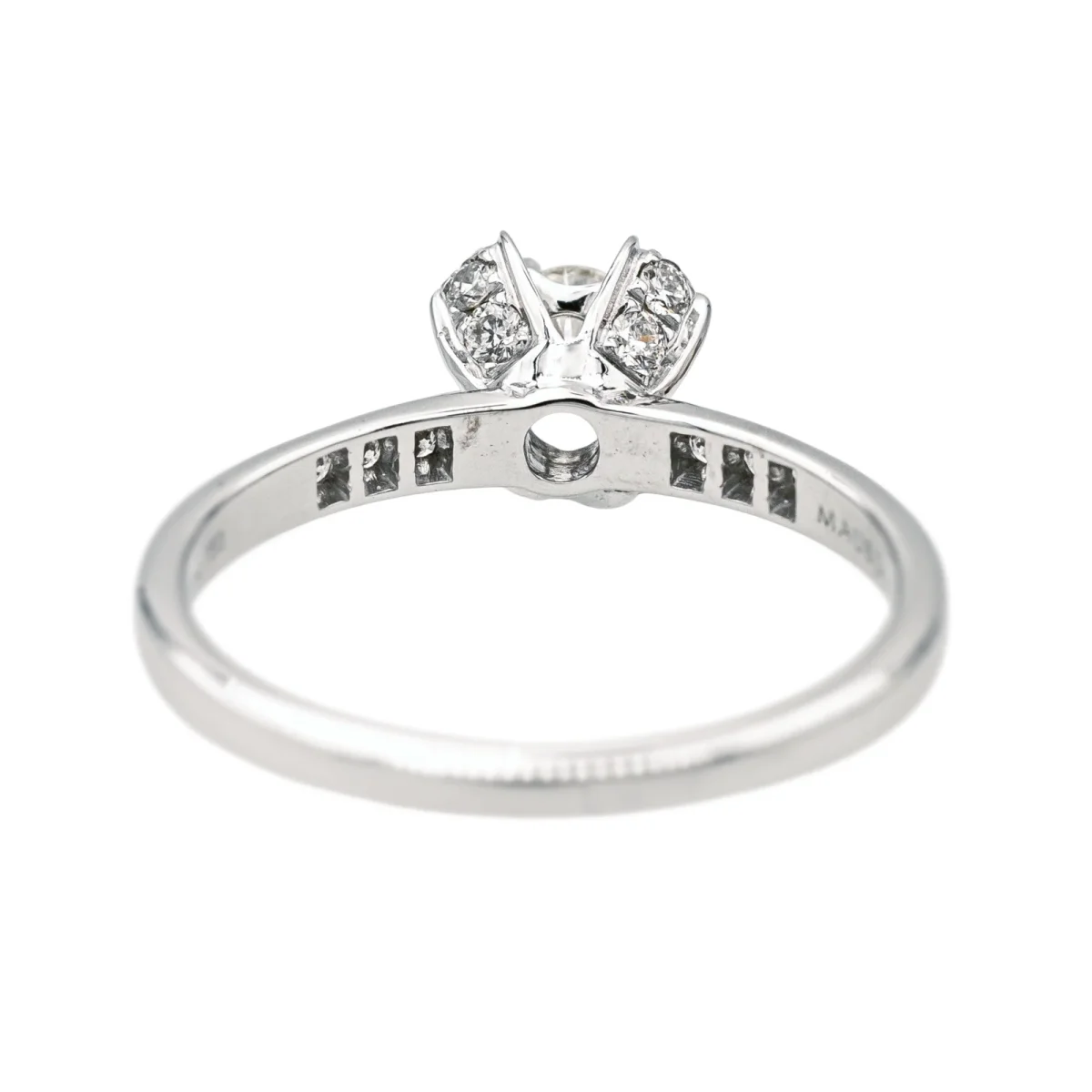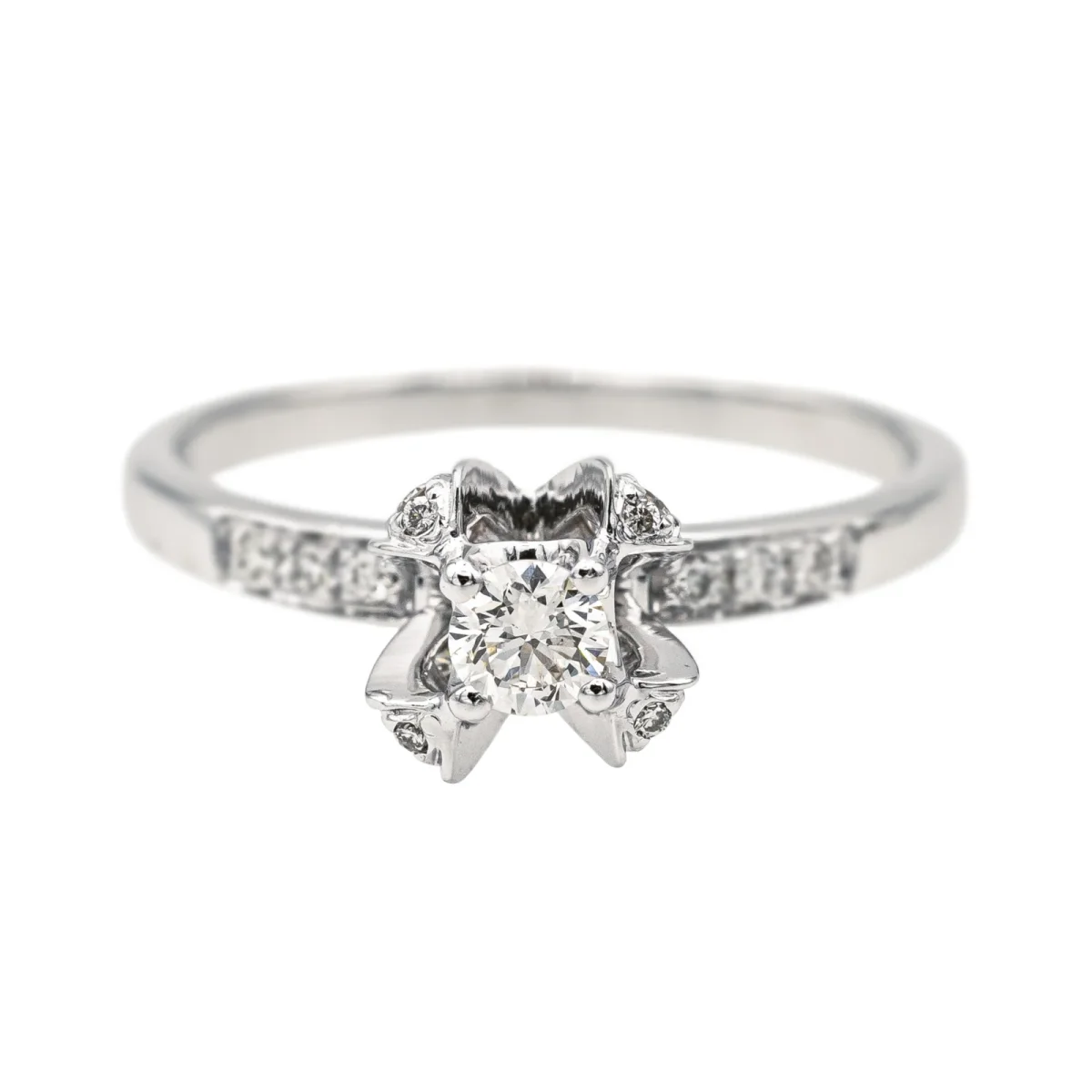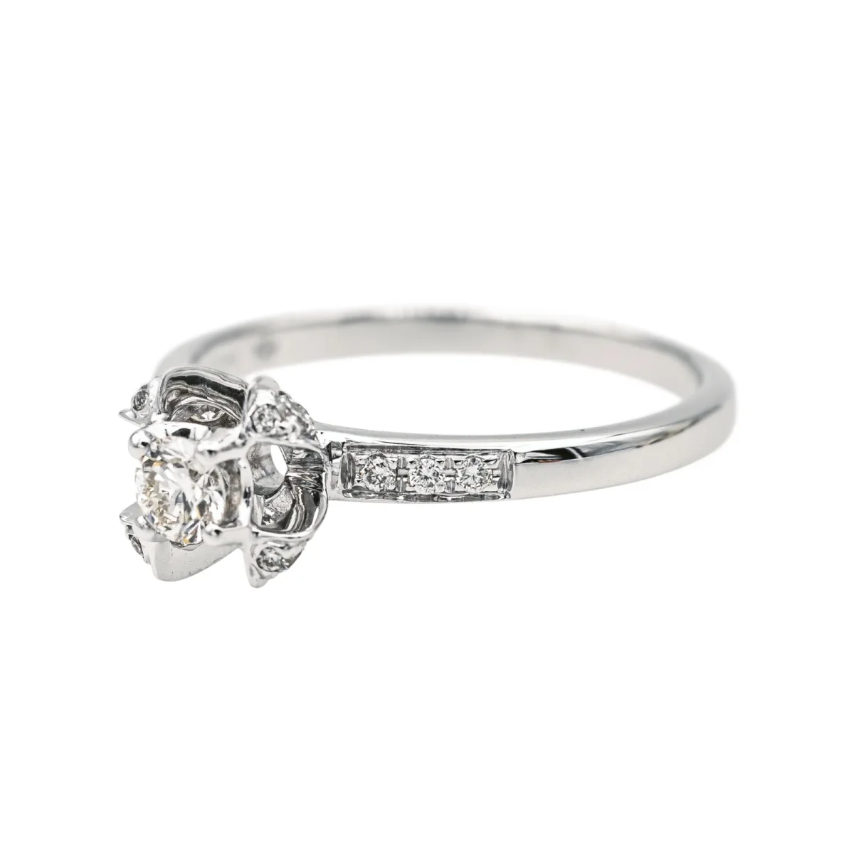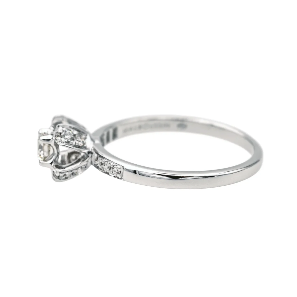 Bague solitaire signée de la Maison Mauboussin en or blanc 750 millièmes (18 carats), modèle Sacré Désir N°2, sertie de 19 diamants taille brillant, environ H-VS, d’un poids total d’environ 0,24 ct, (un diamant d’un poids d’environ 0,15 ct, et 18 diamants d’un poids d’environ 0,005 ct), largeur sur le dessus : 0,72 cm, tour de doigt : 54, poids total : 2,59 g, numérotée : FC4028, poinçon tête d’aigle, excellent état