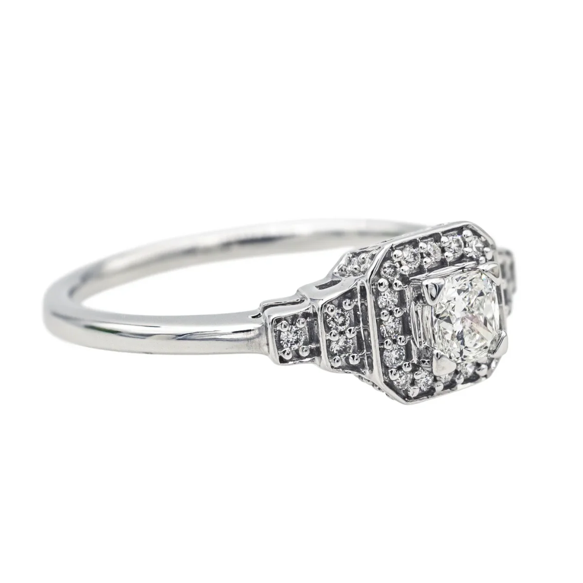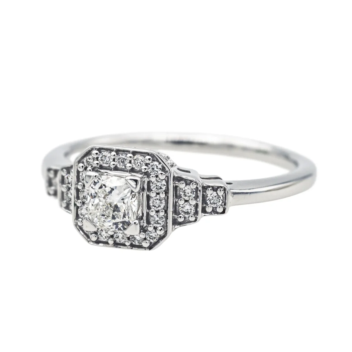 Bague solitaire signée de la Maison Mauboussin en or blanc 750 millièmes (18 carats), modèle Un Automne 1930 n°2, sertie de diamants, 1 diamant taille brillant,environ H-SI d’un poids total d’environ 0,18 ct, entouré de 30 diamants taille brillant, environ H-SI, d’un poids total d’environ 0,12 ct, (chaque diamant d’un poids d’environ 0,004 ct), poids total diamants environ : 0,30 ct, largeur sur le dessus : 0,71 cm, tour de doigt : 52, poids total : 3,00 g, poinçon tête d’aigle, excellent état