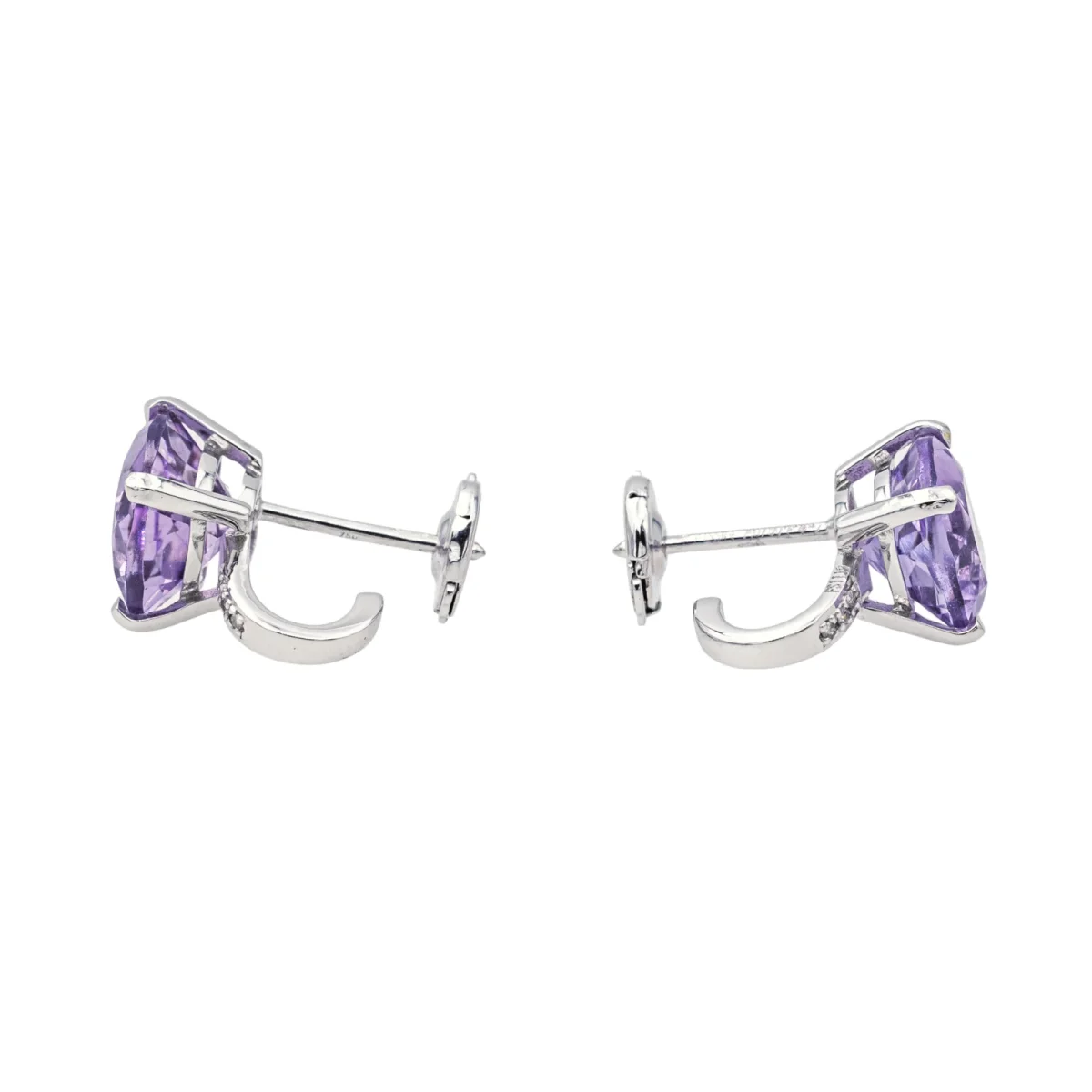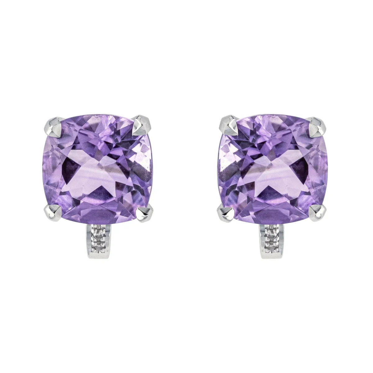 Paire de boucles d’oreilles dormeuses de la maison Mauboussin en or blanc 750 millièmes (18 carats)testé, modèle Petit visage d’amour, sertie d’améthystes et de diamants, 2 améthystes taille coussin, d’un poids total d’environ 4,20 cts, (chaque améthyste d’un poids d’environ 2,10 cts), entourées de 6 diamants taille brillant, environ G/VS, d’un poids total d’environ 0,006 ct, (chaque diamant d’un poids d’environ 0,001 ct), dimensions : 1,40 cm x 0,70 cm, poids total : 3,01 g, vendue avec écrin, numérotée FS1119, excellent état