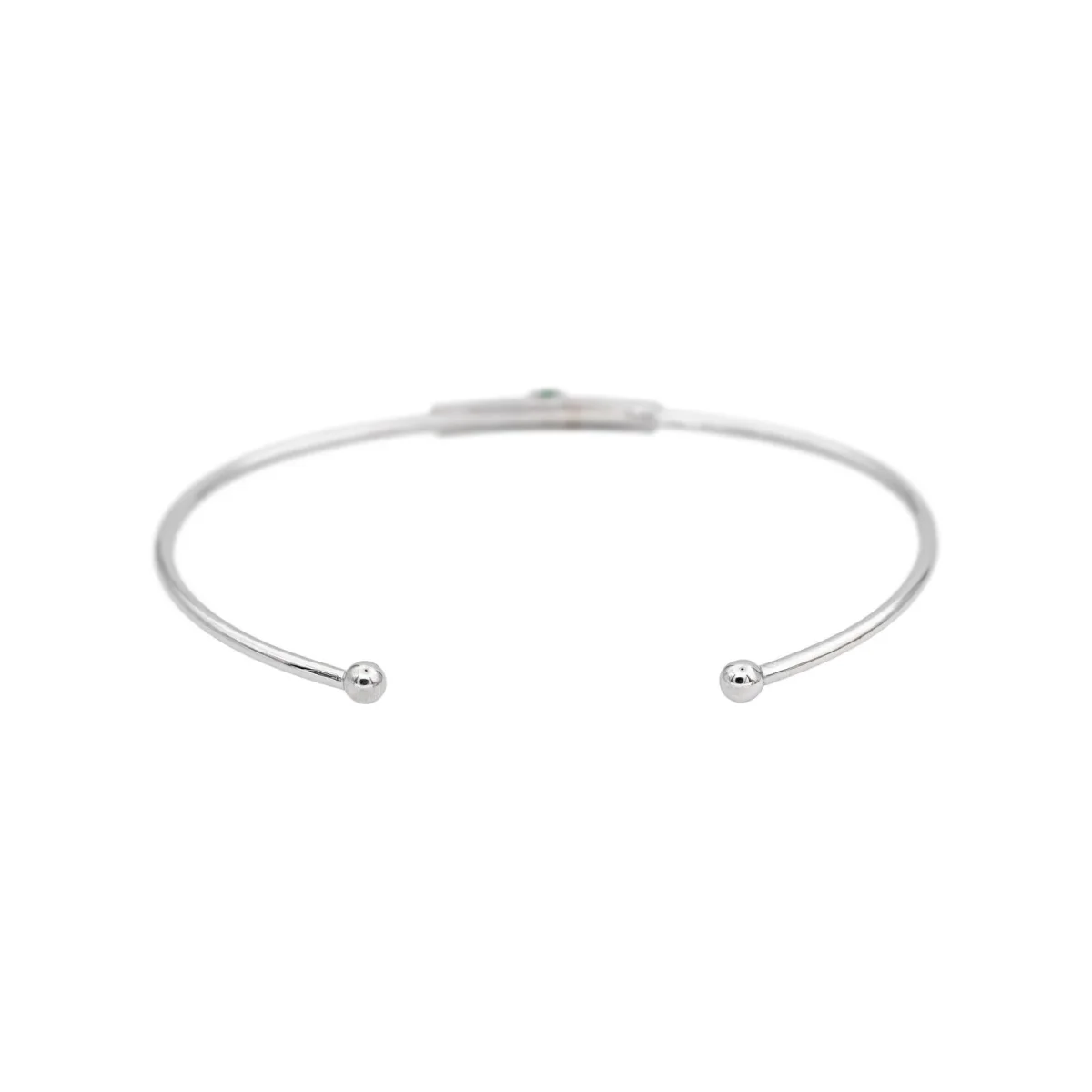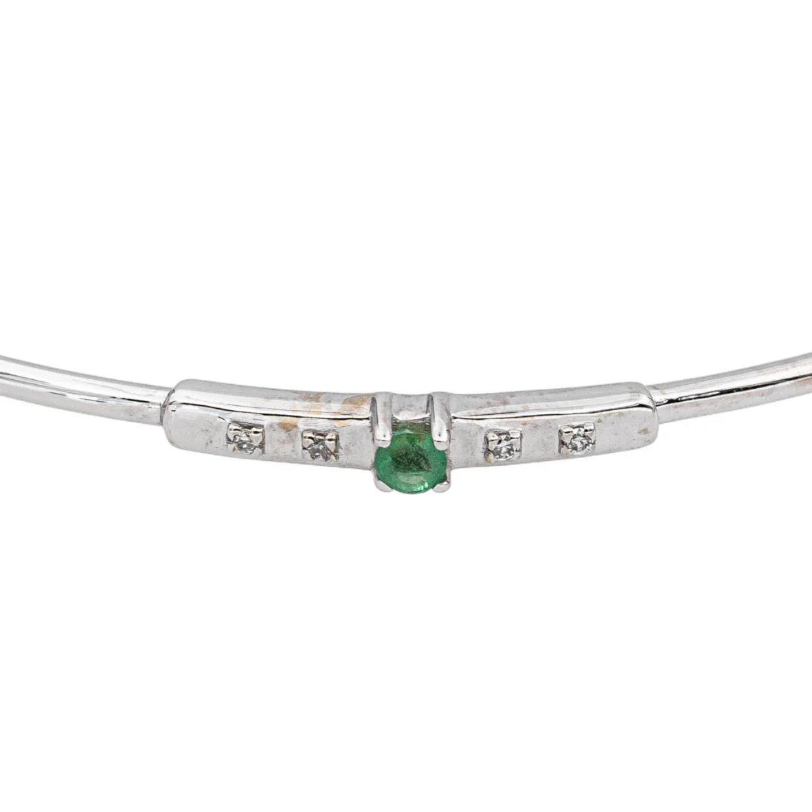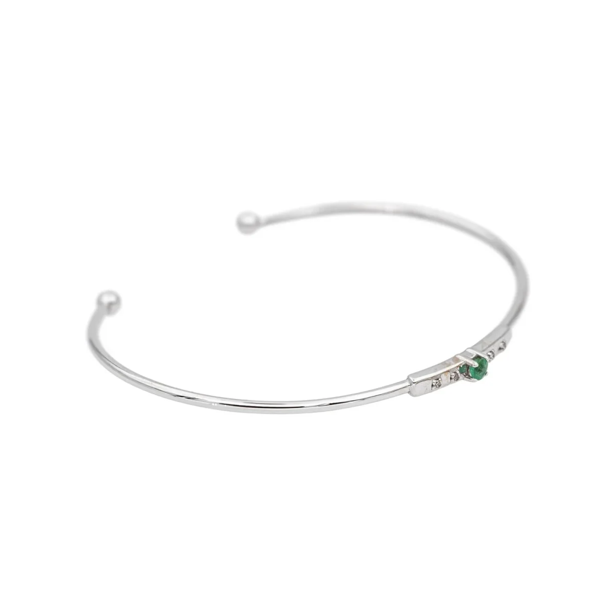 Bracelet jonc en or blanc 750 millièmes (18 carats) testé, serti d’une émeraude ronde d’environ 0,05 cts et de diamants taille brillant d’un poids total d’environ 0,02 cts, ouvert, diamètre intérieur : 0,50 cm x 0,38 cm, largeur : 0,25 cm, longueur : 14,00 cm, poids total : 2,54 g, excellent état