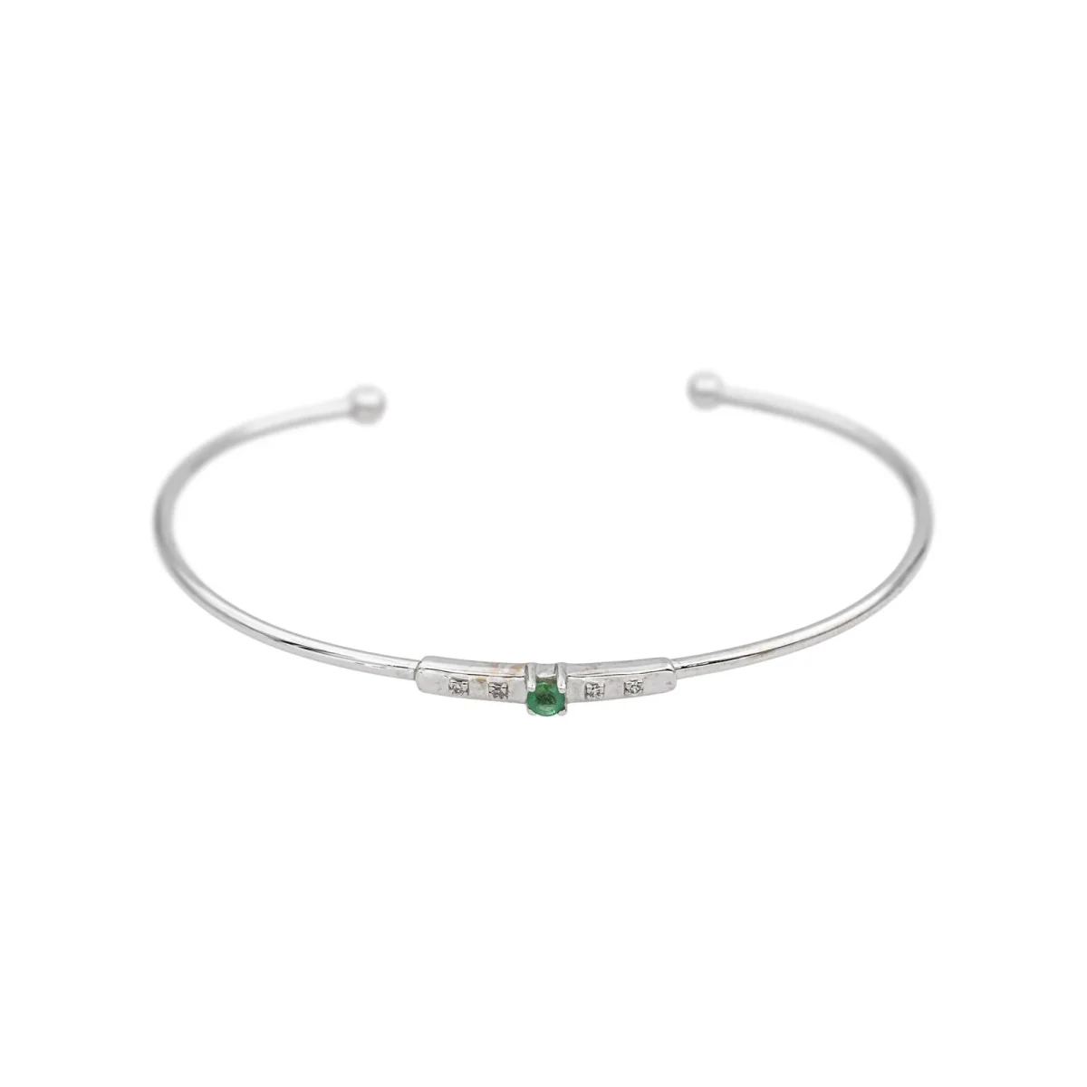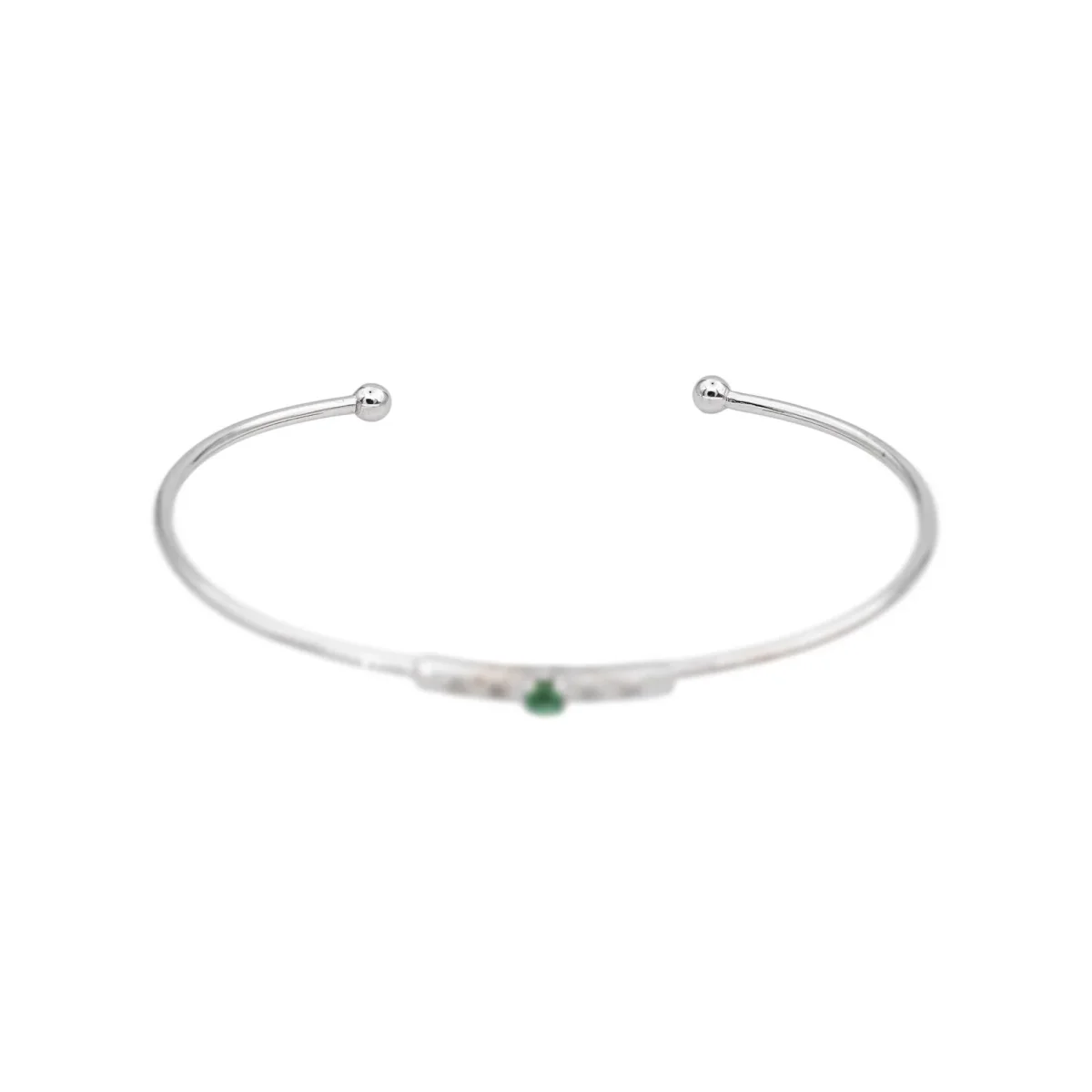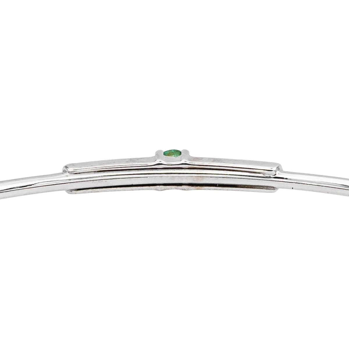 Bracelet jonc en or blanc 750 millièmes (18 carats) testé, serti d’une émeraude ronde d’environ 0,05 cts et de diamants taille brillant d’un poids total d’environ 0,02 cts, ouvert, diamètre intérieur : 0,50 cm x 0,38 cm, largeur : 0,25 cm, longueur : 14,00 cm, poids total : 2,54 g, excellent état