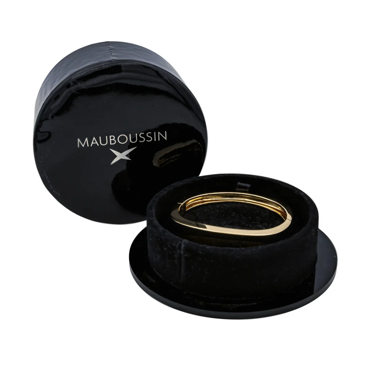 Bracelet jonc signé de la Maison Mauboussin en or jaune et blanc 750 millièmes (18 carats), ouvrant, diamètre intérieur : 5,50 cm x 5,50 cm, largeur : 0,34 cm, poids total : 49,35 g, poinçon hibou, vendu avec écrin, excellent état