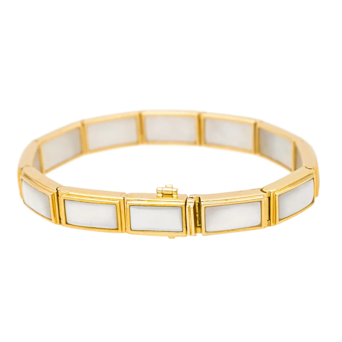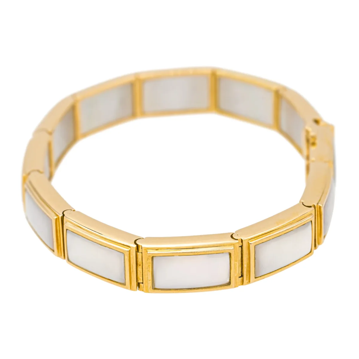 Bracelet signé de la Maison Mauboussin en or jaune 750 millièmes (18 carats), modèle Palmier, serti de 12 cabochons en nacre blanche, longueur : 17,50 cm, largeur : 0,85 cm, épaisseur : 0,40 cm, fermoir languette avec sécurité, poids total : 33,72 g, signature légèrement effacée, poinçon tête d’aigle, excellent état