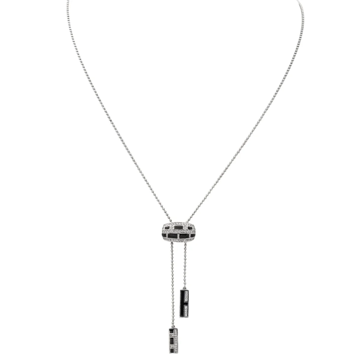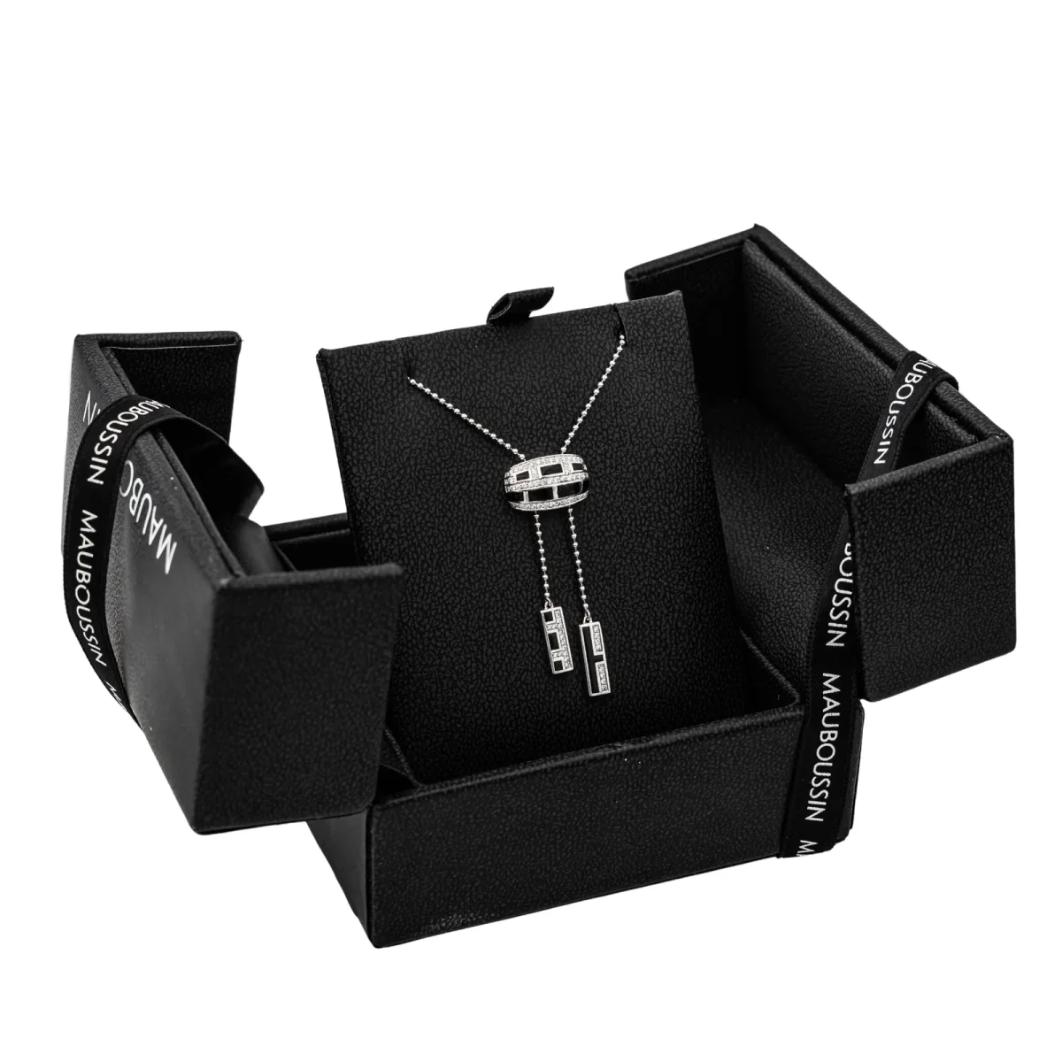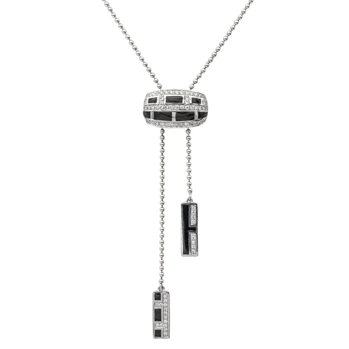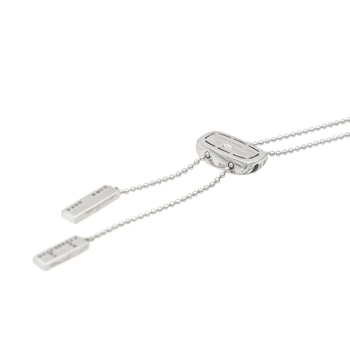 Collier signé de la Maison Mauboussin en or blanc 750 millièmes (18 carats), modèle Le vice et la vertu, motifs géométriques sertis de diamants, taille brillant, environ H-SI, poids total: environ 0,33 ct, maille souple, longueur : 54 cm (taille réglable), poinçon tête d’aigle, numéroté : W1808, vendu avec écrin d’origine, excellent état