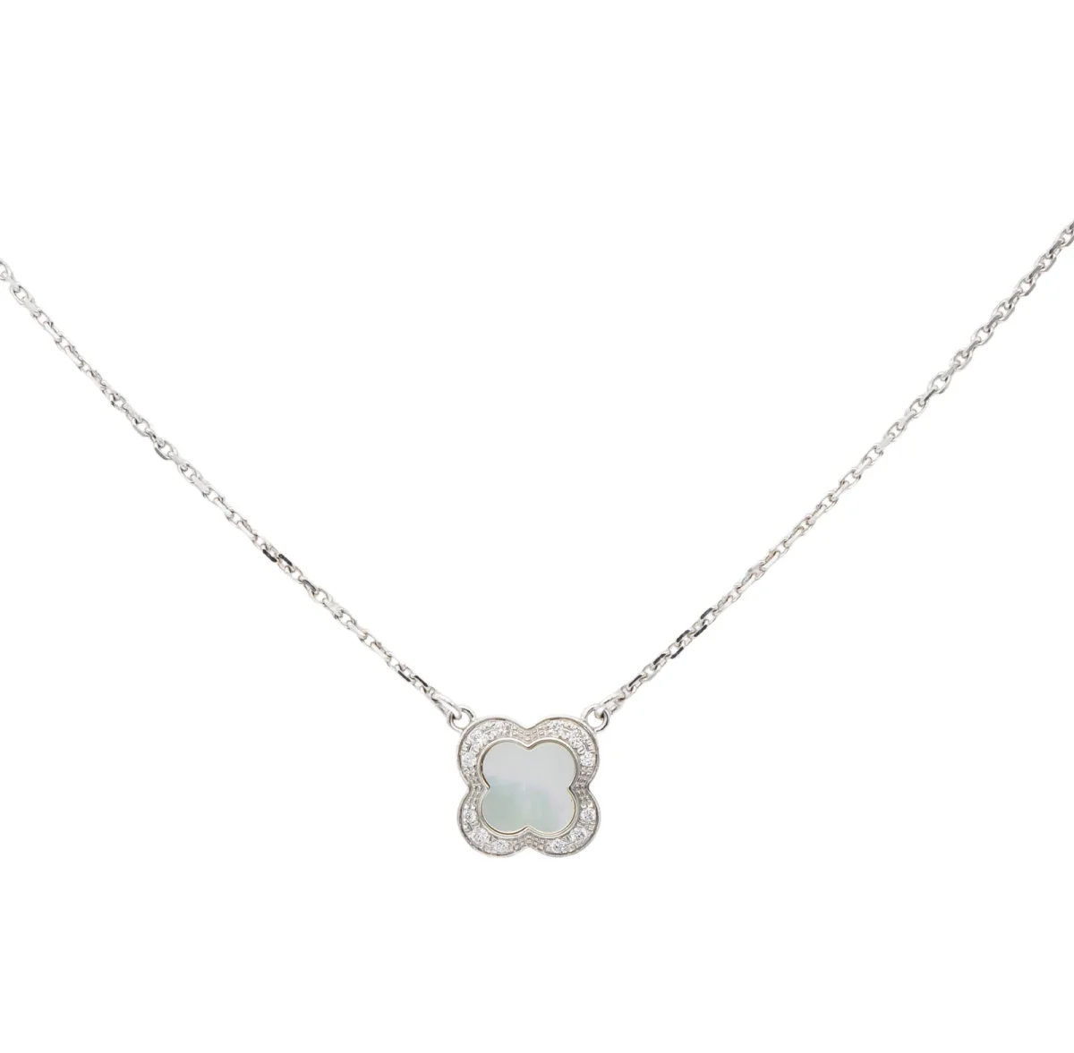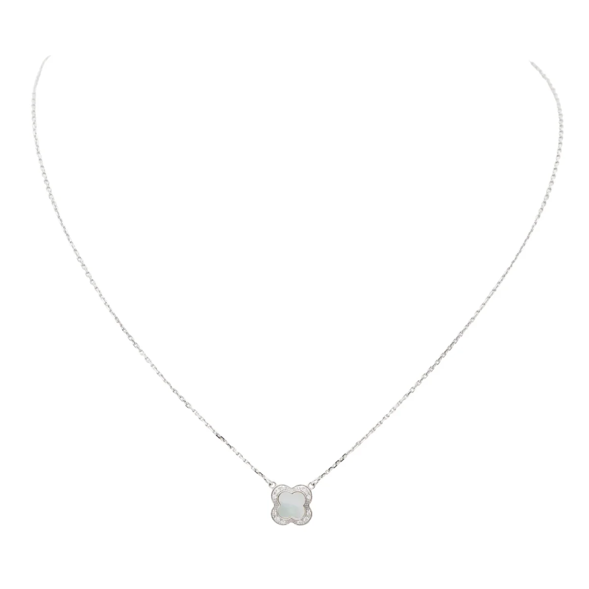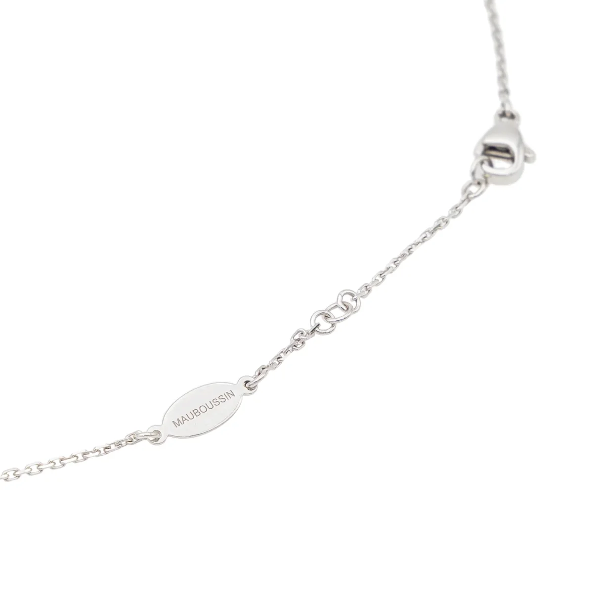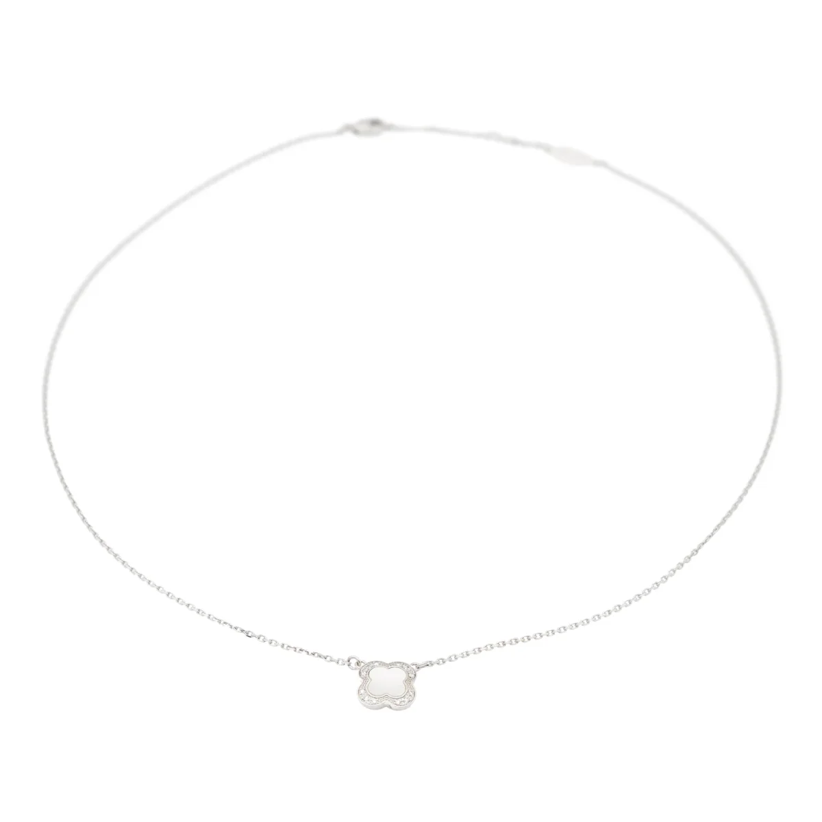 Collier signé de la Maison Mauboussin, modèle Trèfle de Toi, en or blanc 750 millièmes (18 carats), serti de nacre blanche et de 12 diamants taille brillant, estimés H/SI, d’un poids d’environ 0,005 ct chacun, poids total des diamants: environ 0,06 ct, maille forçat, longueur: 41,5 cm, dimensions du motif: 0,89 cm x 0,89 cm, poids total: 3,65 g, poinçon tête d’aigle, excellent état