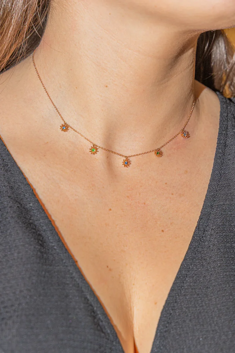 Collier signé de la Maison Mellerio en or rose 750 millièmes (18 carats) testé, modèle Petit cactus bleu, serti de 3 saphirs taille ronde environ 0,06 ct chacun et de 2 grenats tsavorites environ 0,045 ct chacun, Poids total estimé des saphirs: 0,19 ct, poids total estimé des tsavorites : 0,09 ct, Longueur: 38,5 cm (ajustable à 36,5 cm), largeur: 0,65 cm, Vendu avec écrin et certificat, Poids total: 2,79 g, Excellent état