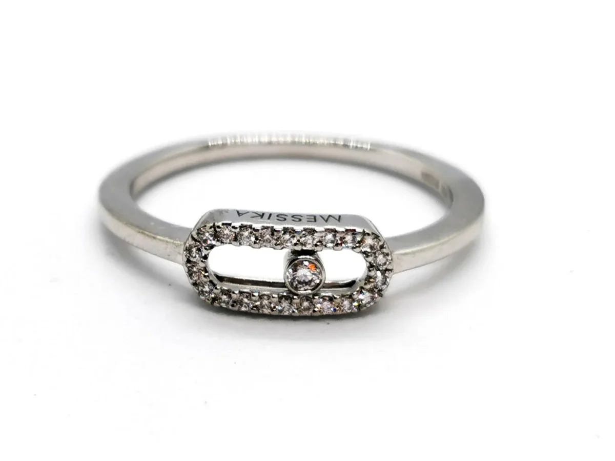 Bague signée de la maison Messika, collection Move Uno, en or blanc 750 millièmes (18 carats) testé, sertie de diamants taille brillant G/VS pour un total de 0,09 ct, dont un diamant mobile au centre du motif, taille: 52, dimensions du motif: 1 cm x 4,7 cm, poids total: 2,20 g, signé et numéroté: B12384, excellent état, prix neuf: 880€