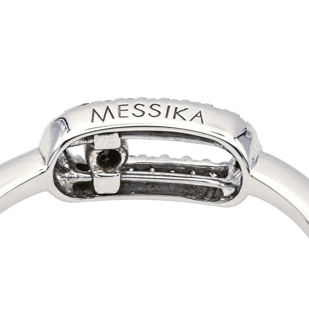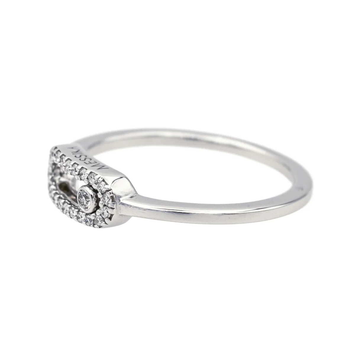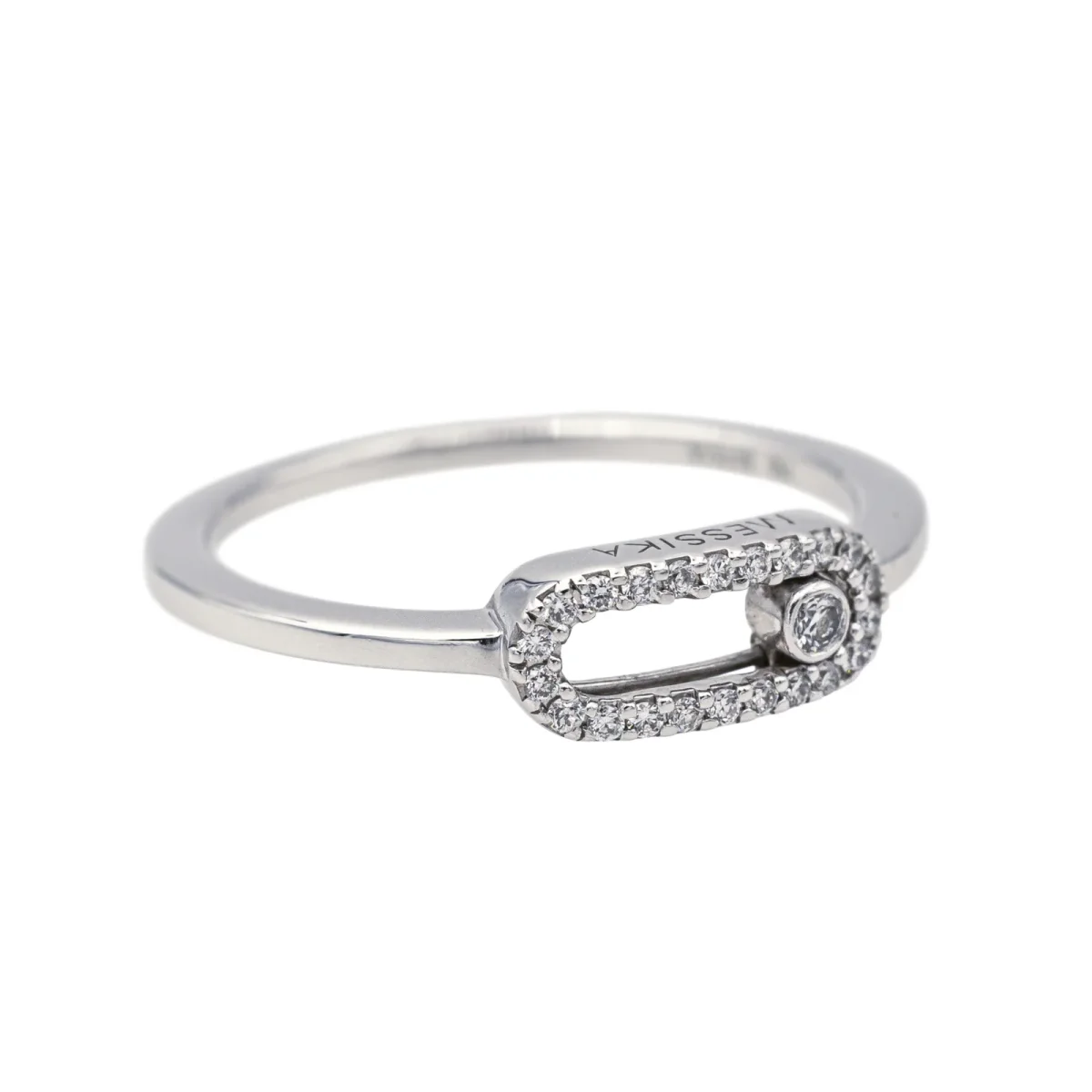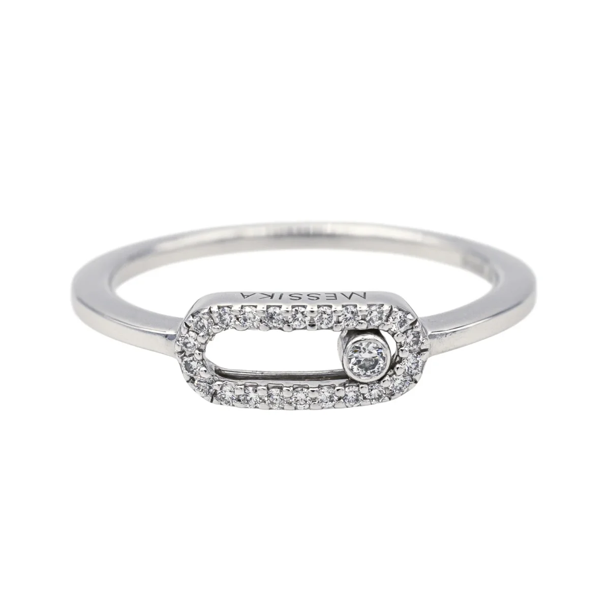 Bague signée de la Maison Messika en or blanc 750 millièmes (18 carats) testé, modèle Move Uno, sertie de diamants taille brillant, environ H-VS, un diamant mobile d’environ 0,02 ct et 24 diamants d’un poids total de 0,07 ct (chacun d’environ 0,003 ct), poids total des diamants: 0,09 ct, largeur sur le dessus : 0,46 cm, tour de doigt : 50, numérotée : B07616, poids total : 1,97 g, Excellent état