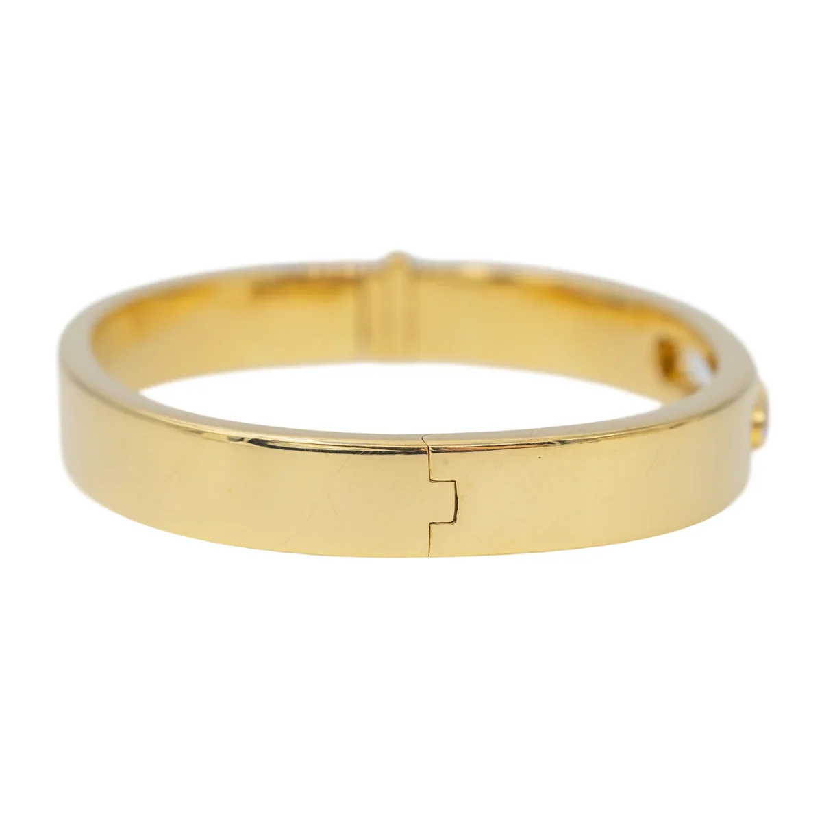 Bracelet signé de la Maison Messika en or jaune 750 millièmes (18 carats), modèle Bangle Move, serti de 4 diamants taille brillant environ G-VS, 3 diamants d’environ 0,07 ct chacun, et 1 diamants d’environ 0,005 ct poids total diamants: environ 0,22 ct, dimensions intérieures: 5,40 cm x 4,40 cm, largeur: 0,80 cm, longueur: 5,80 cm, poids total: 33,43 g, poinçon tête d’aigle, excellent état