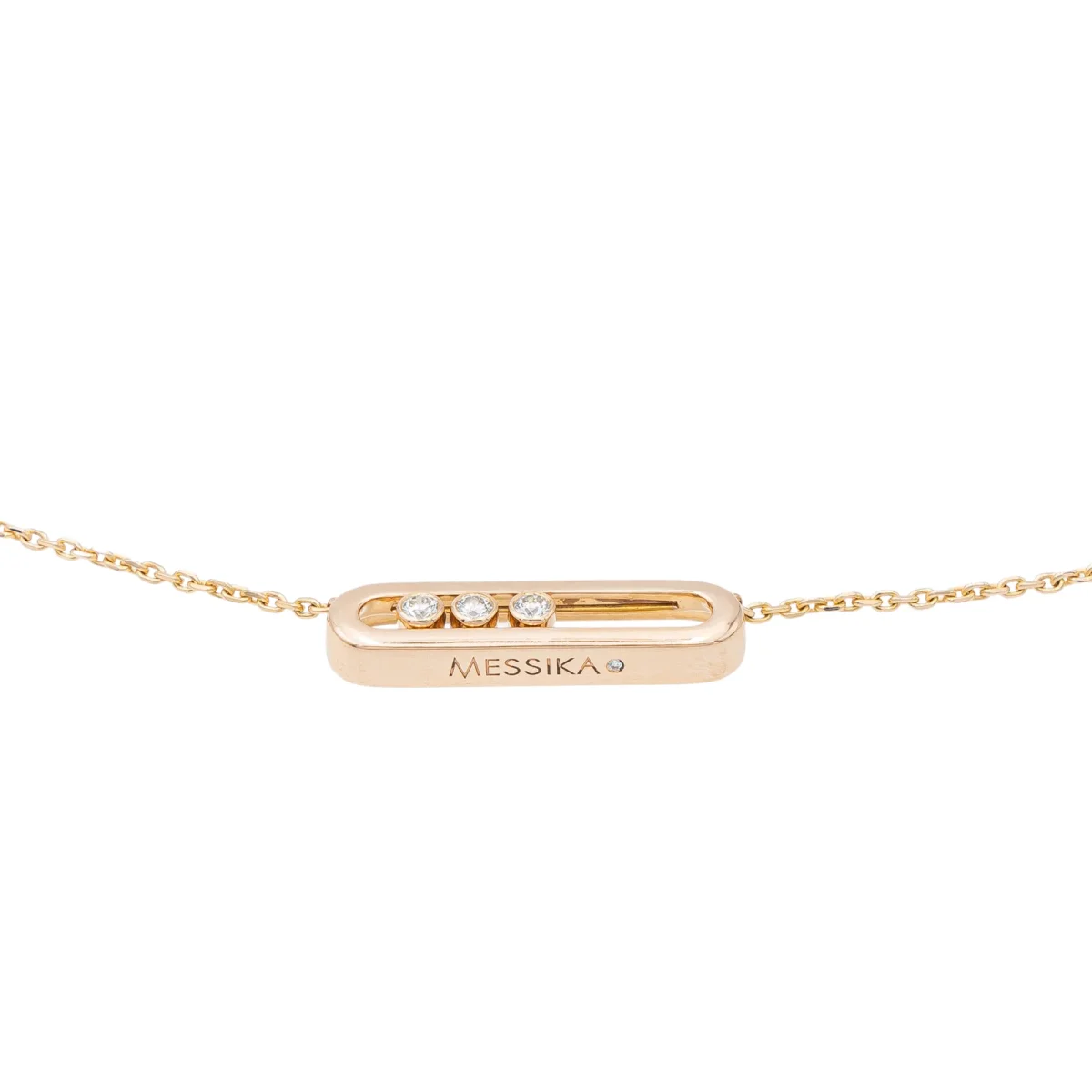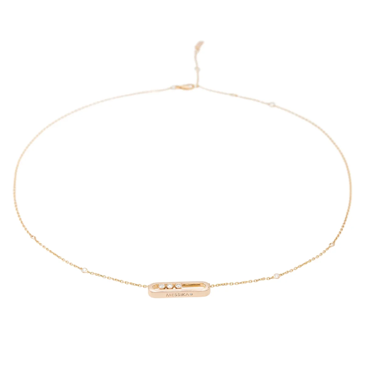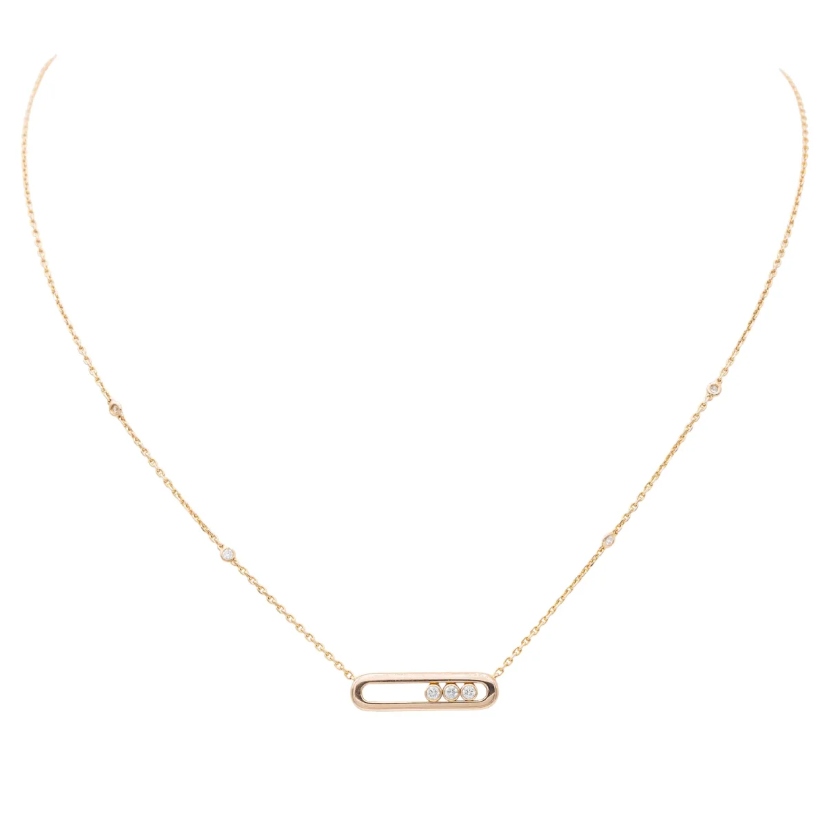 Collier signé de la Maison Messika, en or rose 750 millièmes (18 carats), modèle Baby Move, diamants taille brillant environ H-VS, motifs géométriques sertis de 3 diamants mobiles , maille souple, poids total diamants: environ 0,15 ct, (3 diamants centraux d’environ 0,03 ct chacun), longueur: 45,00 cm, 5 anneaux pour régler la taille, dimensions du motif: 2,20 cm, largeur: 0,55 cm, poids total: 5,35 g, numéro de série: B54337, poinçon tête d’aigle, excellent état, collier vendu avec écrin d’origine