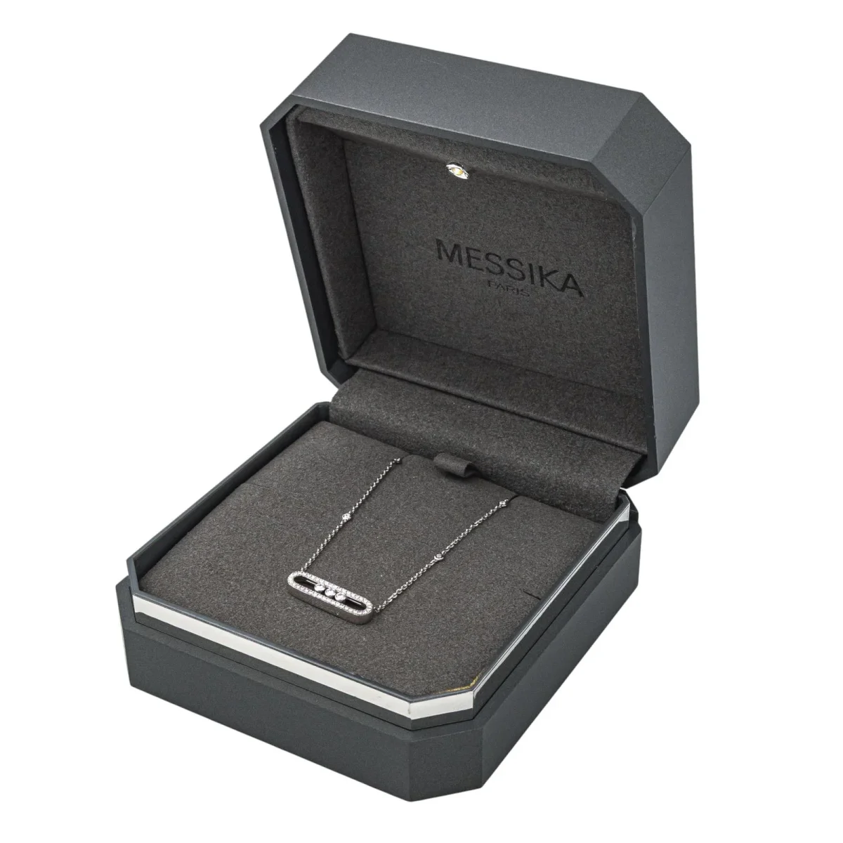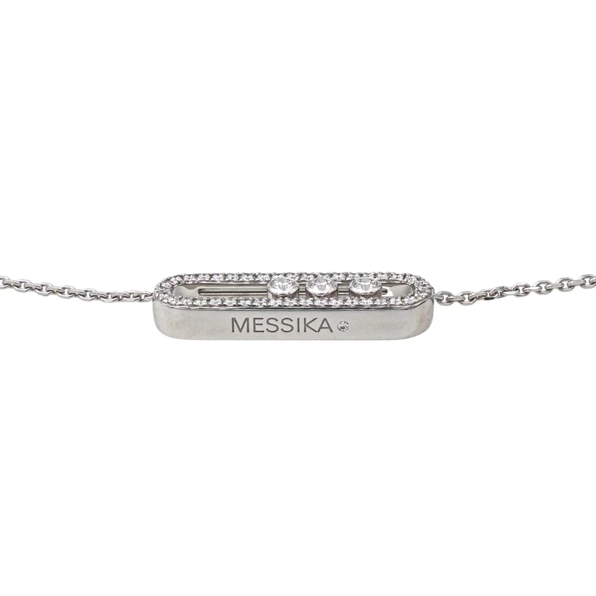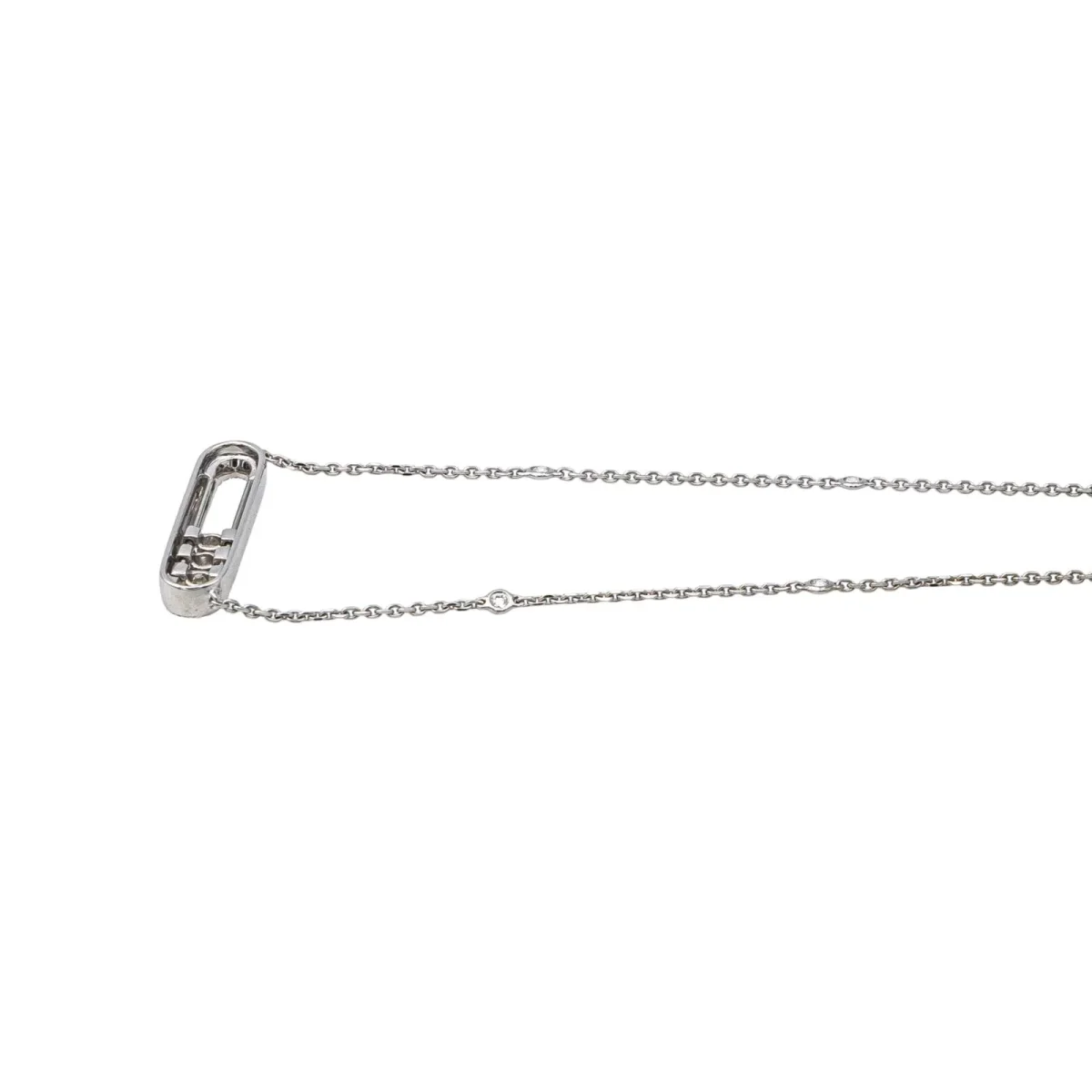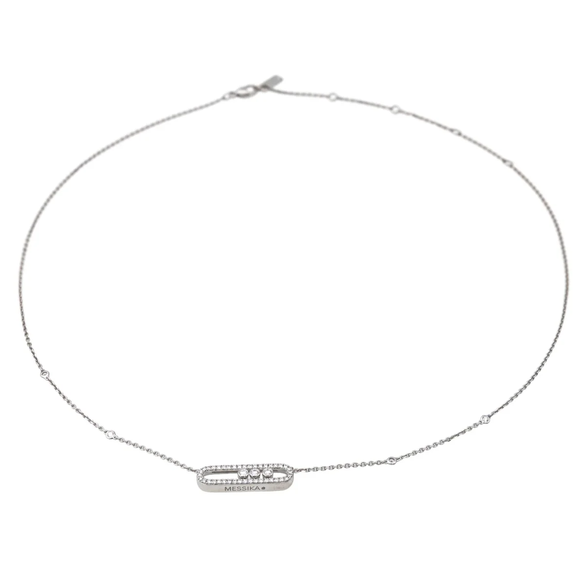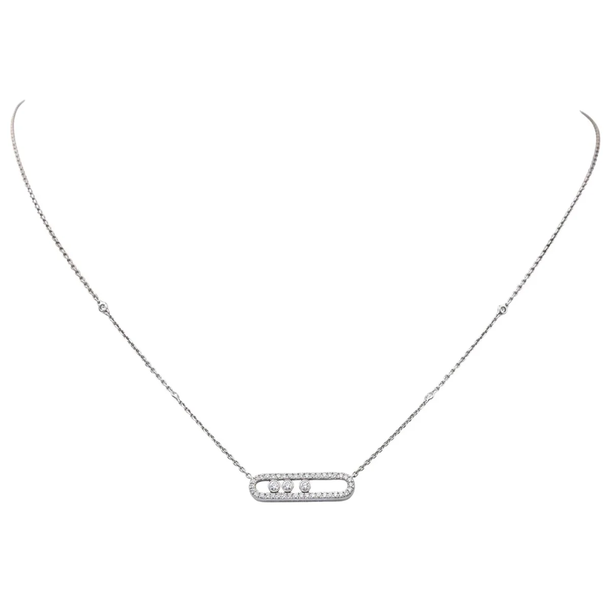 Collier signé de la Maison Messika en or blanc 750 millièmes (18 carats), modèle Baby Move Pavé, à motifs géométriques sertis de diamants, taille brillant, environ G-VS, d’un poids total d’environ 0,50 ct : 3 diamants d’un poids d’environ 0,03 ct chacun et 40 diamants d’un poids d’environ 0,01 chacun, maille forçat, longueur : 46,50 cm, largeur de la chaîne : 0,10 cm, longueur de la partie comprenant les motifs : 2,10 cm, largeur : 0,50 cm, poids total : 5,67 g, poinçon tête d’aigle, vendu avec écrin d’origine et d’époque, numéroté : H67352, excellent état