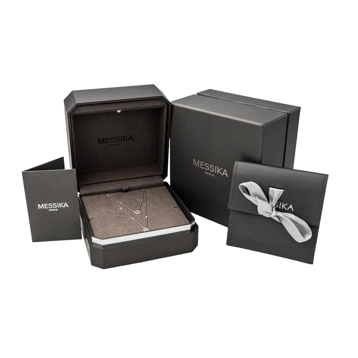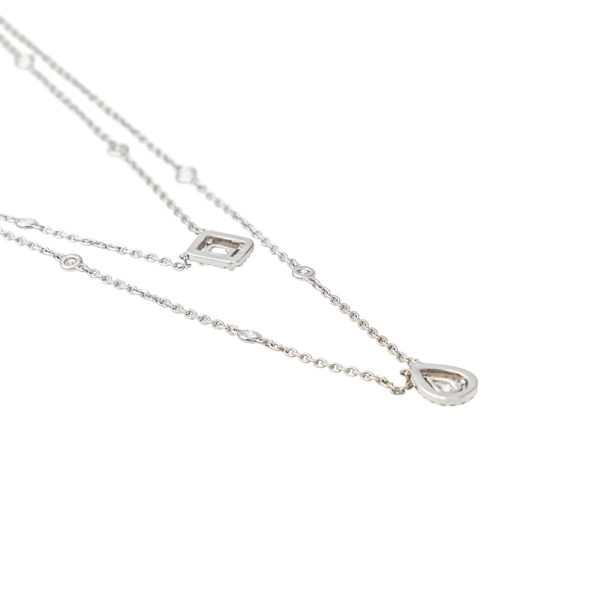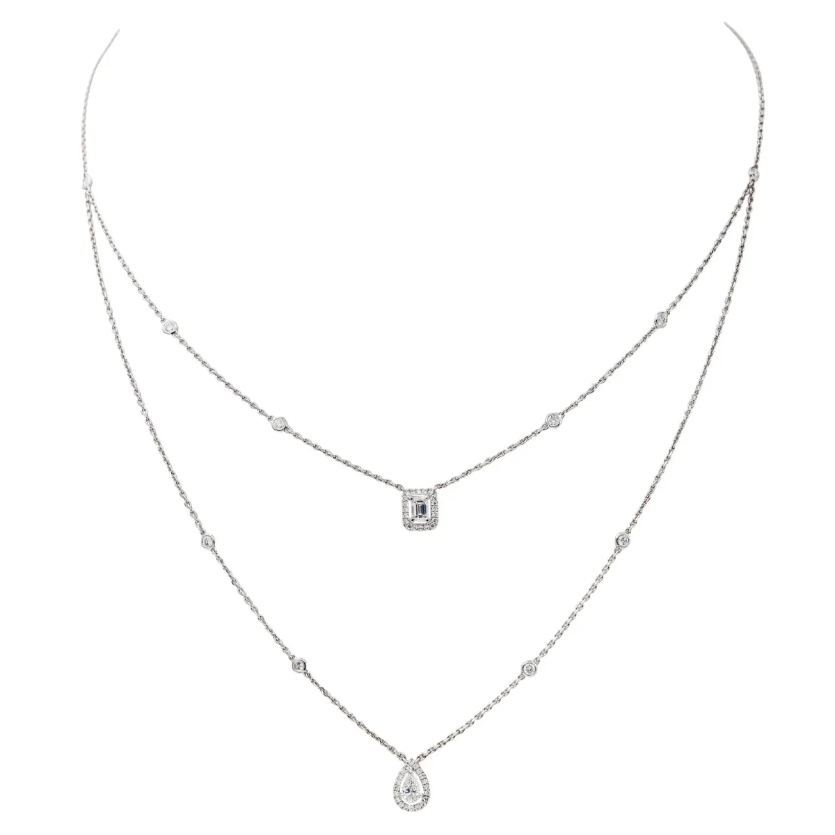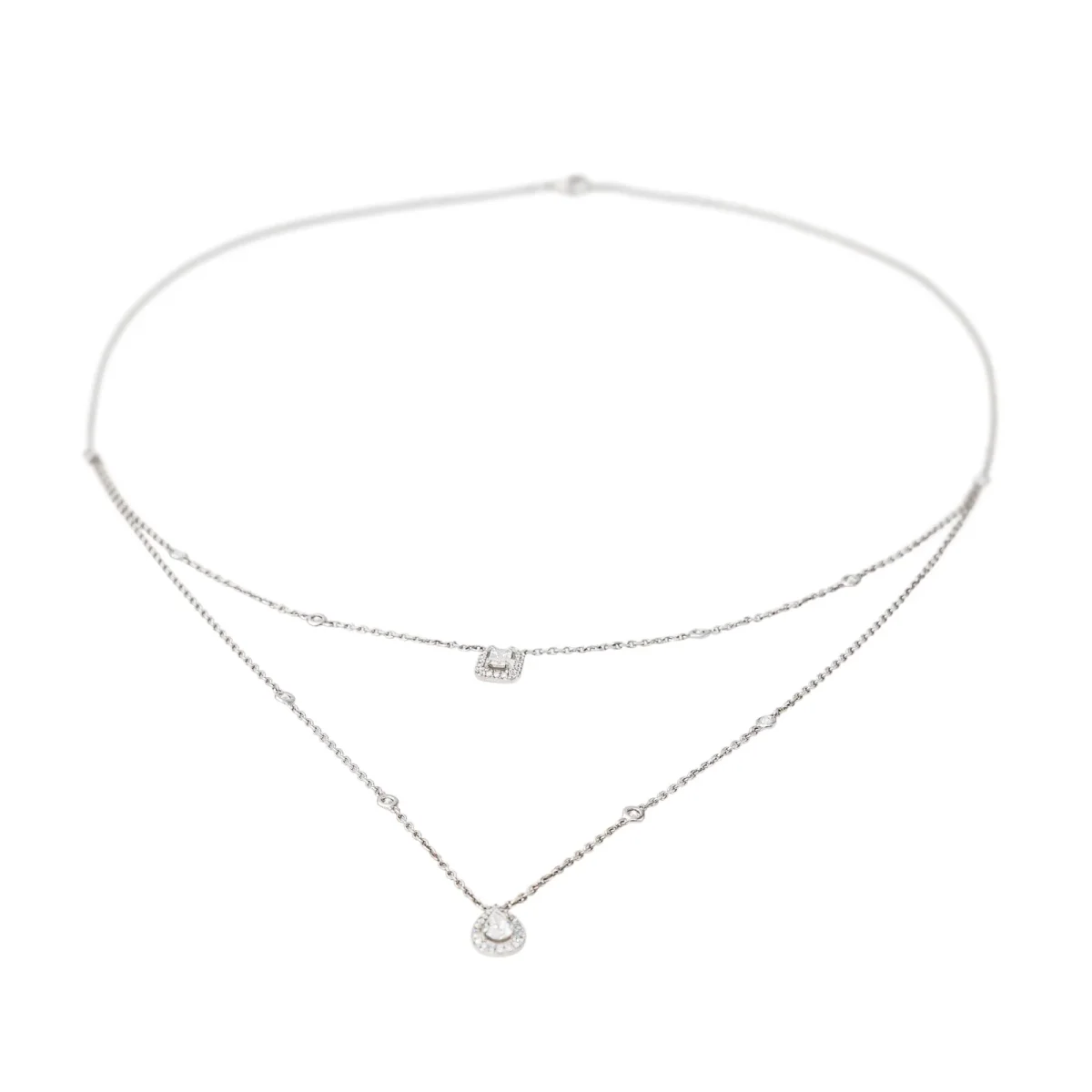 Collier signé de la Maison Messika en or blanc 750 millièmes (18 carats), modèle My Twin, motifs géométriques sertis de diamants, 1 diamant taille emeraude, environ F-VS, d’un poids total d’environ 0,20 ct, 1 diamant taille emeraude, environ F-VS, d’un poids total d’environ 0,20 ct, 10 diamants taille brillant, environ G-VS, d’un poids total d’environ 0,36 ct, (chaque diamant d’un poids d’environ 0,036 ct), Poids total diamants : 0,76ct, maille souple, longueur : 48 cm, poids total : 5,94 g, poinçon hibou, vendu avec écrin d’origine, excellent état