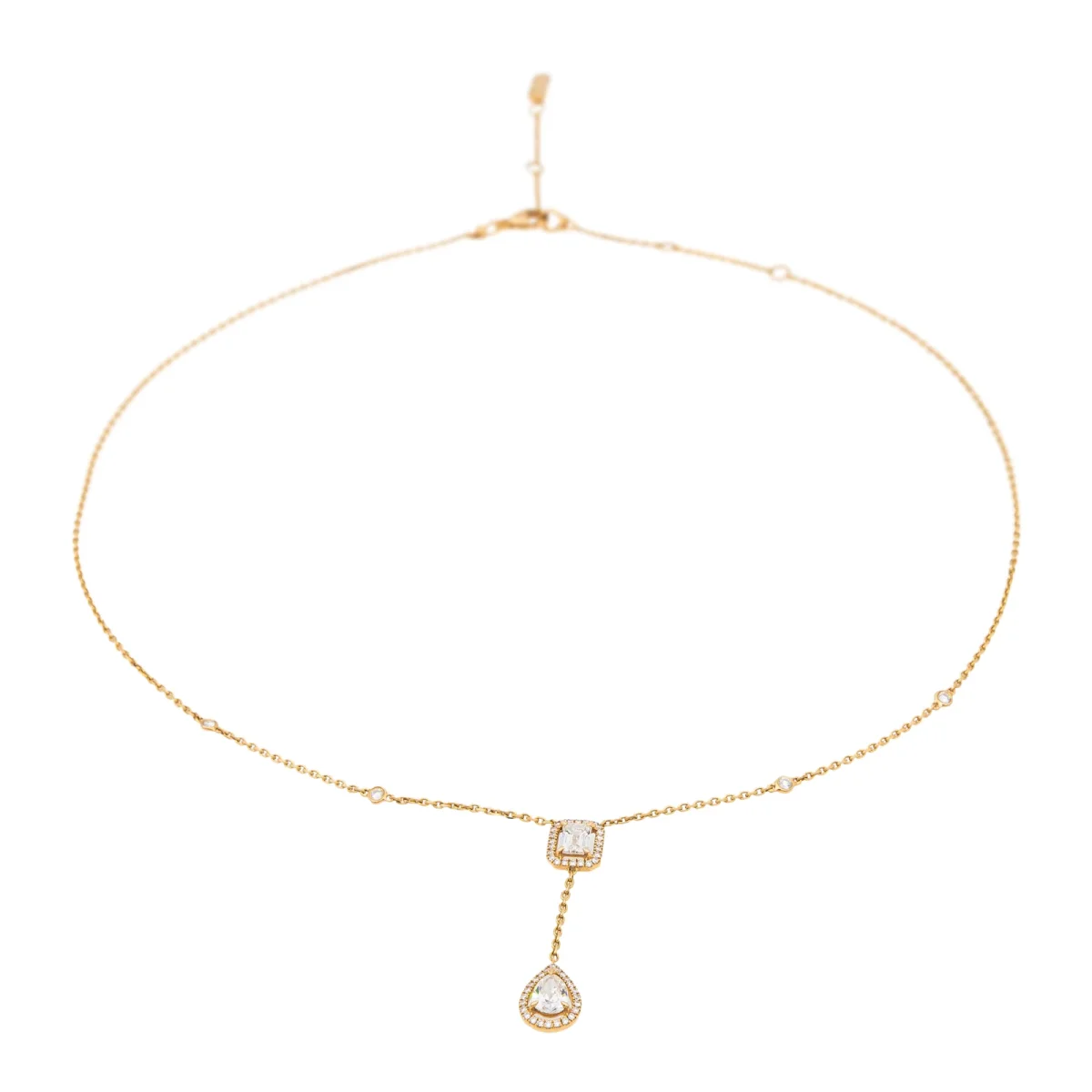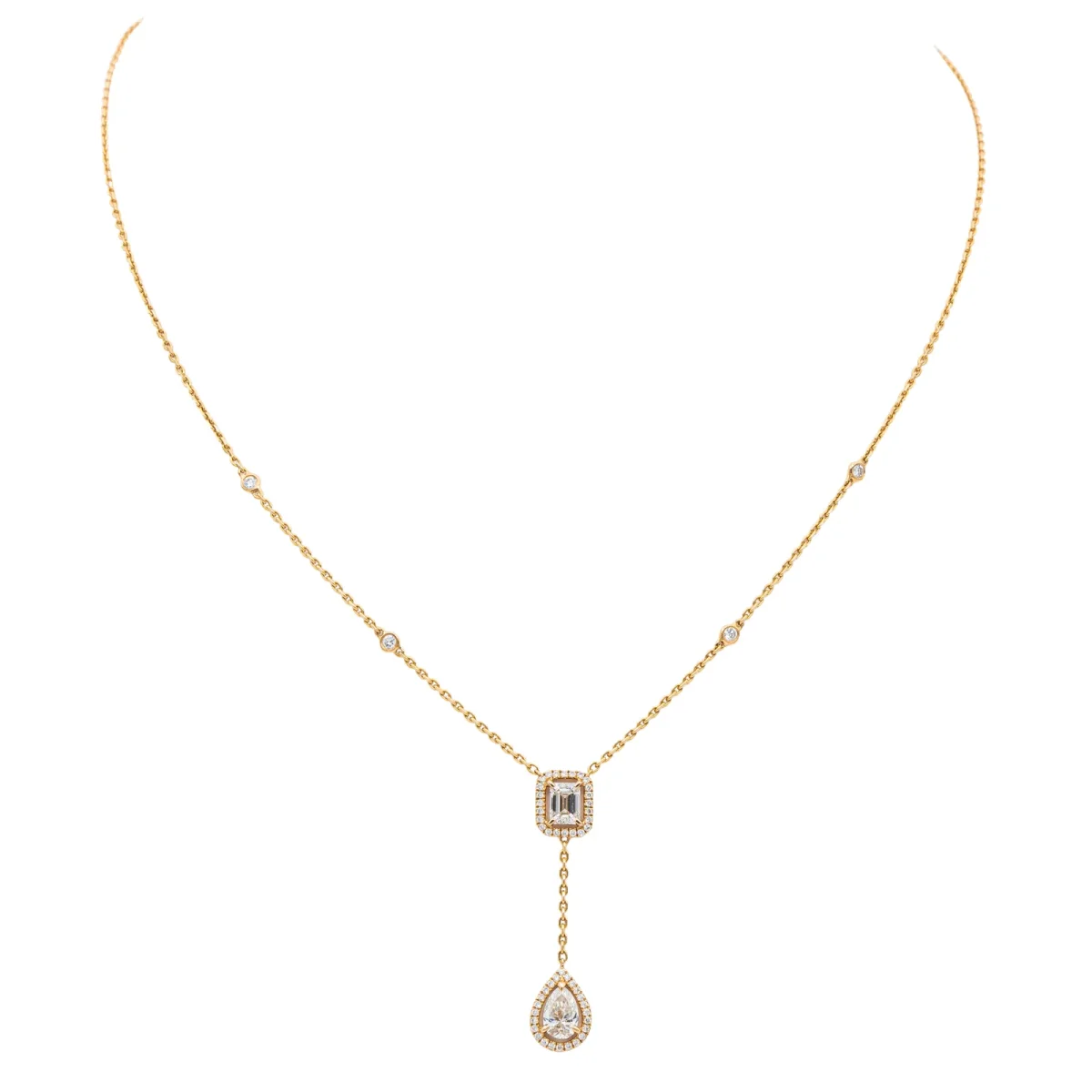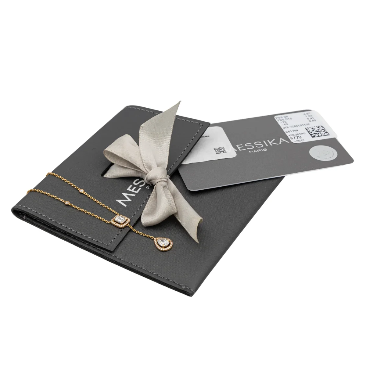 Collier en or rose 750 millièmes (18 carats), signé de la Maison Messika, modèle My Twin, serti de diamants estimés G/VS, un diamant poire d’environ 0,40 ct, un diamant taille emeraude environ 0,40 ct, et d’un pavage diamants taille brillant dont 4 d’environ 0,01 ct chacun et 38 diamants d’environ 0,005 ct chacun, Poids total estimé des diamants: 1,03 cts, Longueur: 45 cm, longueur de la chute: 3 cm, Signé et numéroté: B61744, vendu avec pochette et certificat d’authenticité, Prix neuf : 11300 €, Poids total: 4,76 g, Poinçon tête d’aigle, Excellent état