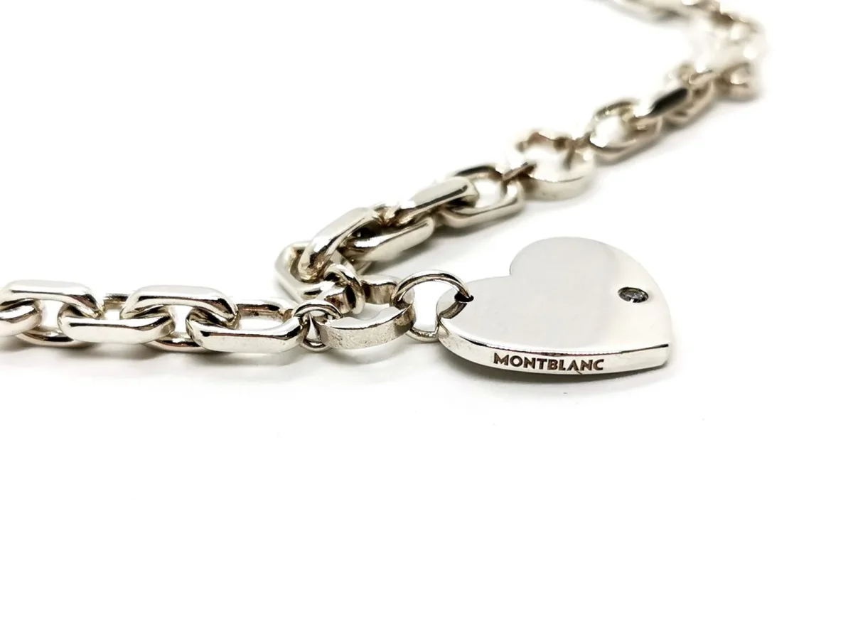 Collier signé de la maison MontBlanc, Collection Star Coeur, en argent 925 millièmes, composé d’une succession de maillons rectangulaires et ronds étoile, retenant au centre un pendentif, plaque lisse en forme de coeur, serti d’un diamant, taille brillant, environ H/SI, d’environ 0,015 ct, dimensions coeur: 1,91cm x 1,75 cm, largeur de la chaîne: 0,51 cm, longueur chaîne: 46 cm avec anneaux intermédiaires à 43 cm à 44 cm et à 45cm, fermoir barette, signature MontBlanc, poids total: 50,01 g, poinçon cygne, excellent état.