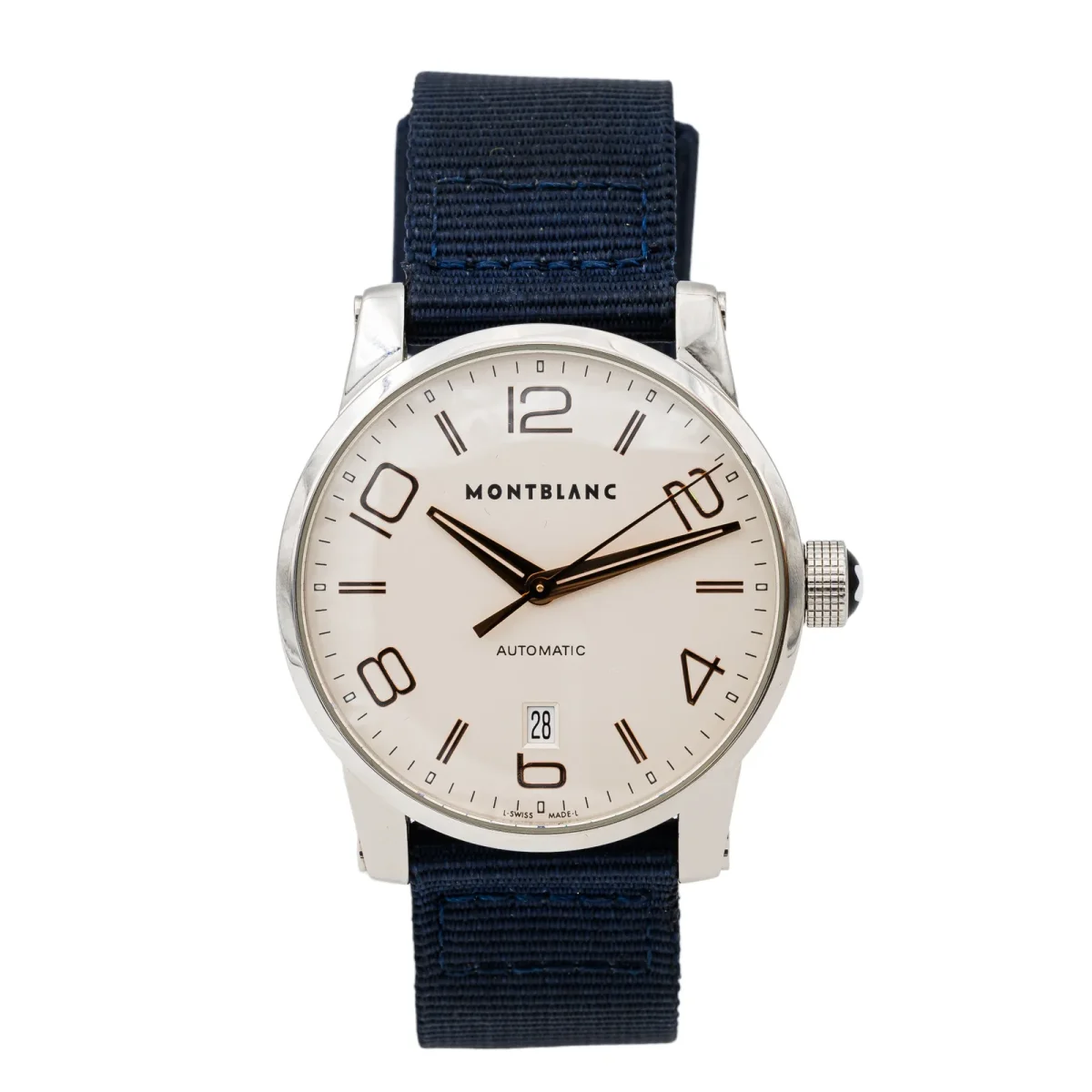 Montre Montblanc Timewalker, N° Série 105813, modèle BB309551, boitier 42 mm, sans bracelet d’origine, sans boiter d’origine et carte de garantie, mouvement mechanique à remontage automatique, réserve de marche 42h, réviser récemment, poids : 57,88g.