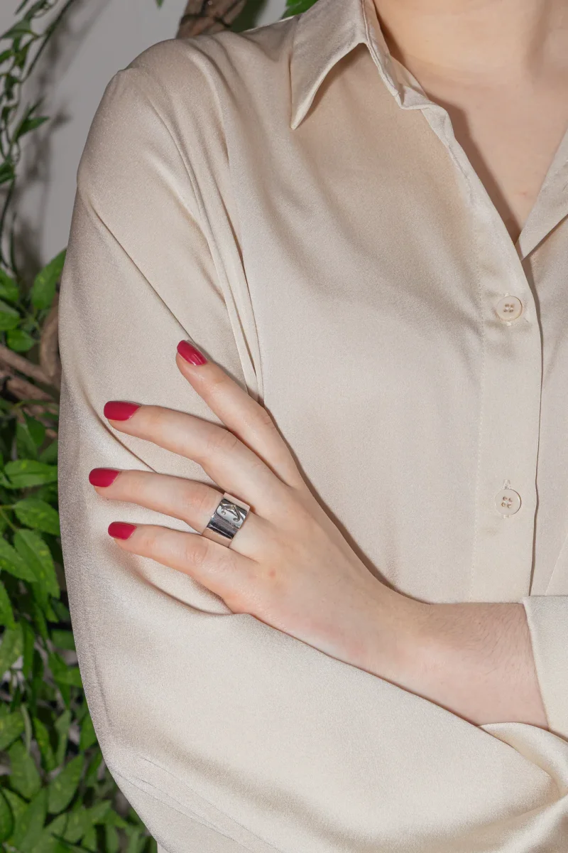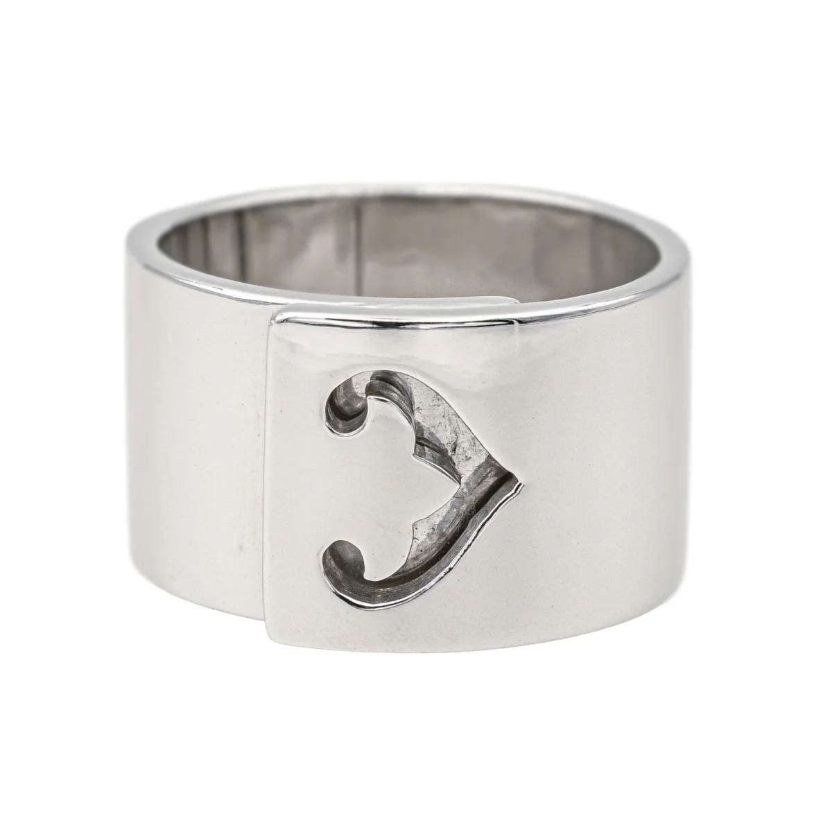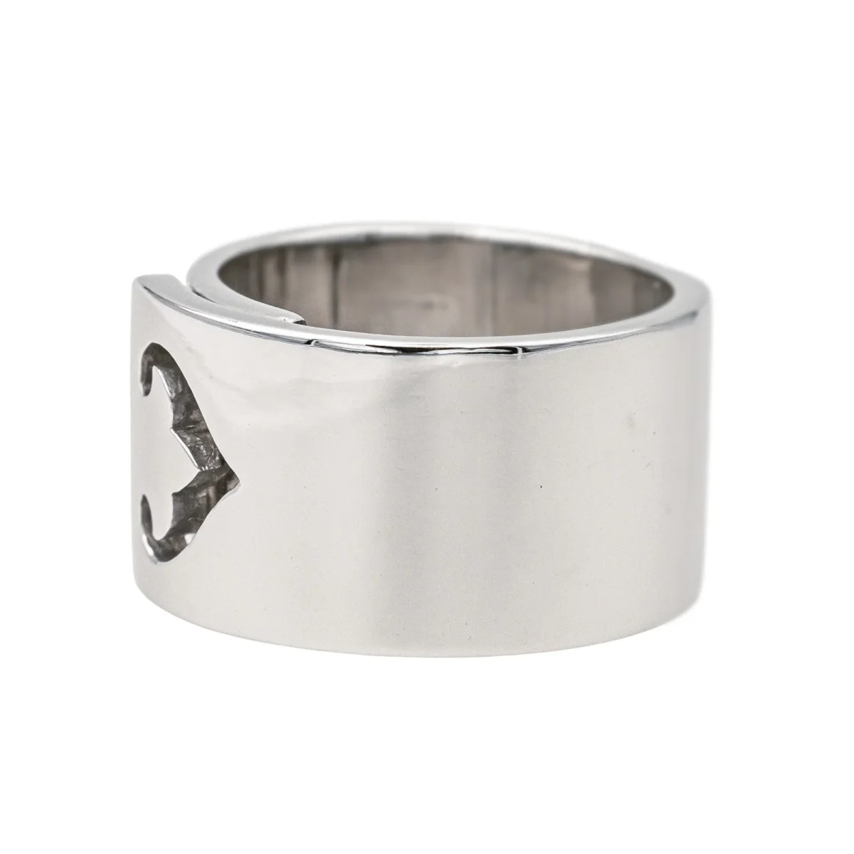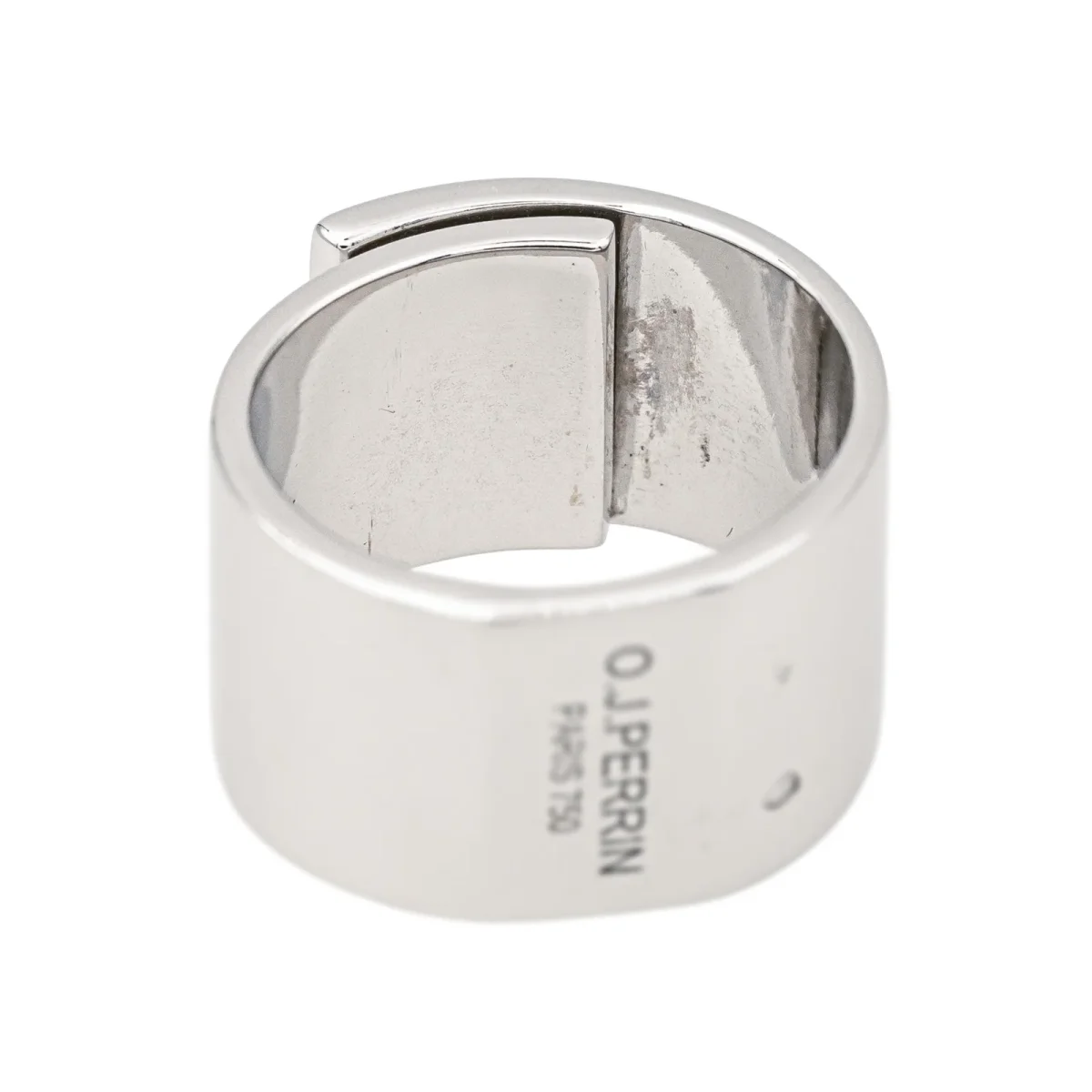 Bague signée de la Maison O.J. Perrin en or blanc 750 millièmes (18 carats), modèle Légende, grand modèle, largeur sur le dessus : 1,20 cm, tour de doigt : 54, poids total : 18,90 g, poinçon tête d’aigle, excellent état