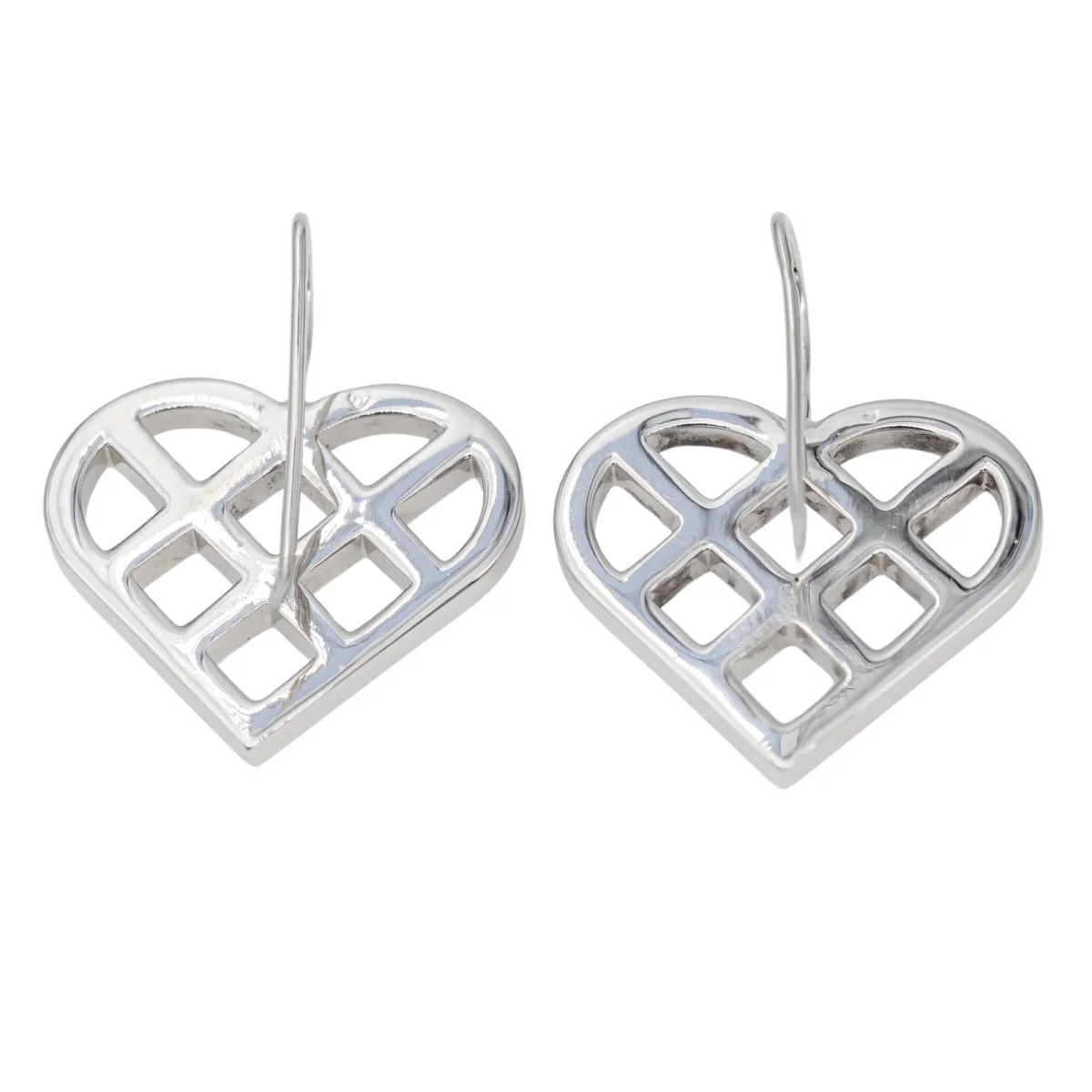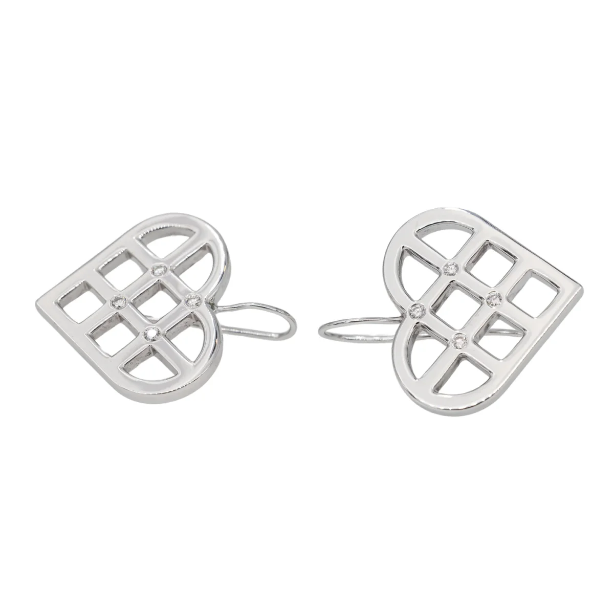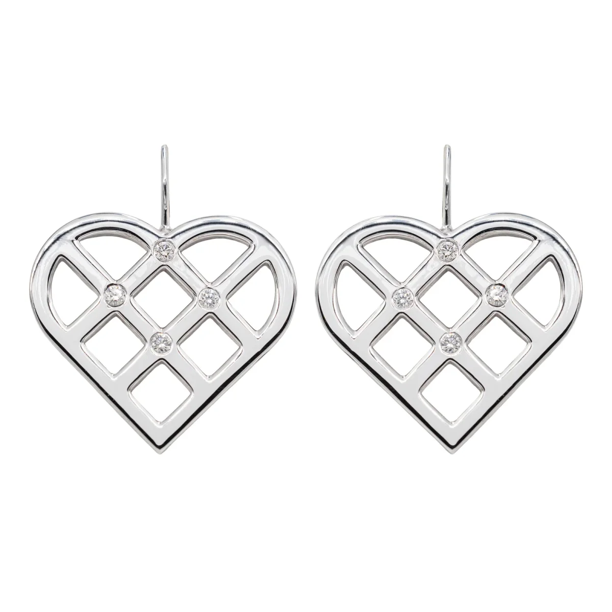 Paire de boucles d’oreilles en or blanc 750 millièmes (18 carats), signée de la Maison OJ Perrin, sertie chacune de 4 diamants taille brillant estimés H/VS, environ 0,01 ct chacun, Poids total estimé des diamants: 0,08 ct, Longueur totale: 2,97 cm, dimensions du coeur: 2,35 x 2,15 cm, Poids total: 14,82 g, poinçon hibou, Excellent état