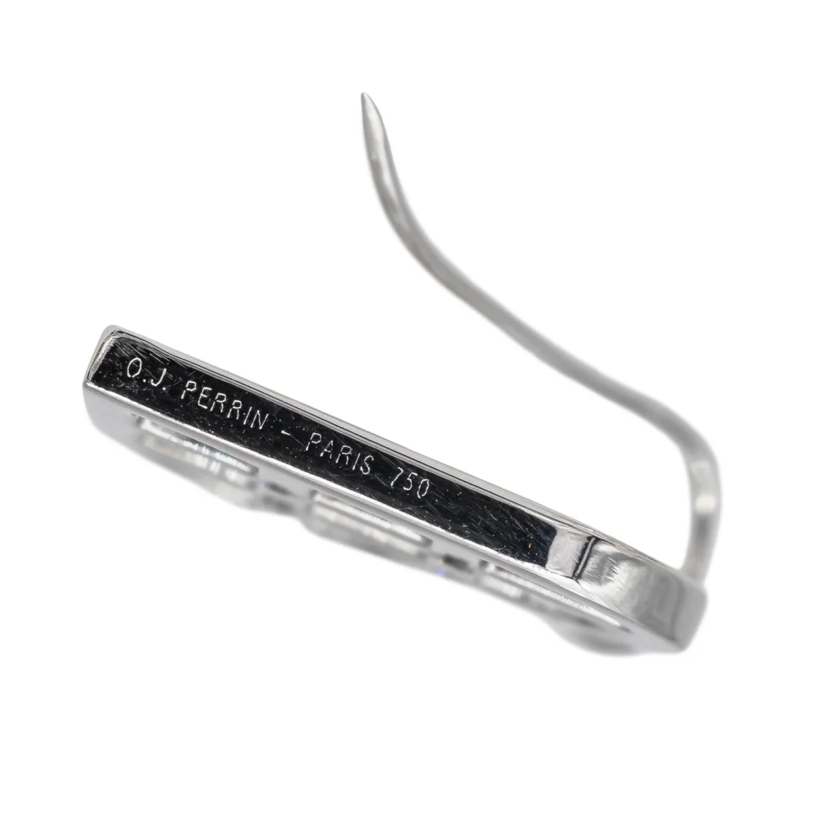 Paire de boucles d’oreilles en or blanc 750 millièmes (18 carats), signée de la Maison OJ Perrin, sertie chacune de 4 diamants taille brillant estimés H/VS, environ 0,01 ct chacun, Poids total estimé des diamants: 0,08 ct, Longueur totale: 2,97 cm, dimensions du coeur: 2,35 x 2,15 cm, Poids total: 14,82 g, poinçon hibou, Excellent […]