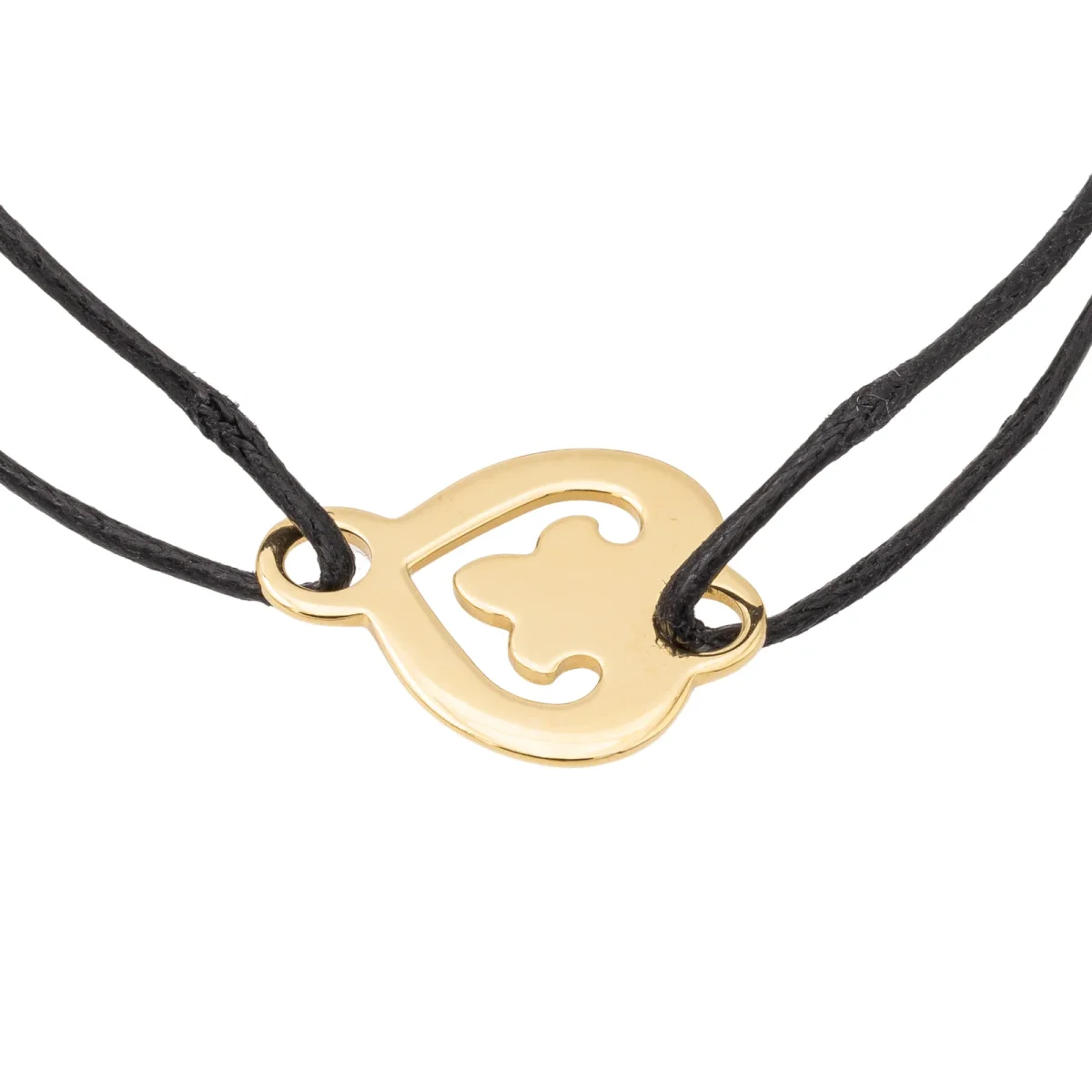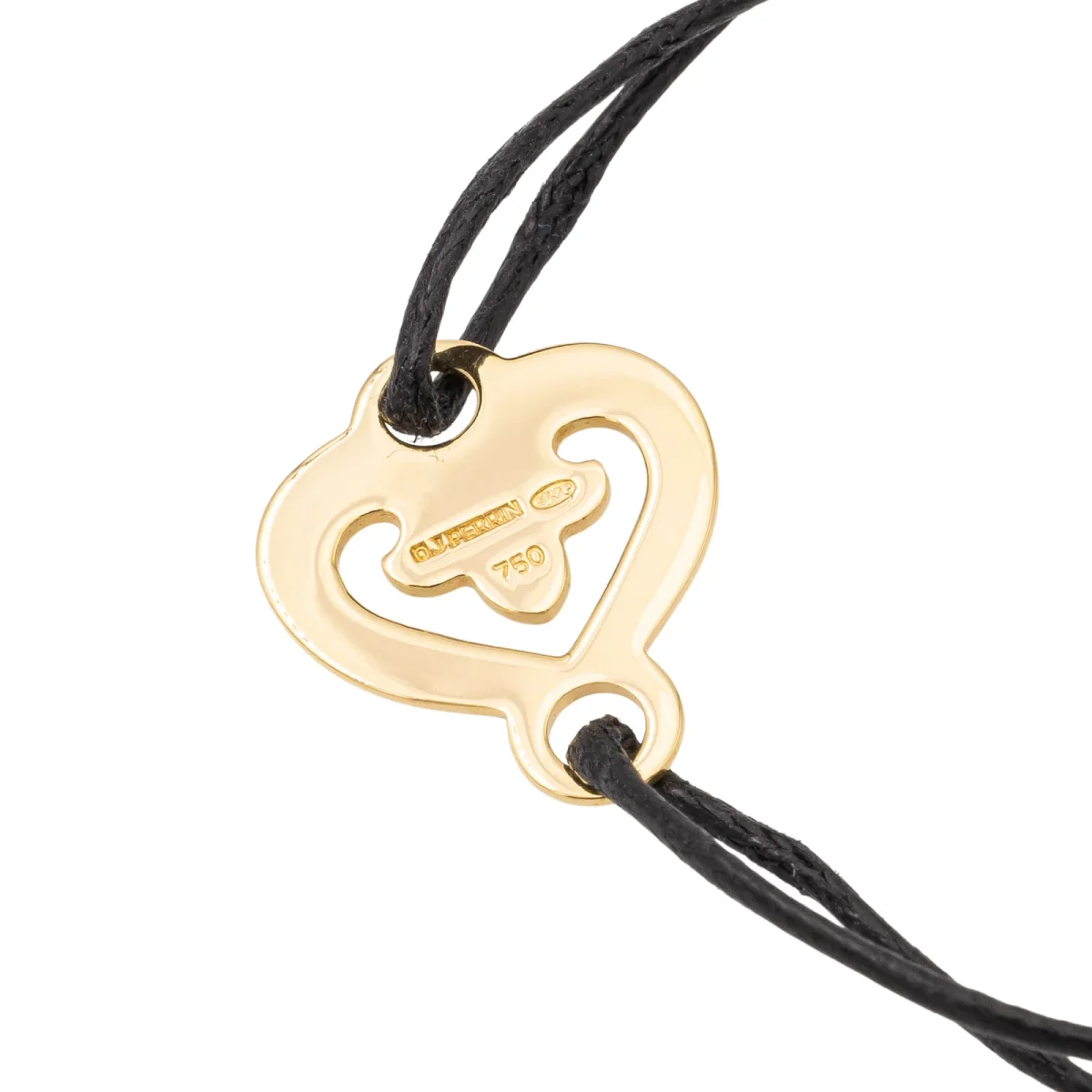 Bracelet signé de la Maison OJ Perrin, cœur en or jaune 750 millièmes (18 carats) testé, modèle légendes, cordon noir, longueur max cordon: 27 cm, longueur min cordon: 15 cm, dimension motif: 1,7 cm x 1,5 cm, taille ajustable grâce aux noeuds coulissants du cordon, poids total: 1,77 g, excellent état