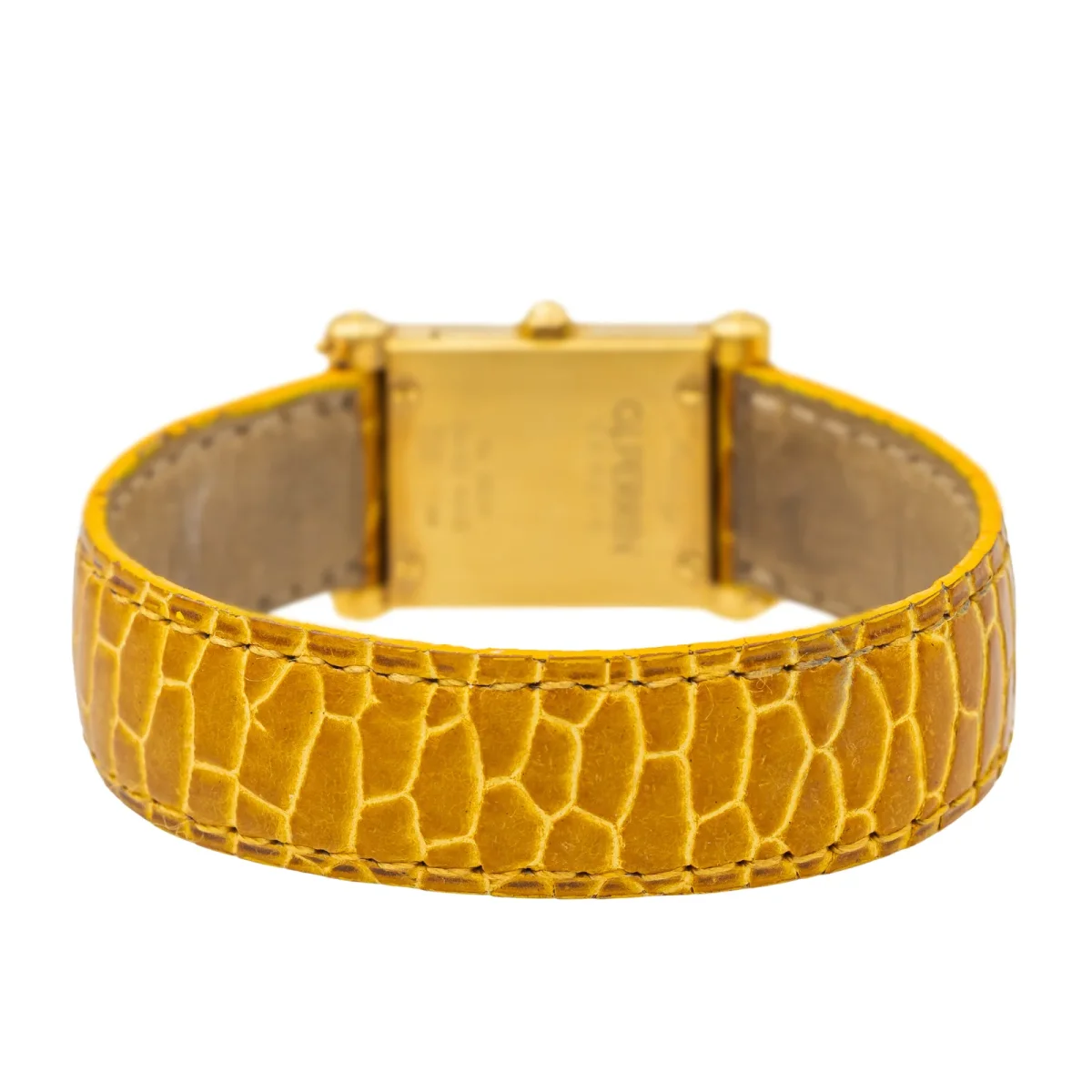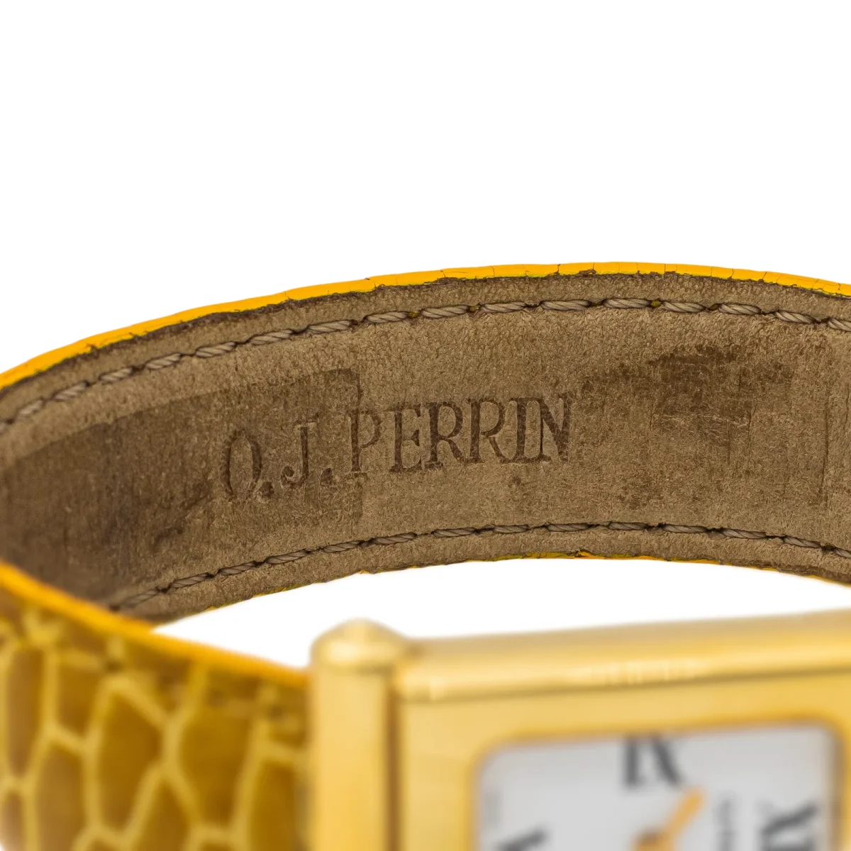 Montre signée de la maison O.J. Perrin, modèle Milady, mouvement quartz, boîtier en or jaune 750 millièmes (18 carats), bracelet en croco, taille du boîtier: 1,9 cm x 2,8 cm, taille de poignet: 17,5 cm, (longueur bracelet hors cadran: 14,7 cm), largeur bracelet: 1,5 cm, cadran blanc, chiffres romains, poinçonné et numéroté: 0059, poids total: 24,64 g, état neuf