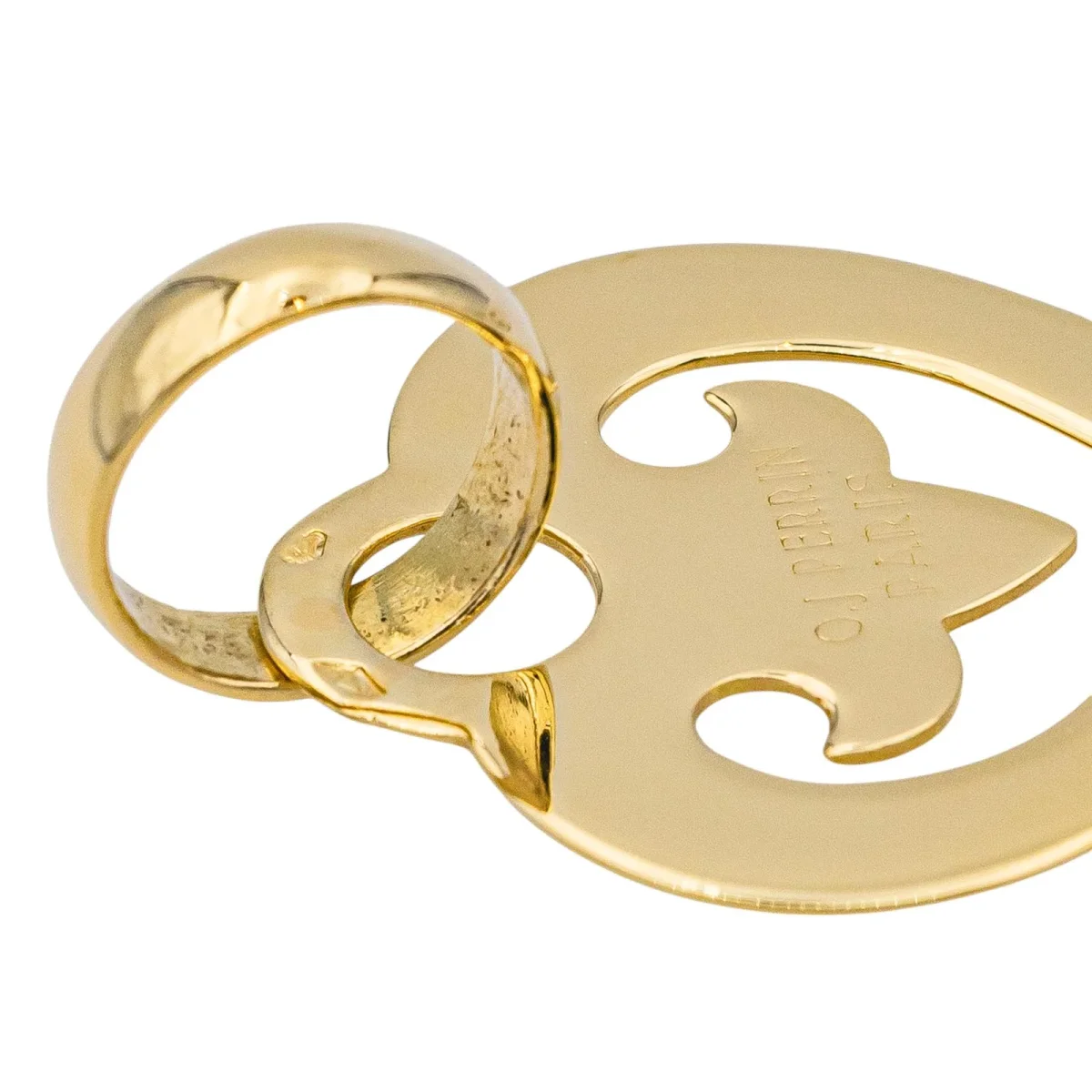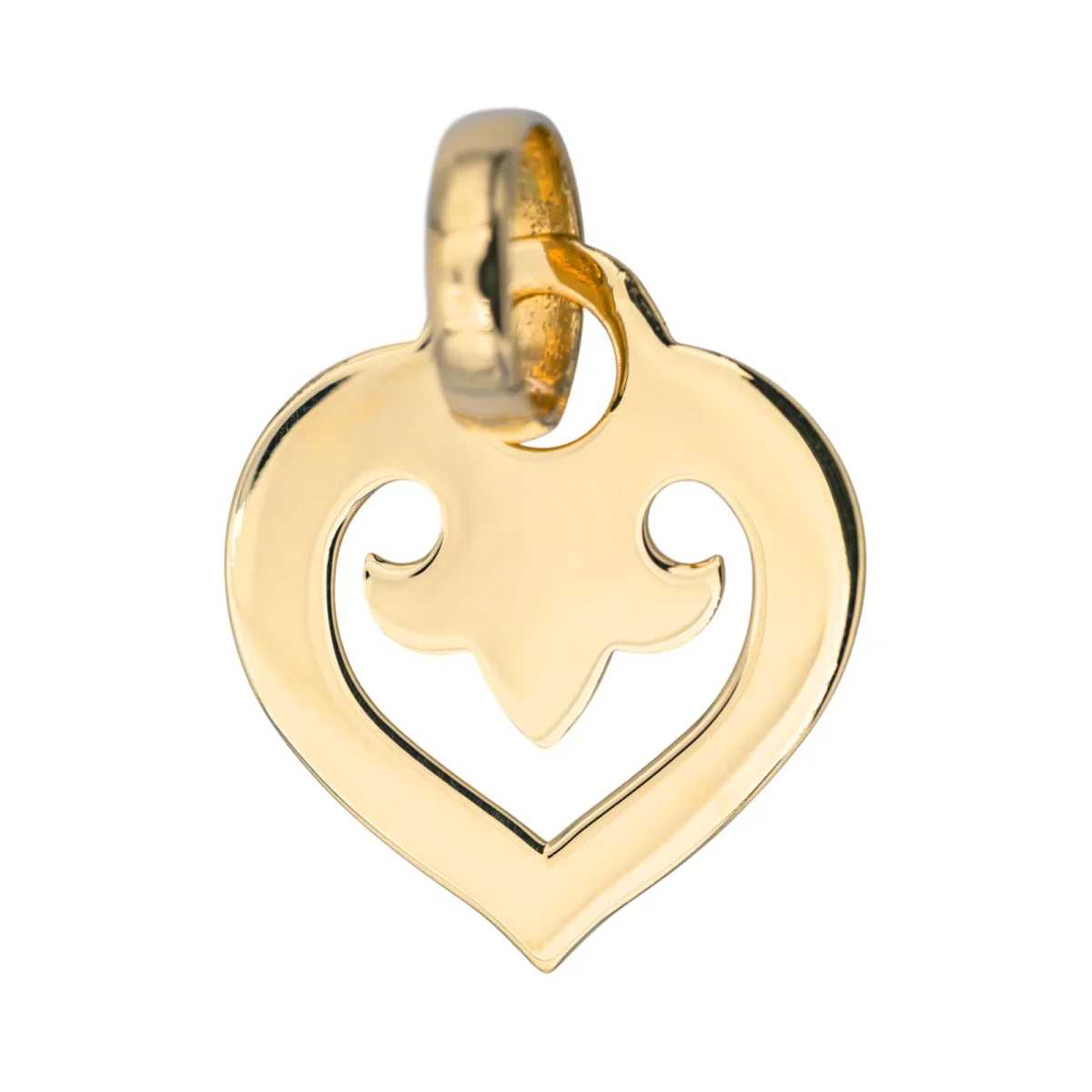 Pendentif signé de la Maison O.J Perrin en or jaune 750 millièmes (18 carats), moyen modèle Cœur Légende, dimensions avec la bélière : 3,80 cm x 2,63 cm, poids total : 5,45 g, poinçon tête d’aigle, excellent état