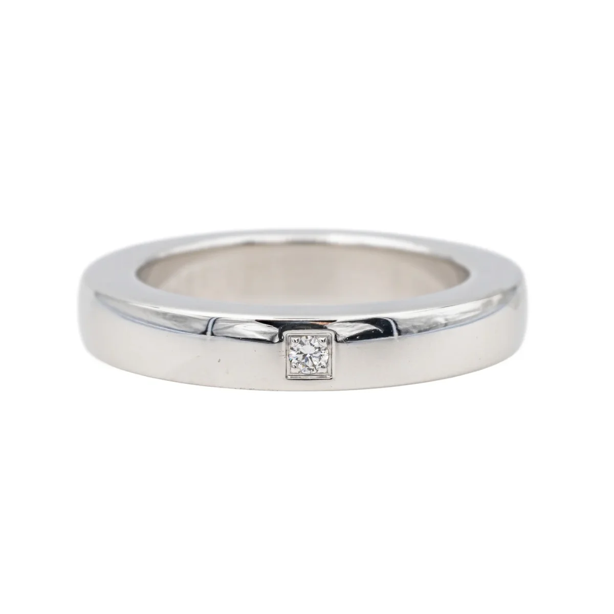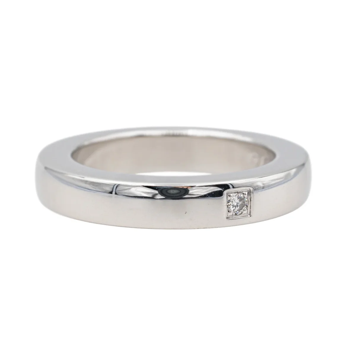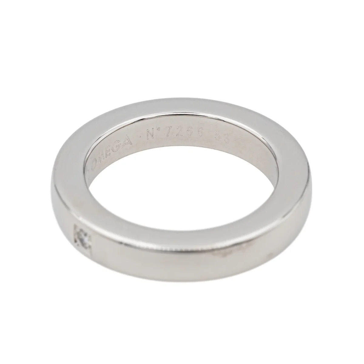 Alliance tour complet signée de la Maison Omega en or blanc 750 millièmes (18 carats), modèle Ruban confort, sertie d’un diamant taille brillant environ H-VS, poids total diamant : environ 0,02 ct, largeur sur le dessus : 0,39 cm, tour de doigt : 53, poids total : 11,53 g, poinçon tête de saint-bernard, (numérotée : 7266), excellent état