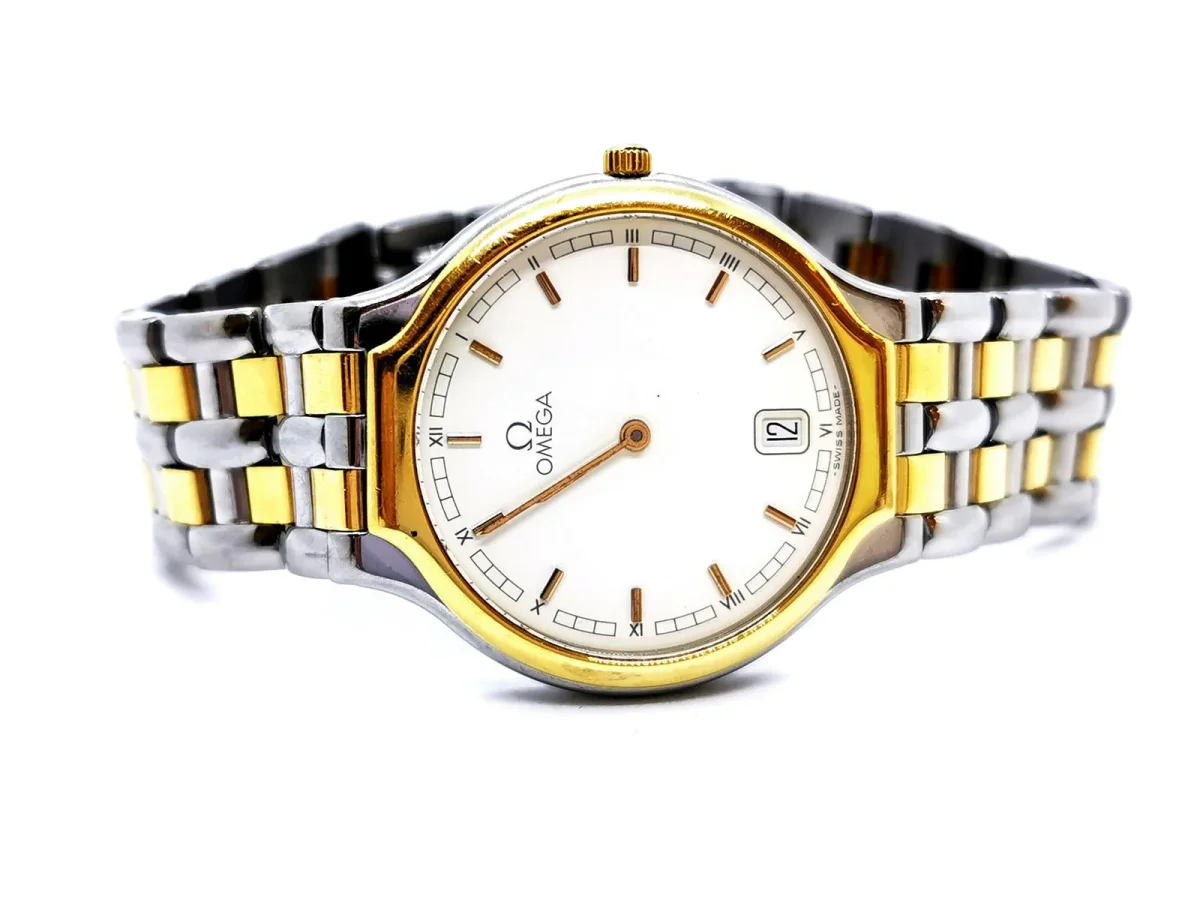 Montre signée de la maison Oméga, en acier et plaqué or jaune, modèle 1449/432, diamètre boitier 32 mm, cadran blanc, date, mouvement quartz, taille bracelet: 21 cm, largeur bracelet: 1,7 cm, récemment révisée, poids total: 71,60 g, bon état