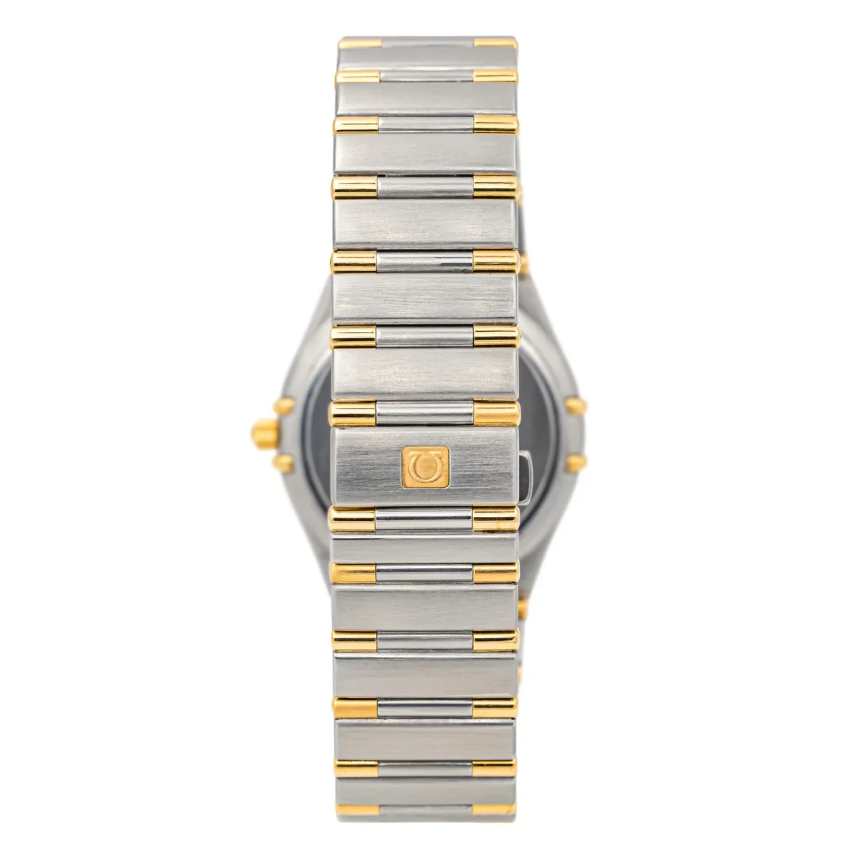 Montre Omega modèle Constellation référence 1212.10 en acier et or jaune 750 millièmes (18 carats), n°série 55930753 , cadran champagne à index bâtons, mouvement à quartz, boîtier 33 mm, verre saphir, bracelet or jaune et acier à boucle déployante (taille poignet 19,00 cm, largeur bracelet 1,80 cm), poids total : 90,64 g, années 1990-2000, révision complète et garantie 1 an, excellent état
