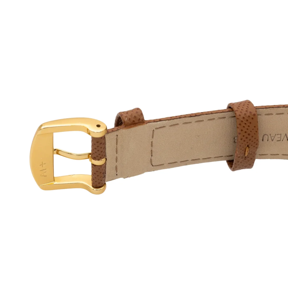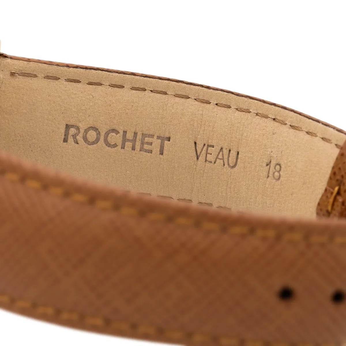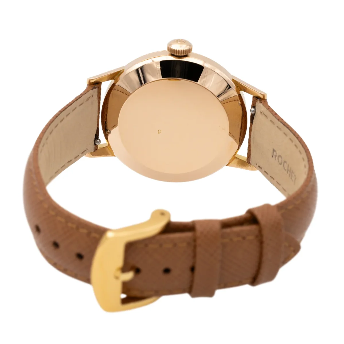 Montre Omega modèle rétro or rose 750 millièmes (18 carats), cadran blanc à index bâton, mouvement mécanique à remontage manuel, boitier 34,5 mm, verre plexiglass, bracelet cuir marron à boucle ardillon or jaune (taille poignet 21 cm, largeur bracelet 1,7 cm), poids total : 40 g, années 40/60 , poinçon tête d’aigle, excellent état