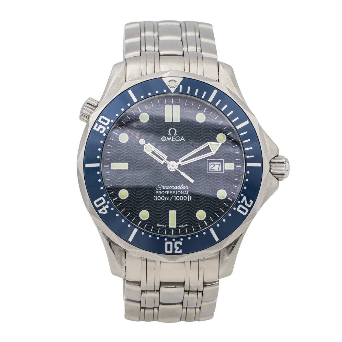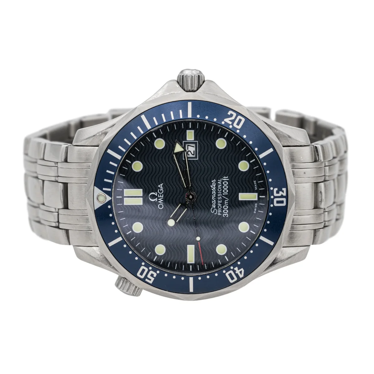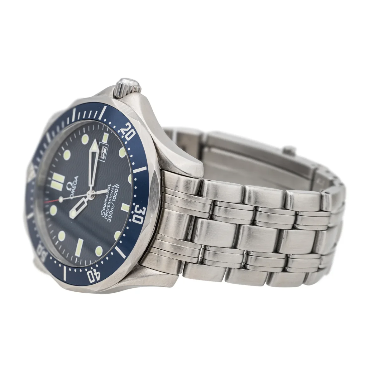 Montre Omega modèle Seamaster Diver acier, n°série 78508925 , cadran bleu à index, mouvement à quartz, boîtier 41 mm, verre saphir, bracelet acier boucle déployante avec rallonge plongeur (taille poignet 18,50 cm, largeur bracelet 20 cm), poids total : 141,44 g, papiers d’origine et boite SAV, années 2000, révision complète, excellent état