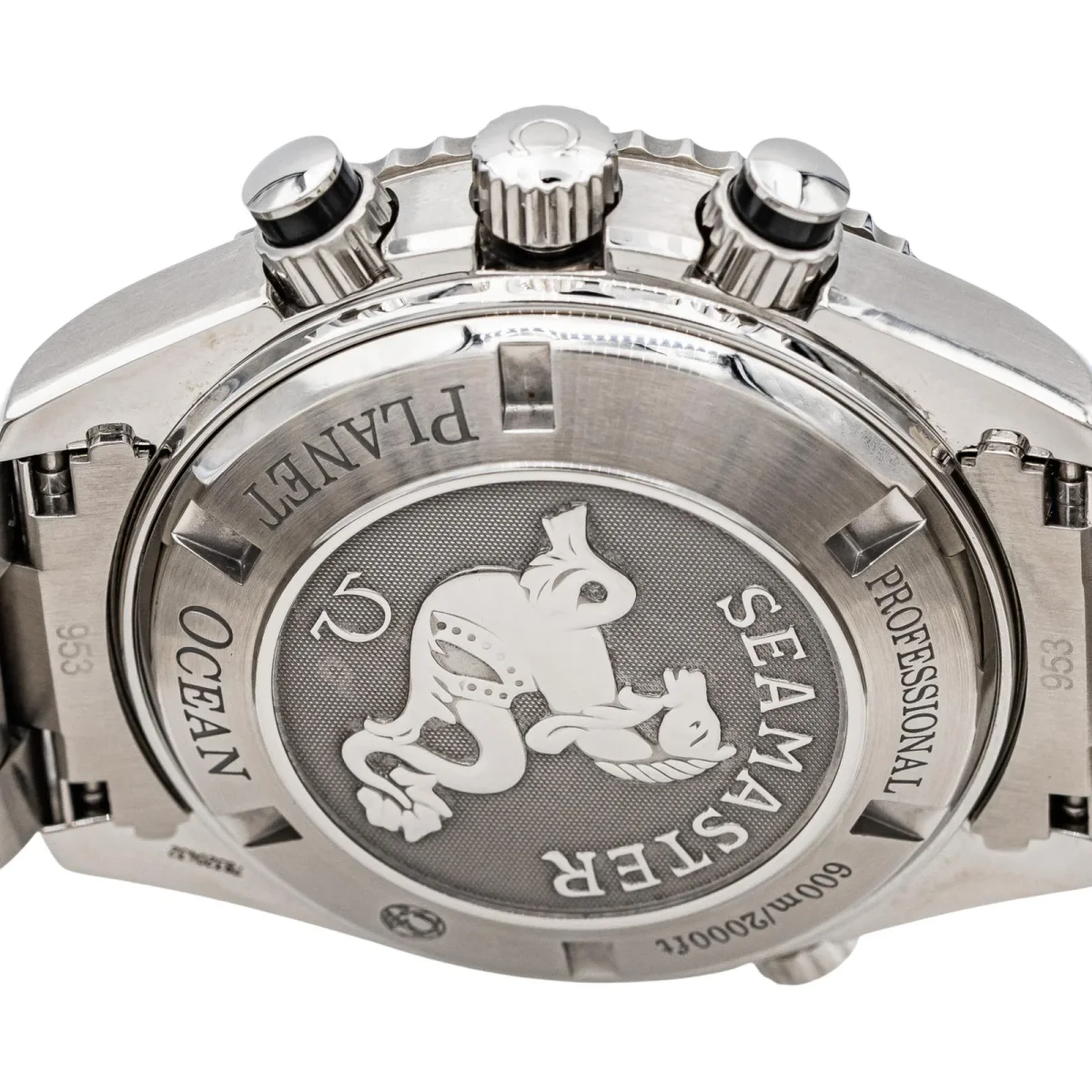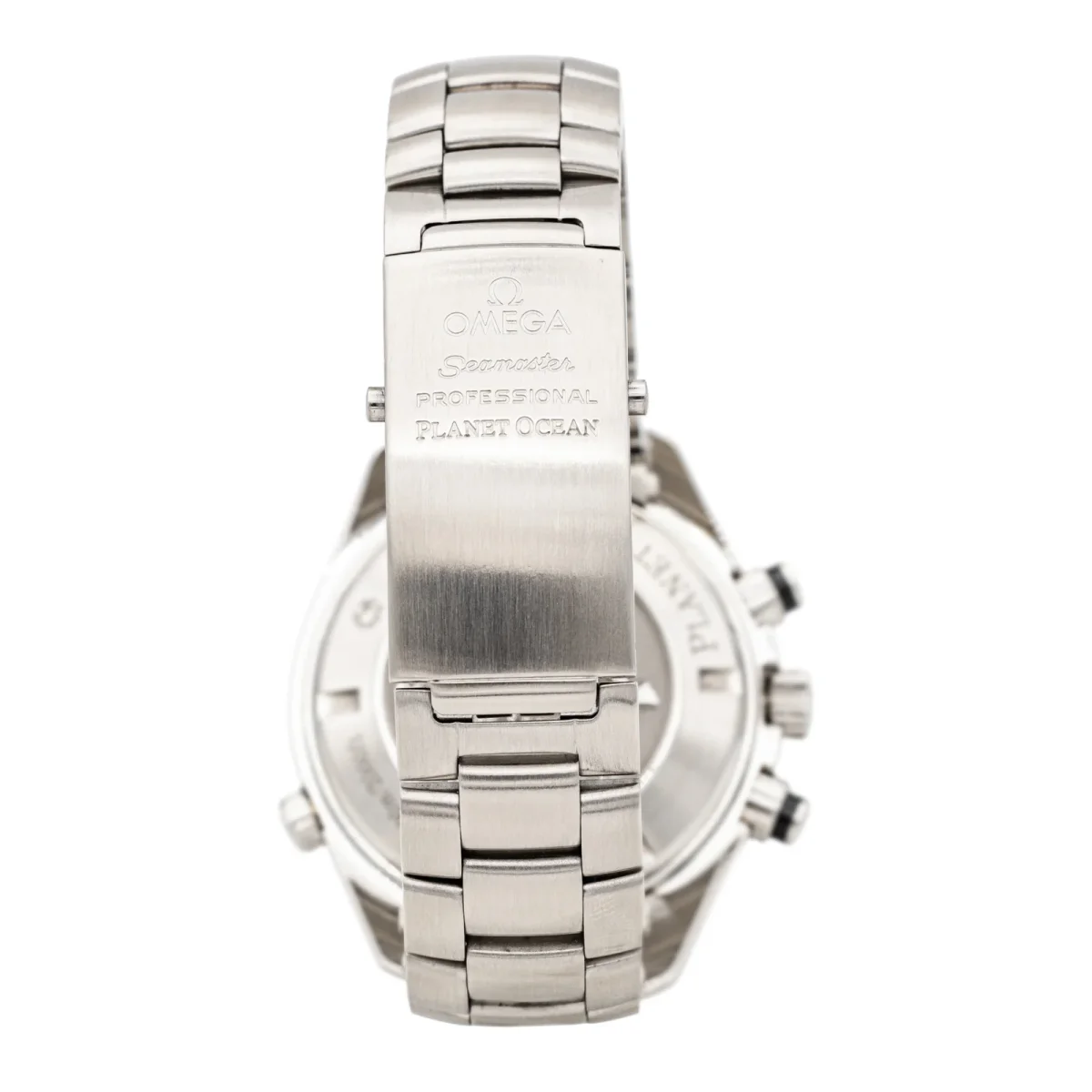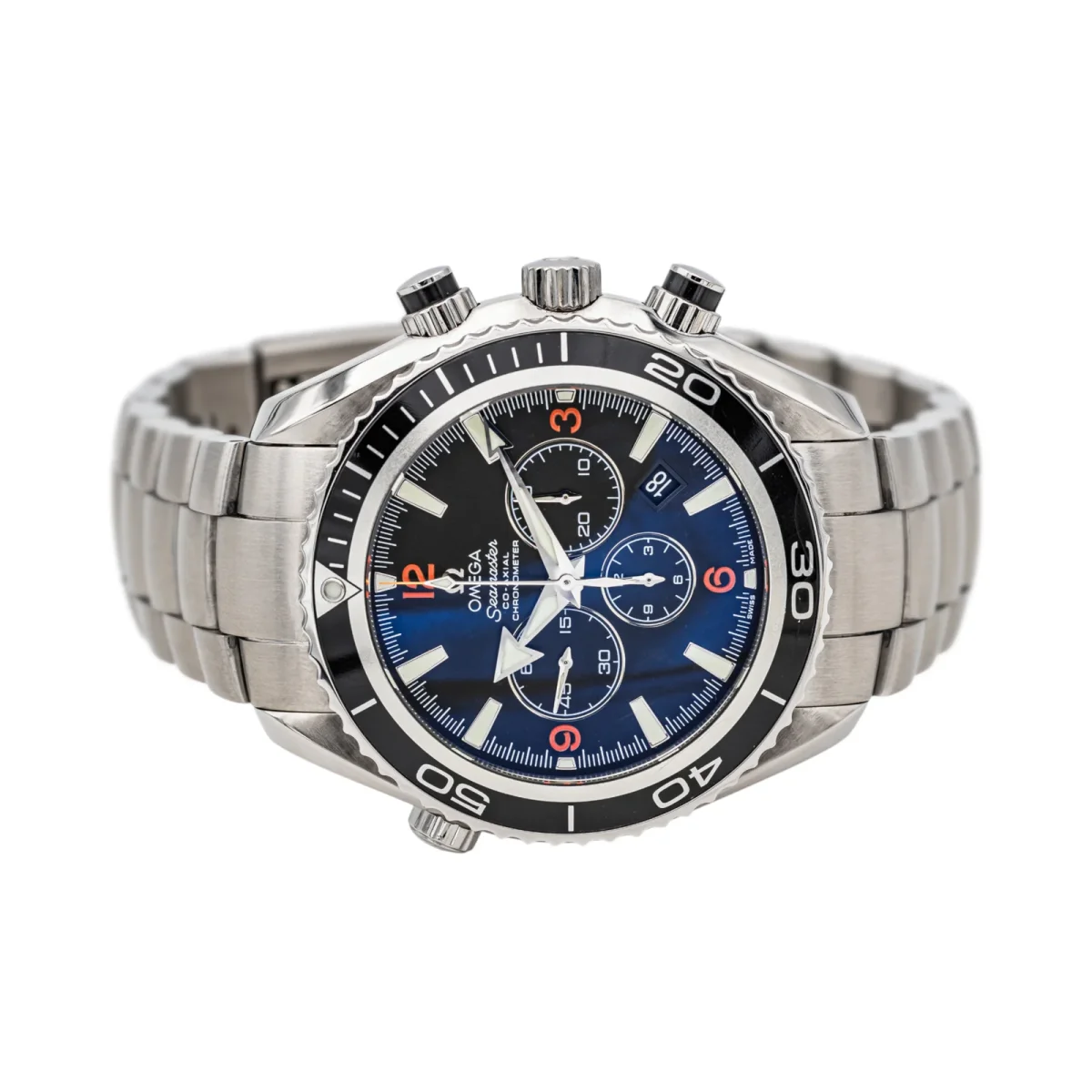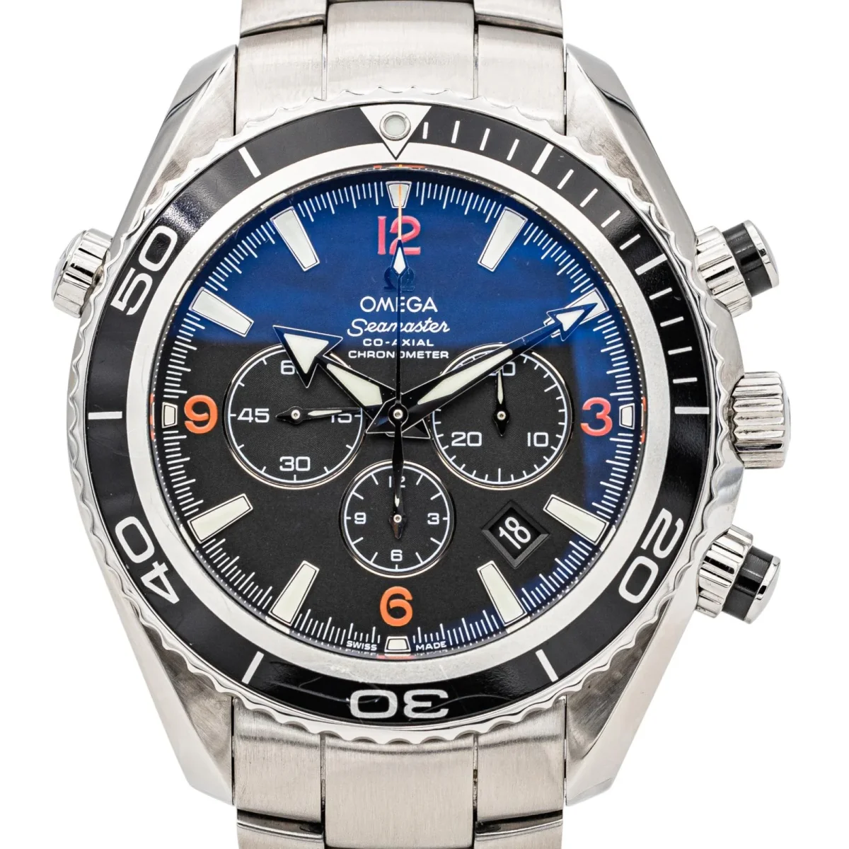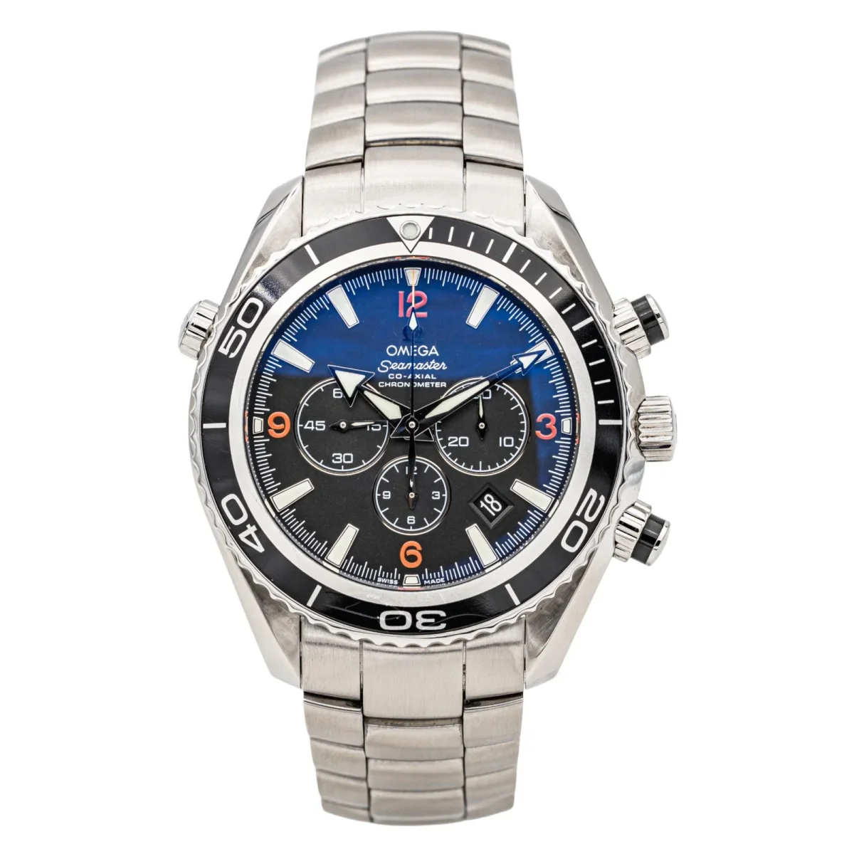 Montre homme, signée de la Maison Omega, modèle Seamaster planet Ocean, Chronometre, en acier, boîtier 45 mm, automatique, date, cadran noir, boucle déployante, taille poignet: 22,5 cm, largeur bracelet 2,03 cm, poids total : 250,60 g, full set boîte et papiers, révisée, excellent état