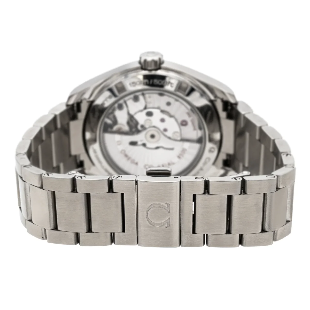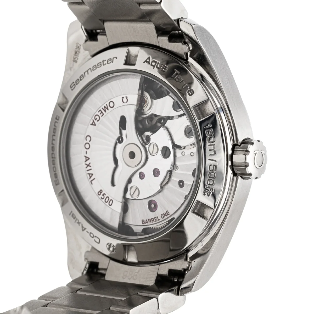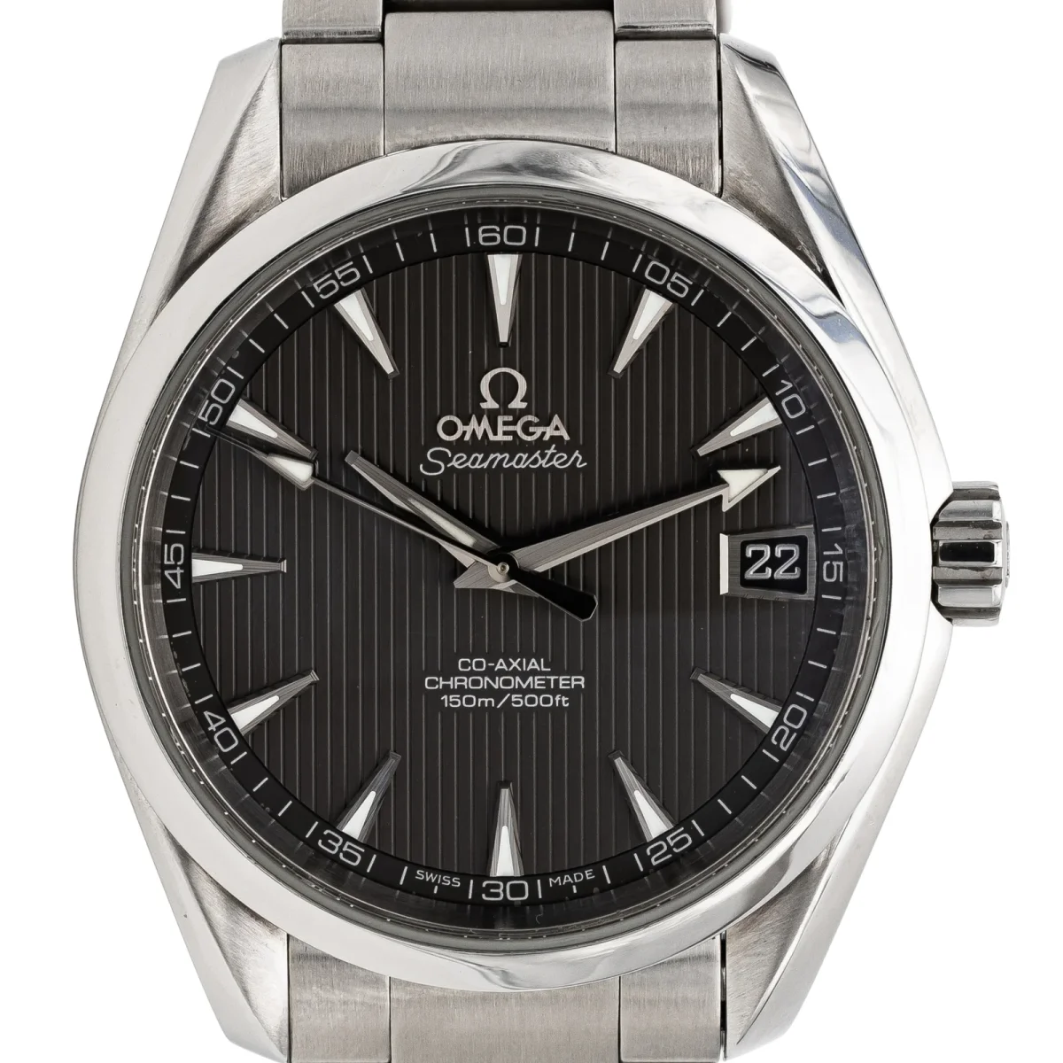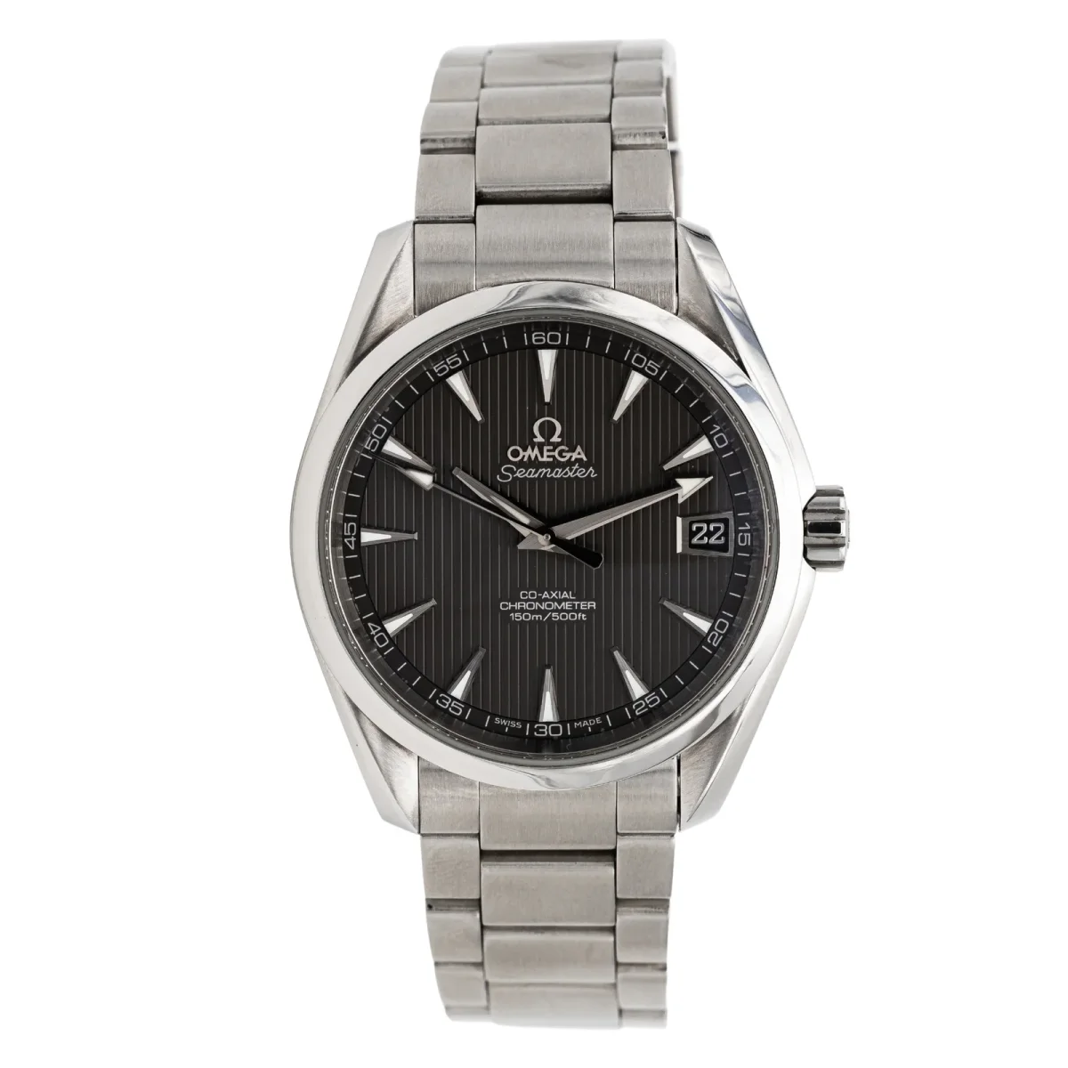 Montre Omega, modèle Seamaster Aqua Terra de 2012, en acier, numérotée 85115182, mouvement mécanique à remontage automatique, cadran gris anthracite, à index triangulaire,date à trois heures, boucle papillon, longeur du bracelet: 19,50 cm, diamètre boitier: 38,00 mm, révisée récemment, excellent état