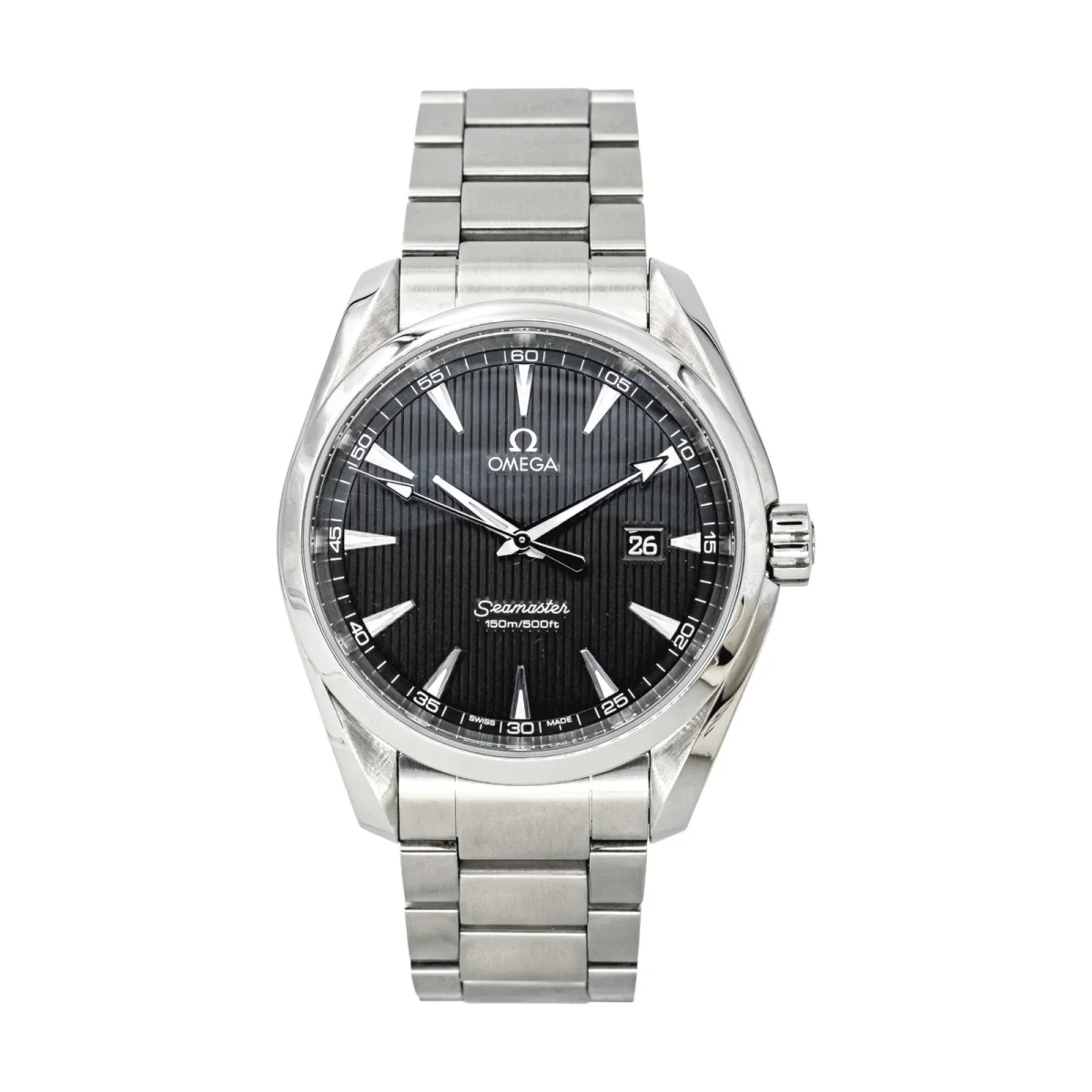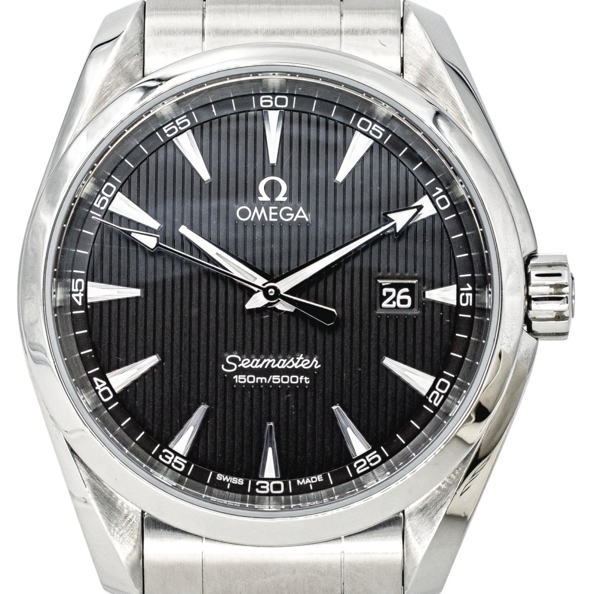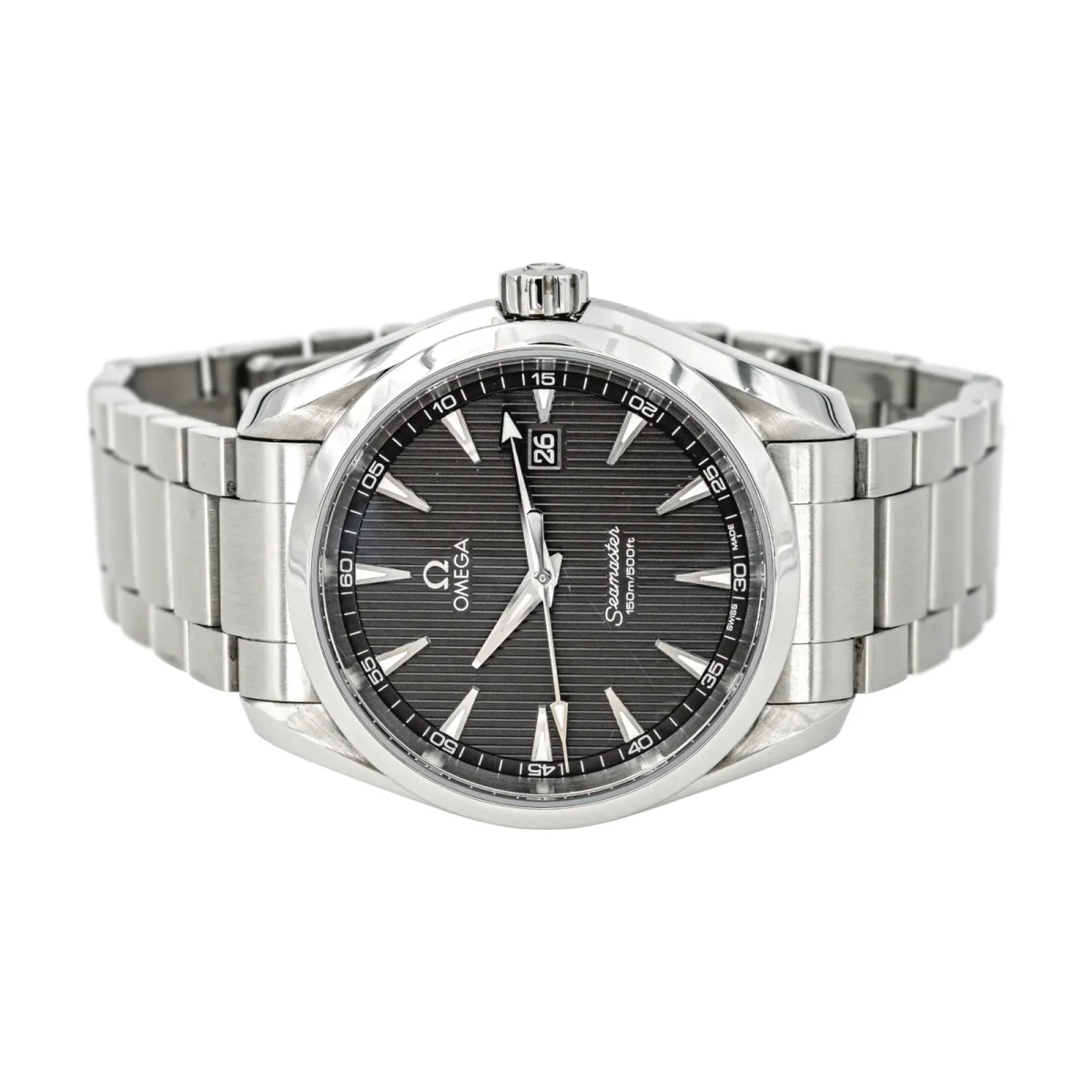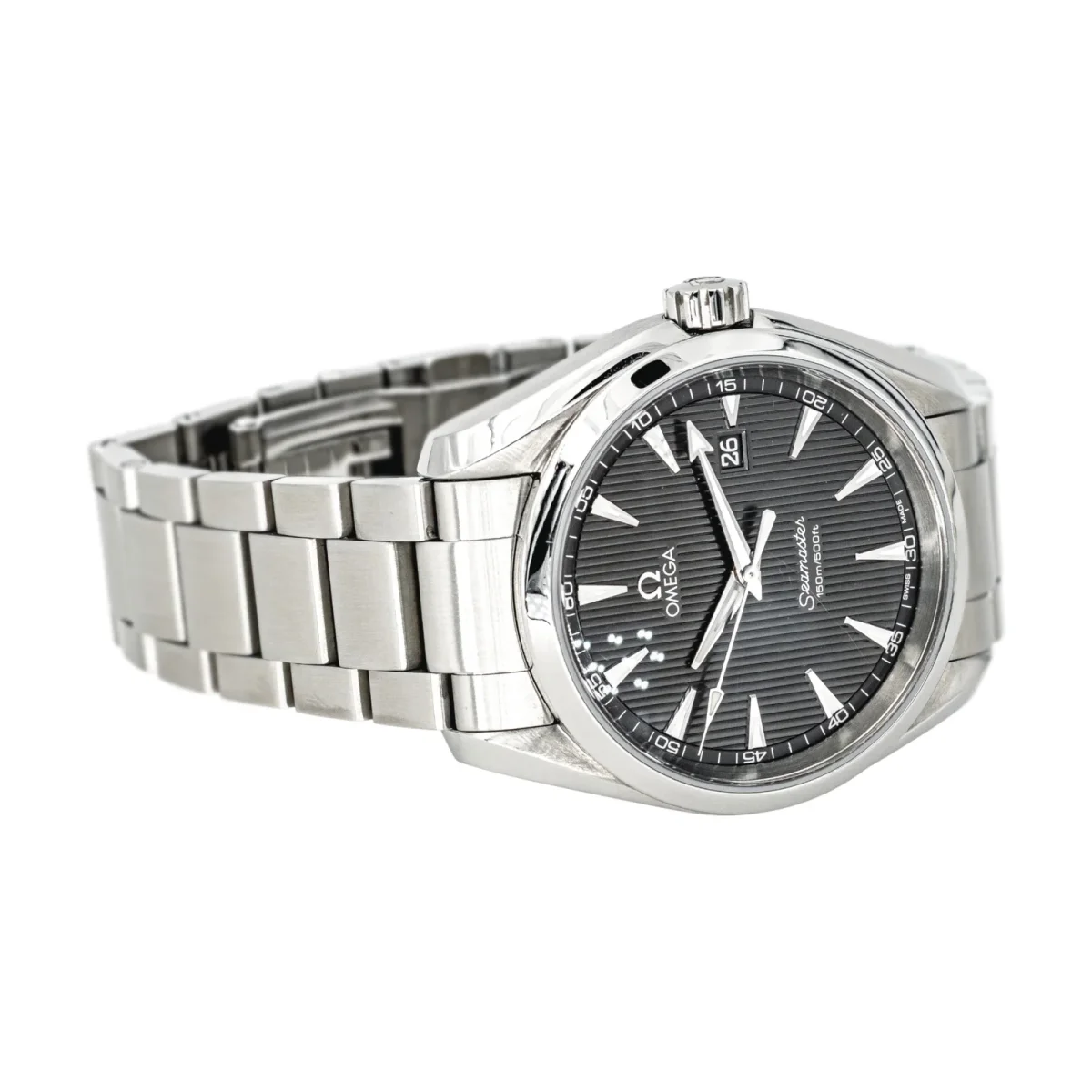 Montre Omega modèle Seamaster Aqua Terra, en acier, cadran gris à index bâton, mouvement à quartz, boîtier 37 mm, verre saphir, bracelet acier à boucle papillon (taille poignet 21,5 cm, largeur bracelet 1,8 cm), réf 231.10.39.61.06.001, n°série 91605365, poids total : 135,180 g, années 2010, révision complète et garantie 1 an, excellent état