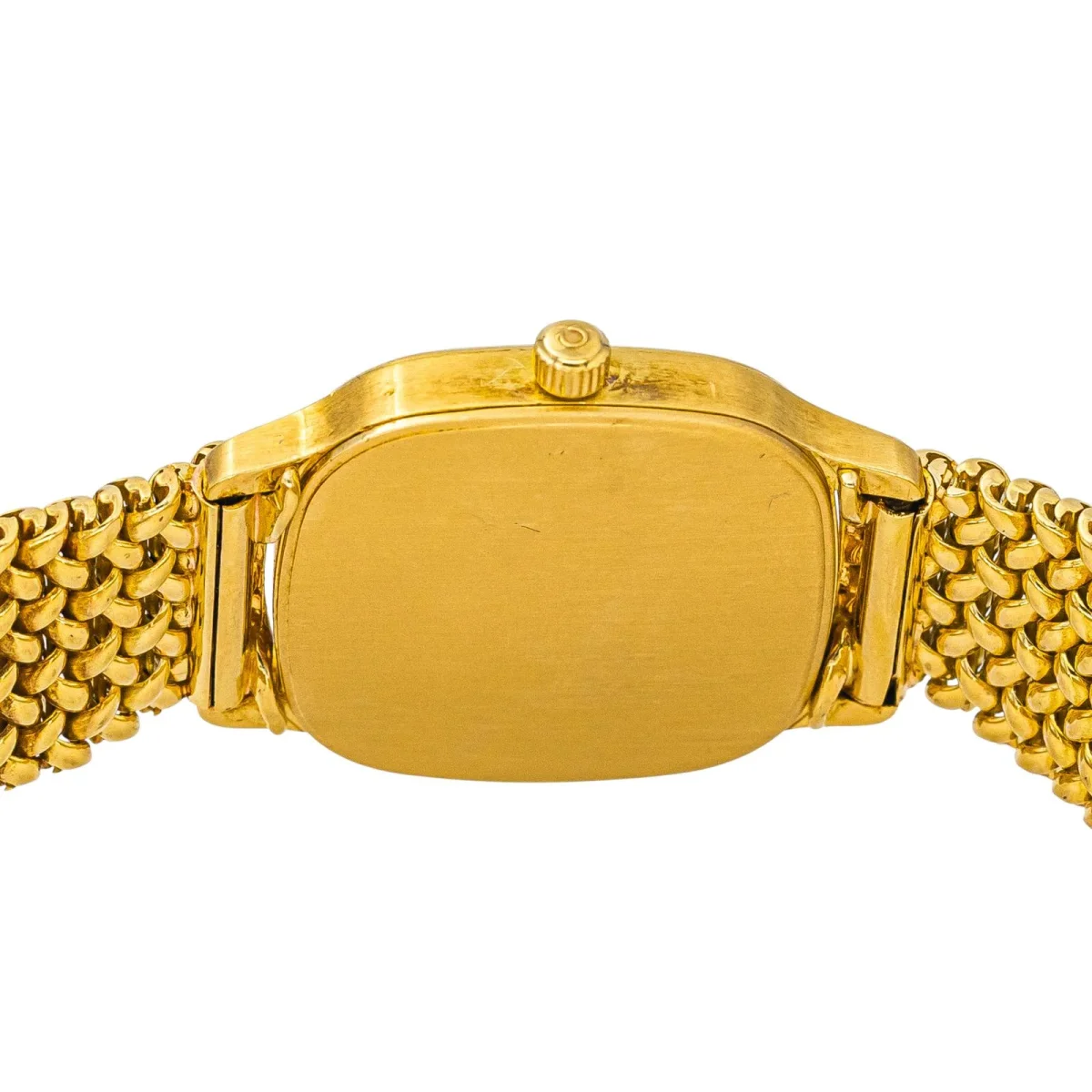 Montre Omega modèle Seamaster or jaune 750 millièmes (18 carats), cadran champagne à index bâton, mouvement à quartz, boîtier 22 mm, verre saphir, bracelet or jaune à fermoir (taille poignet 16 cm, largeur bracelet 1,29 cm), poids total : 52,07g, années 1980, révision complète et garantie 1 an, excellent état