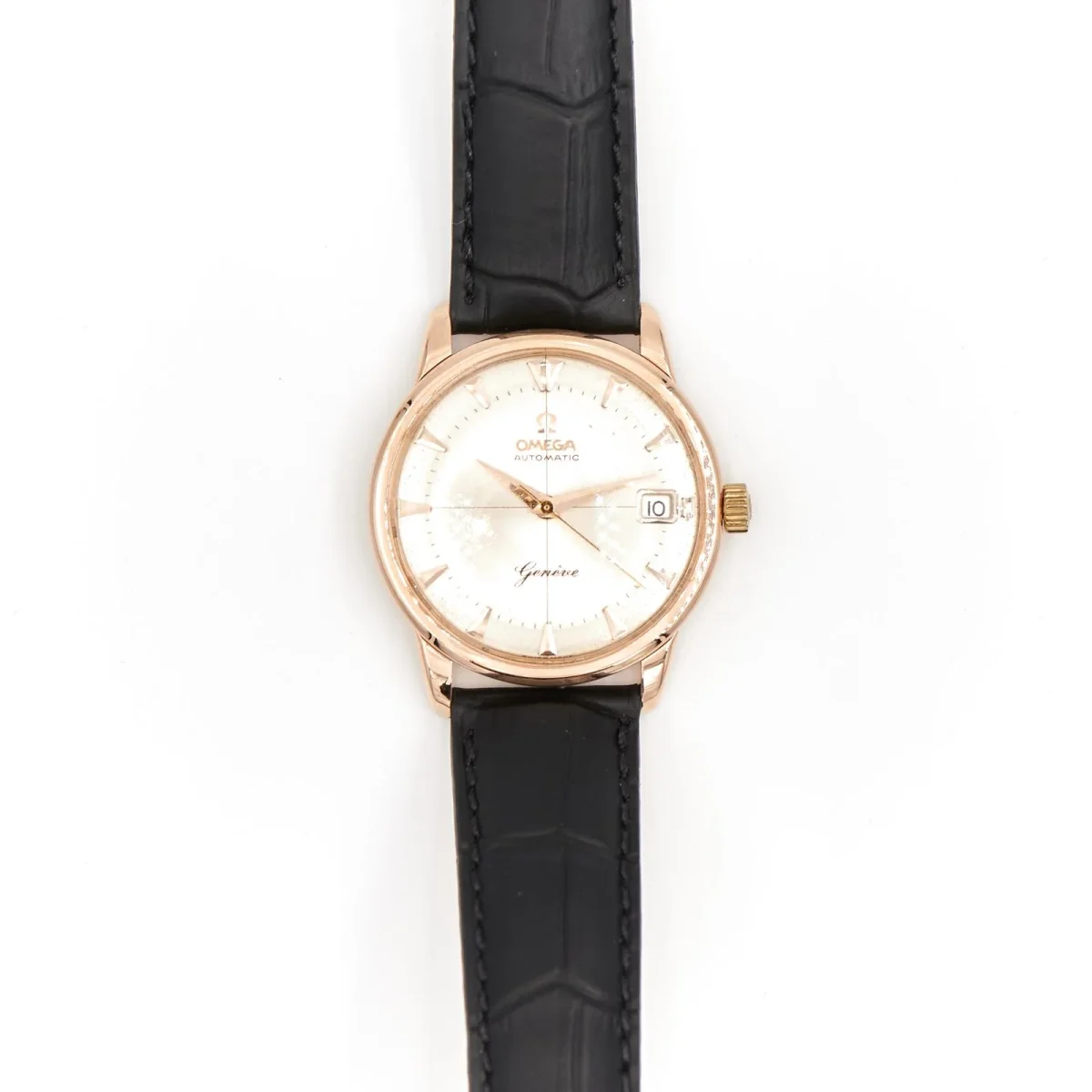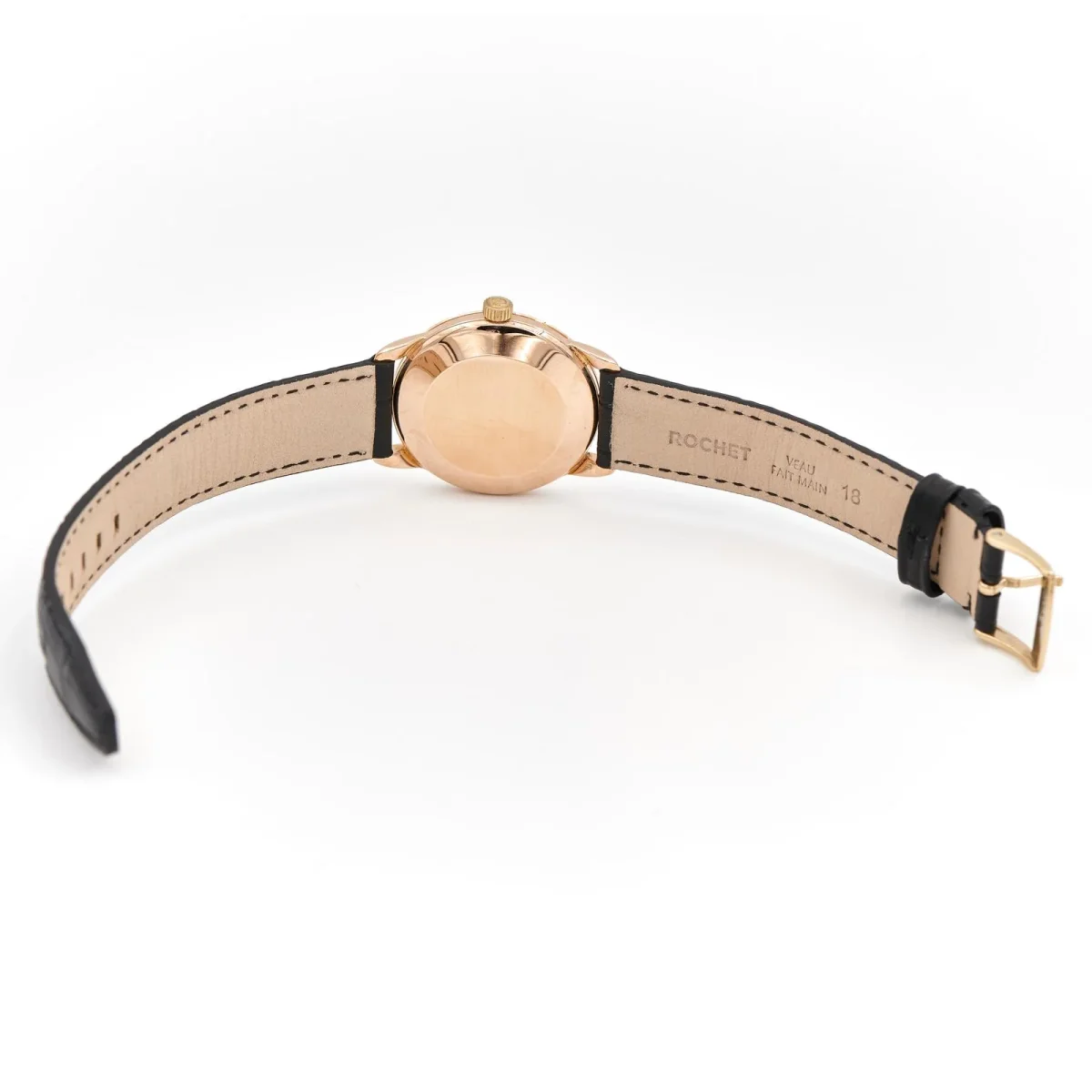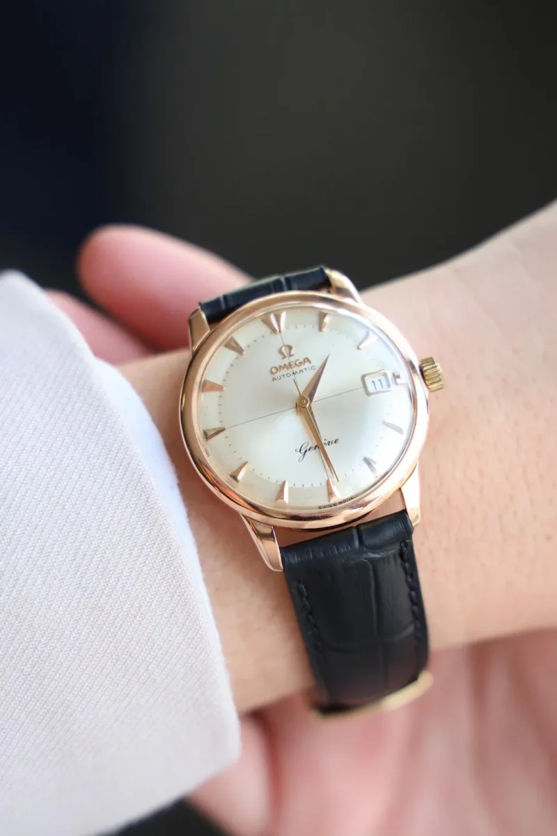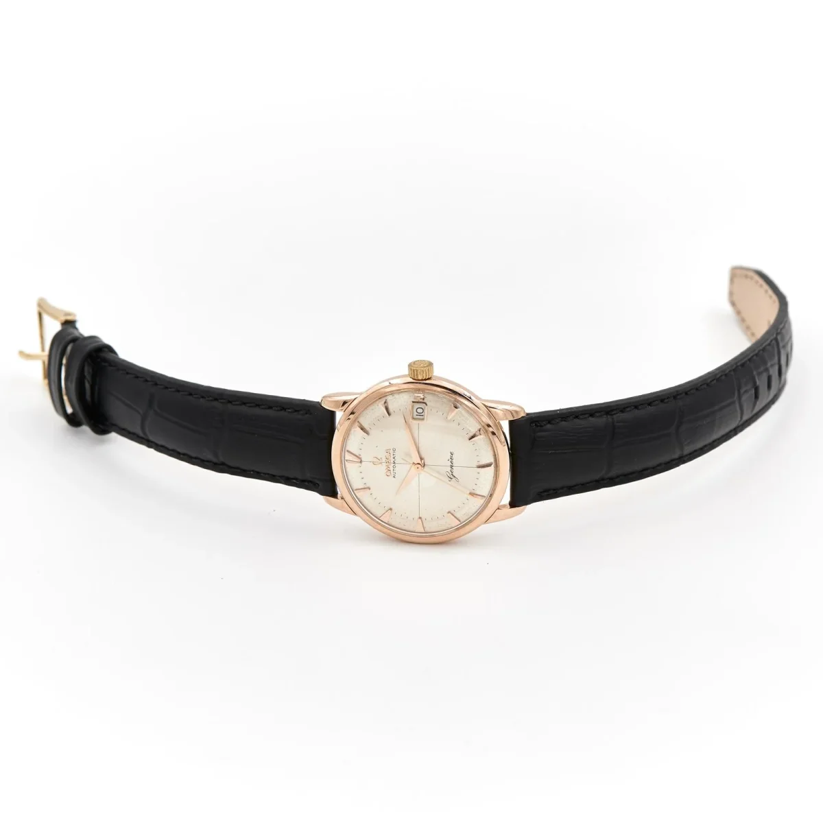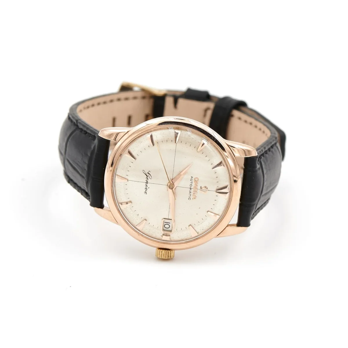 Montre Oméga en or rose 750 millièmes (18 carats) testé, Modèle Seamaster des années 60, Mouvement automatique, bracelet en cuir de crocodile noir, Dimensions du cadran: 4,00 x 3,62 x 0,95 cm, Longueur du bracelet : 23 cm, Poids total: 41,28 g, Excellent état