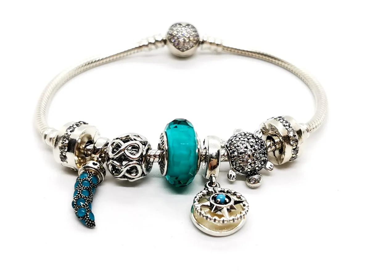 Bracelet signé Pandora, en argent 925 millièmes, Bracelet Maille Serpent Fermoir Cœur Scintillant, deux charms Clip Rangée Scintillante, Incolore, charm corne d’abondance turquoise, Charm Infini Ajouré, Charm Verre de Murano turquoise Facetté, charm follow your dream, Charm Tortue Marine Pavé, longueur bracelet: 20 cm, largeur bracelet: 0,3 cm, poids total: 35,74 g, excellent état