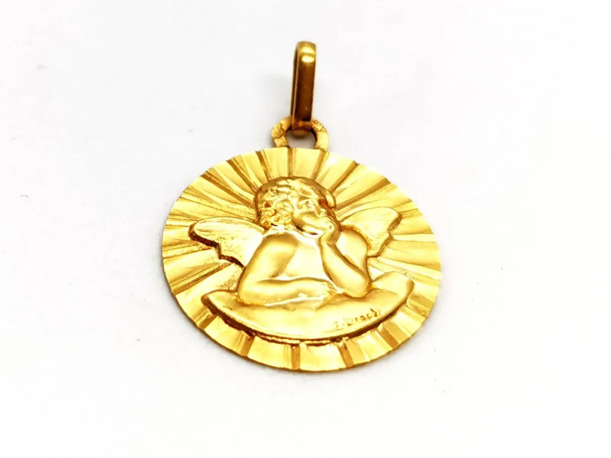 Pendentif médaille ange, en or jaune 750 millièmes (18 carats), médaille ronde, figure ange, diamètre: 1,68 cm, hauteur (bélière incluse): 2,48 cm, poids total: 1,37 g, poinçon tête d’aigle, état neuf