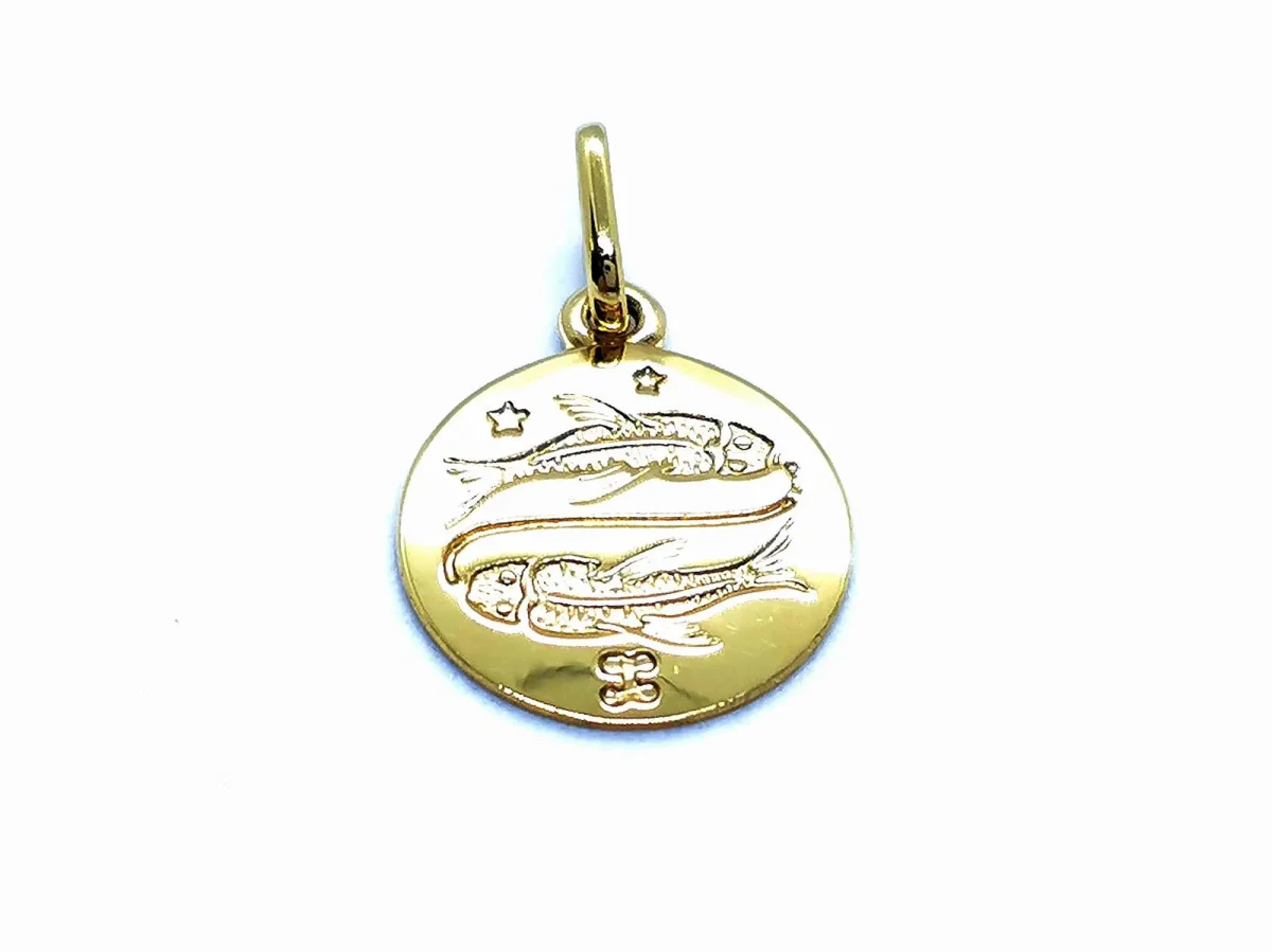 Pendentif signe astrologique, en or jaune 750 millièmes (18 carats) testé, médaille ronde, représentant le signe du poisson, dimensions: 1,35 cm x 1,35 cm, poids total: 1,67 g, état neuf