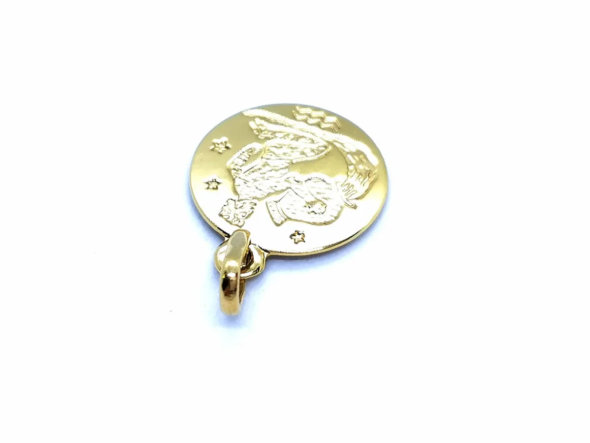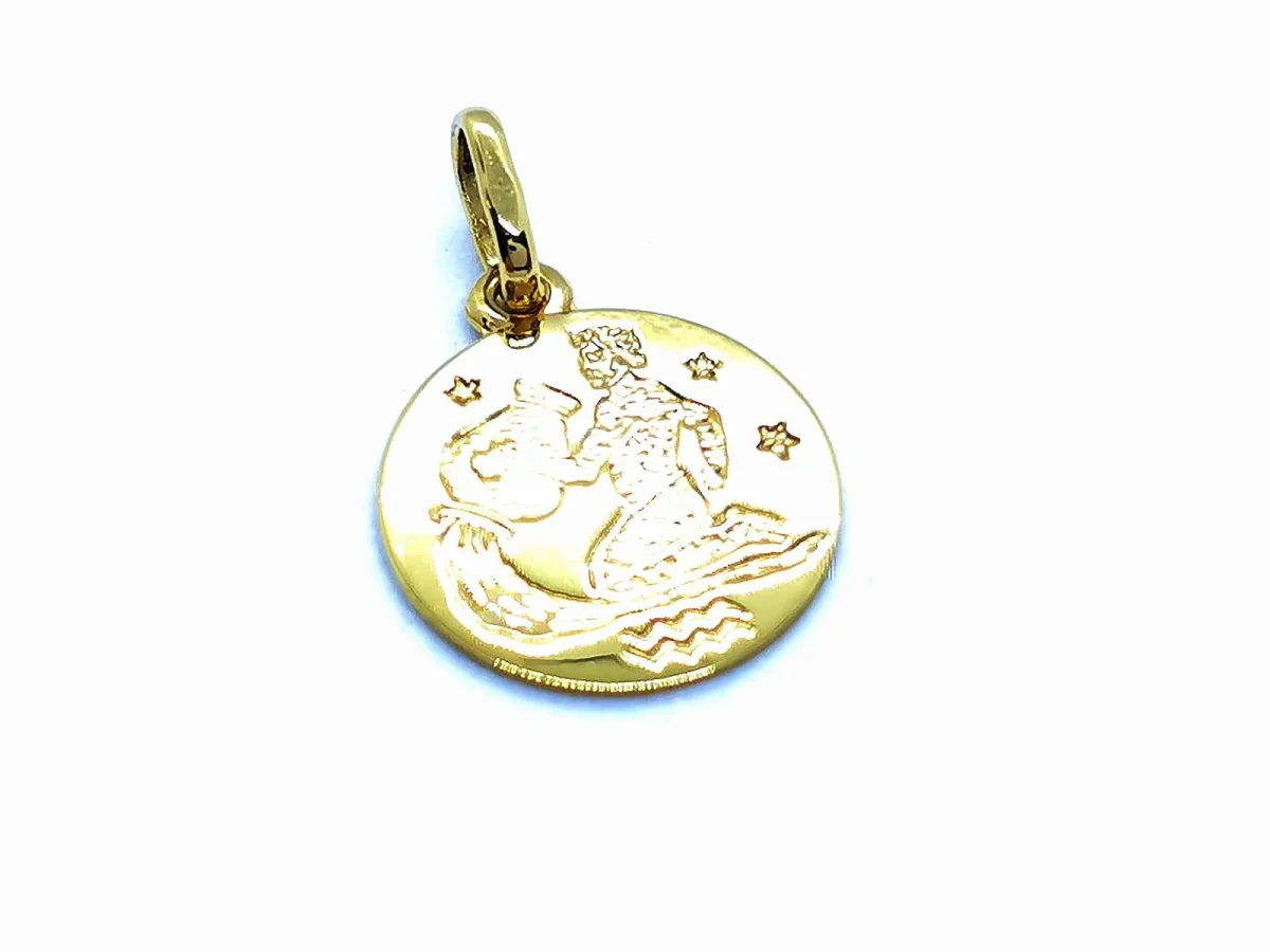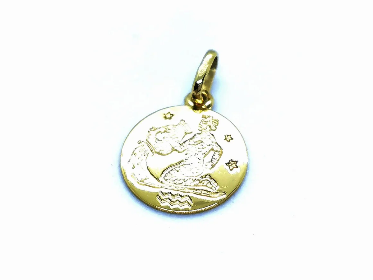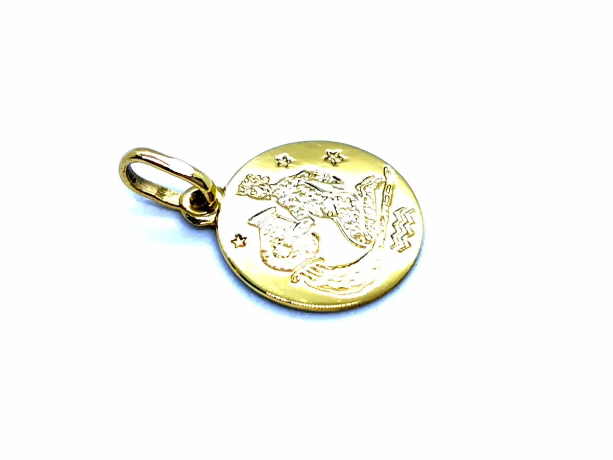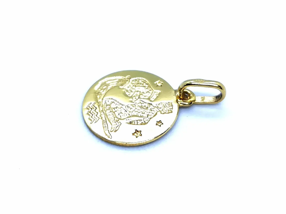 Pendentif signe astrologique, en or jaune 750 millièmes (18 carats) testé, médaille ronde, représentant le signe du verseau, dimensions: 1,35 cm x 1,35 cm, poids total: 1,72 g, état neuf