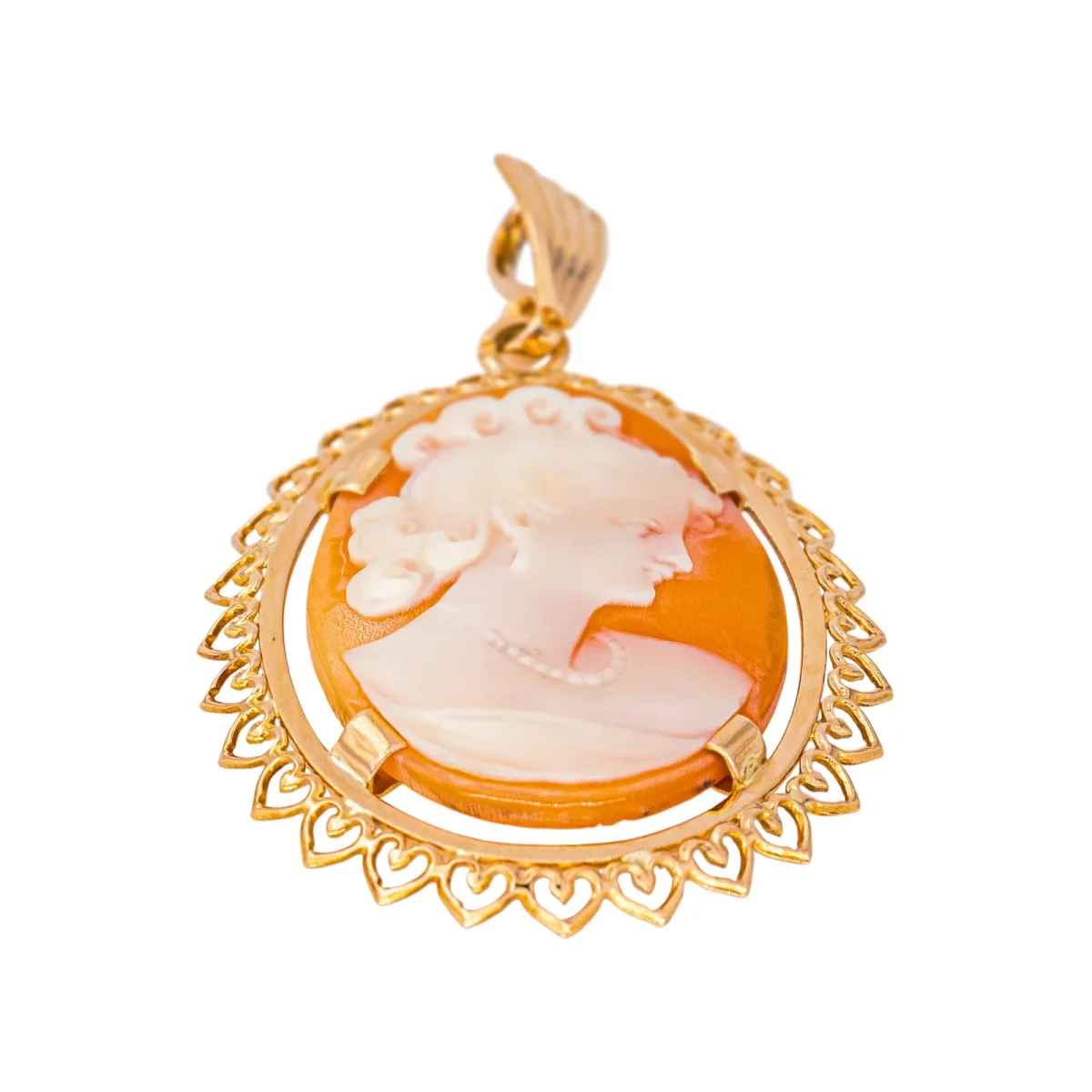 Pendentif camée, en or jaune 750 millièmes (18 carats), composé d’un pendentif ovale aux bords ajourés, retenant un camée de femme, coquille, dimensions du camée : 2,46 cm X 1,89 cm, dimension du pendentif (avec bélière): 4,59 cm X 2,73 cm, poids: 4,31 g, poinçon tête d’aigle, excellent état.