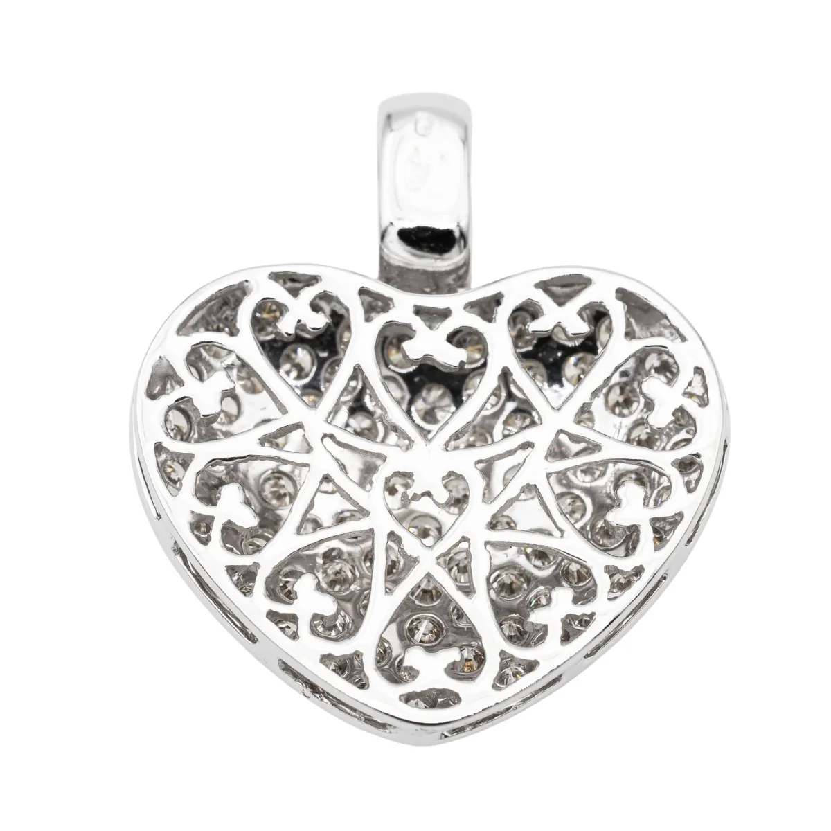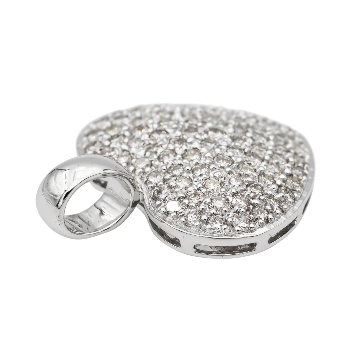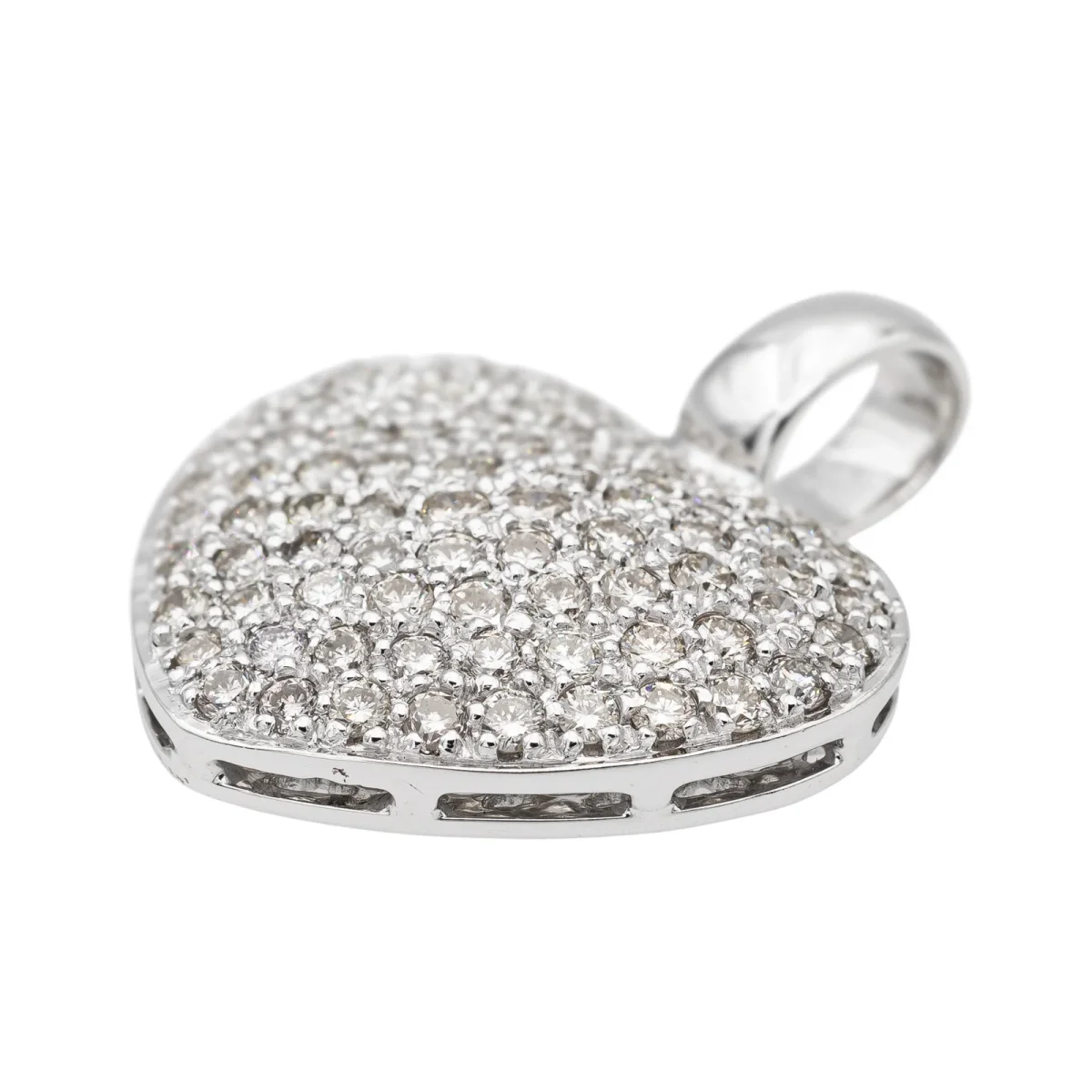 Pendentif coeur serti de diamants, en or blanc 750 millièmes (18 carats), envrion 73 diamants H-VS taille brillant, d’un poids total d’environ 1,095 cts, (chaque diamant d’un poids d’environ 0,015 ct), dimensions avec la bélière: 2,43 cm x 2,05 cm, poids total: 4,24 g, poinçon hibou, excellent état